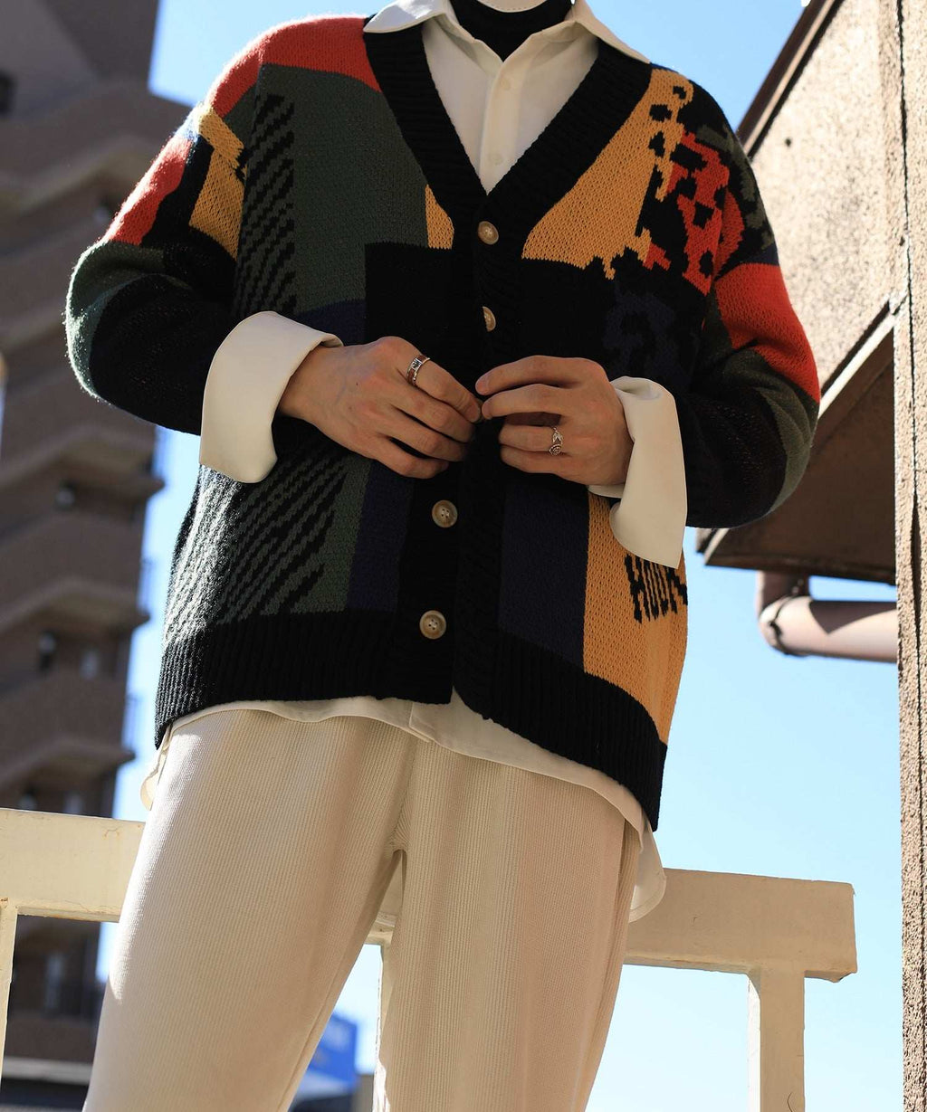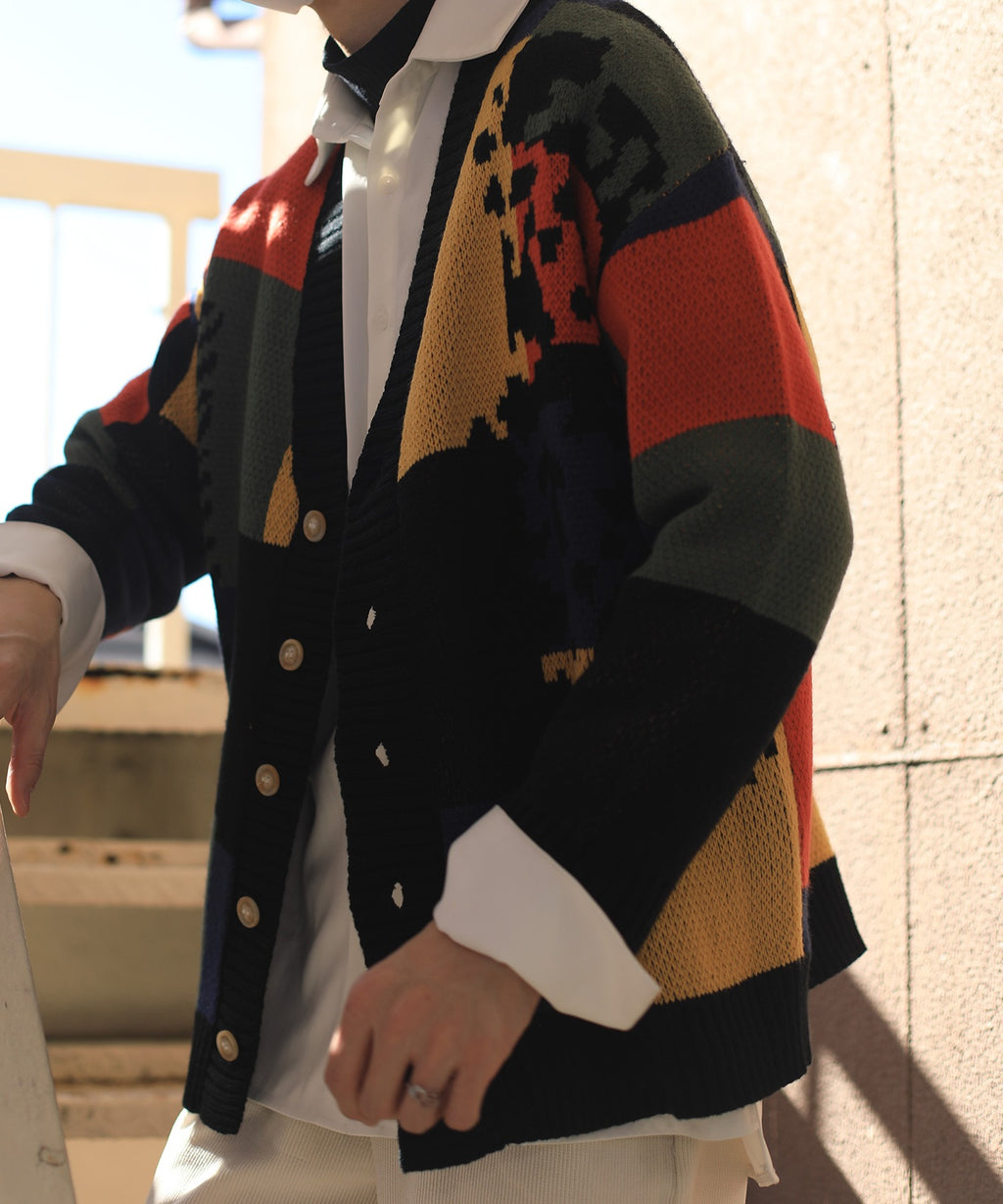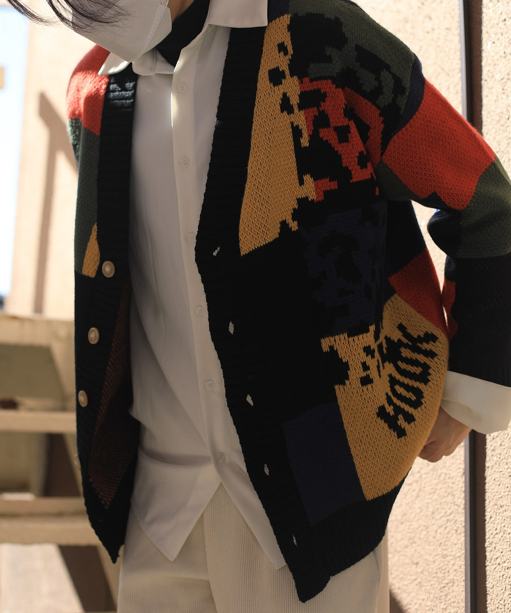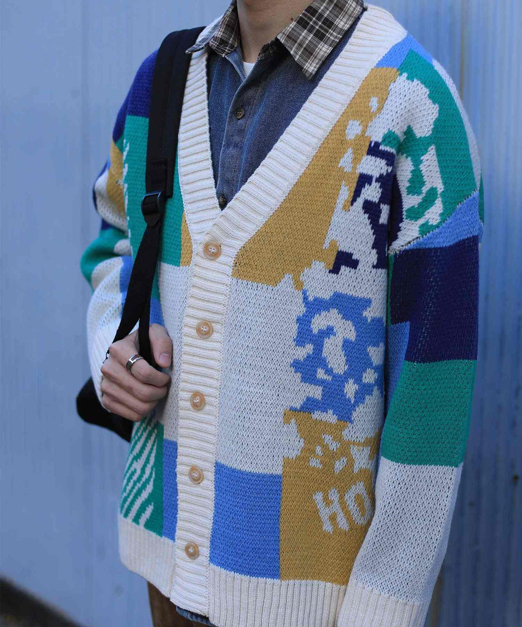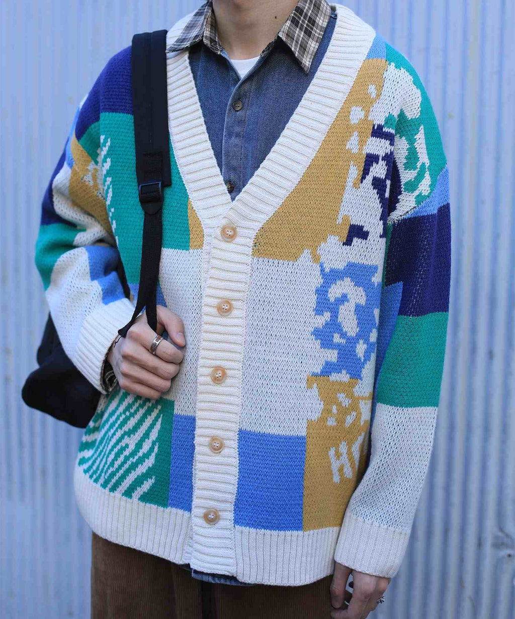 フック HOOK 【HOOK】ーoriginalー レトロ調アニマル・配色パッチワークニットカーディガン