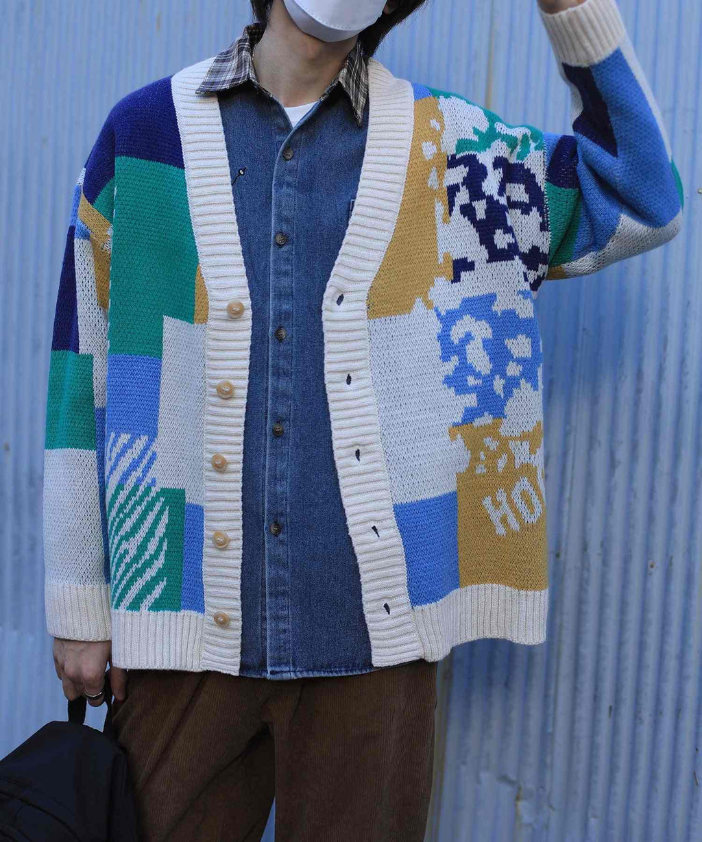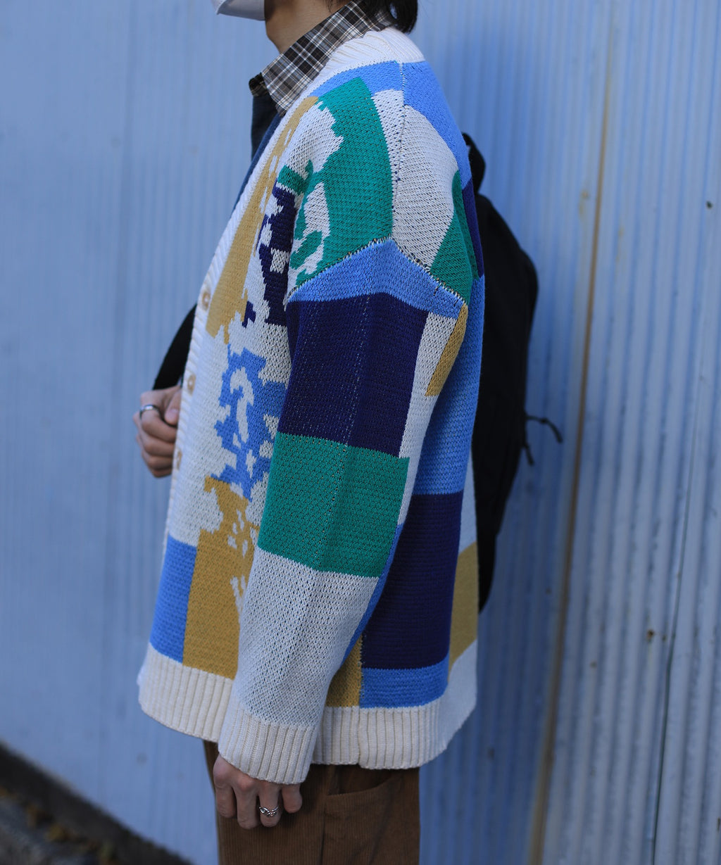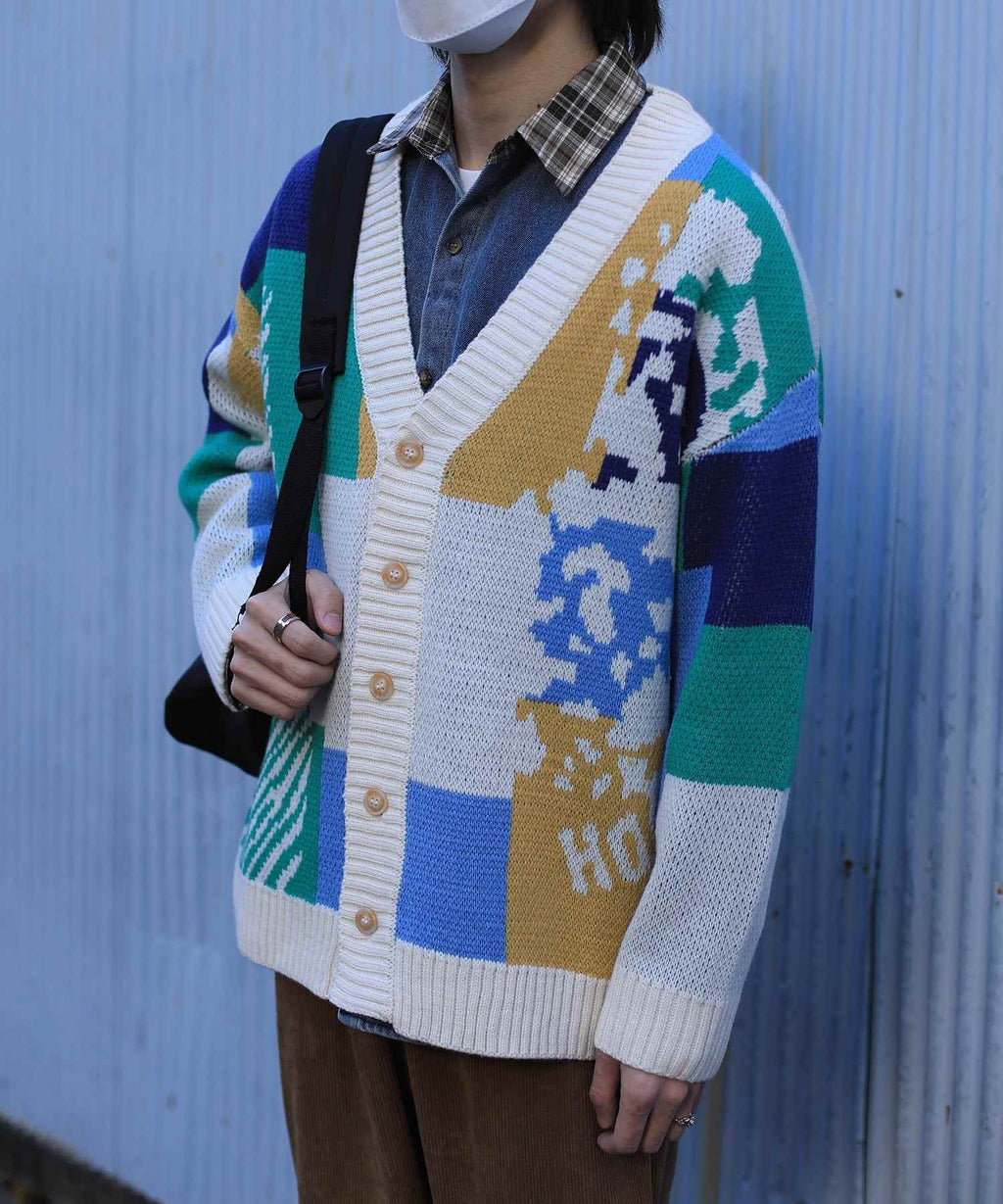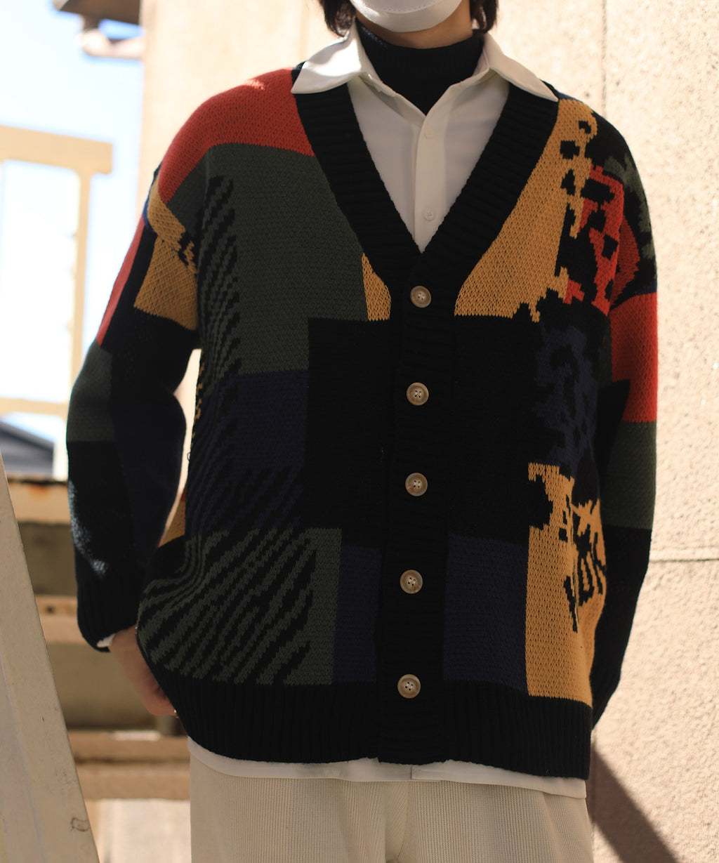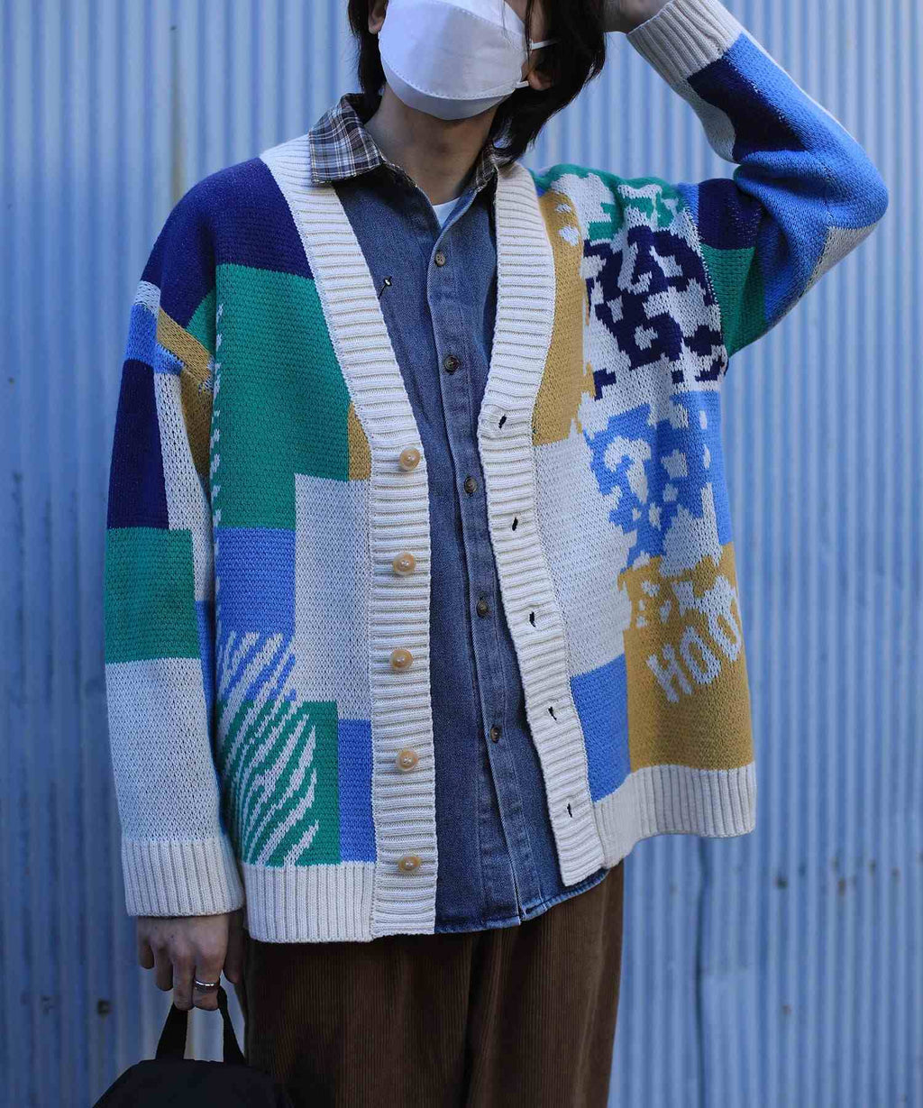 フック HOOK 【HOOK】ーoriginalー レトロ調アニマル・配色パッチワークニットカーディガン