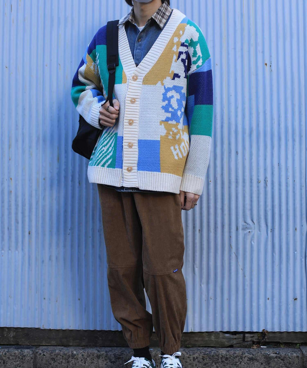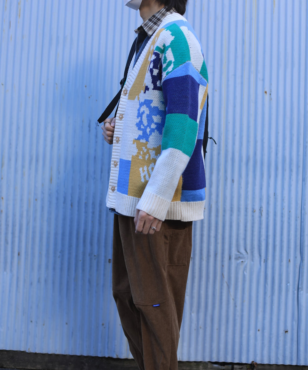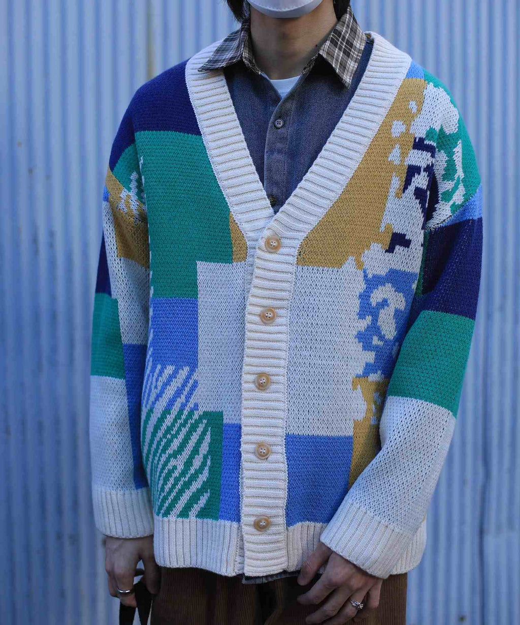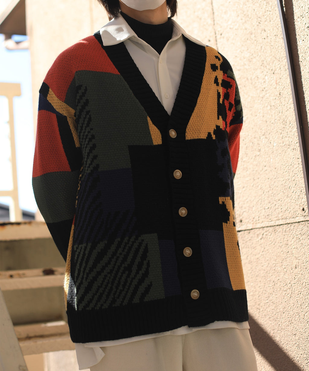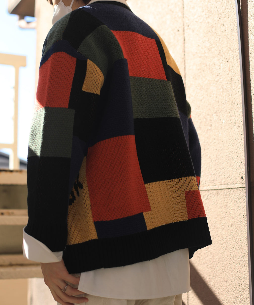 フック HOOK 【HOOK】ーoriginalー レトロ調アニマル・配色パッチワークニットカーディガン