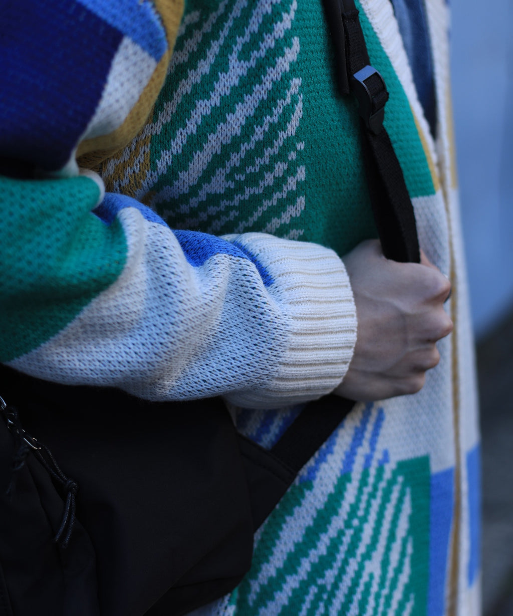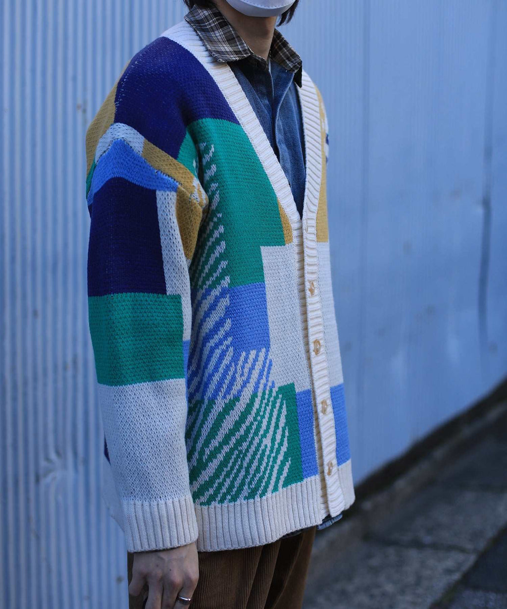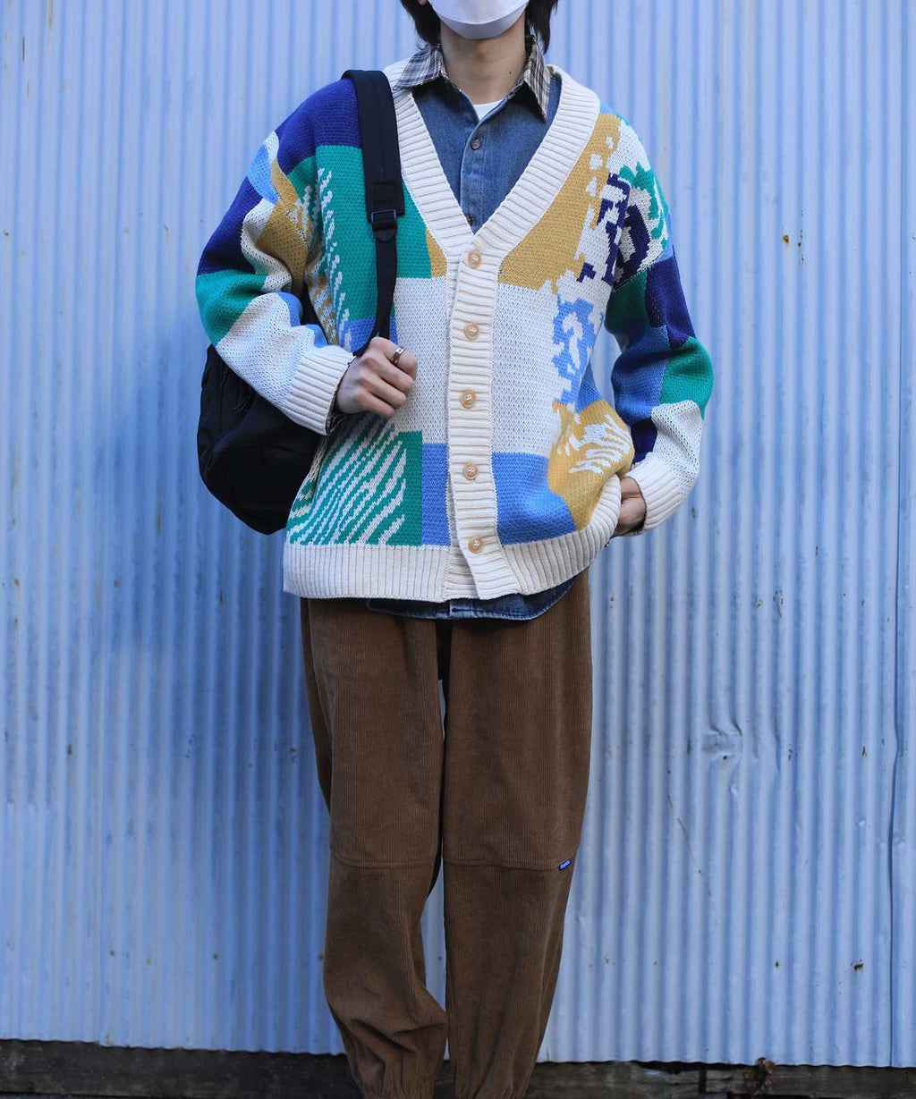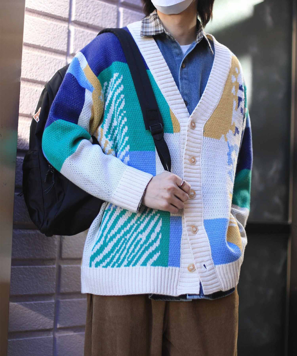 レトロ調のカラフルな色使いが視線を集めるアニマル柄ニットカーディガンが登場。
