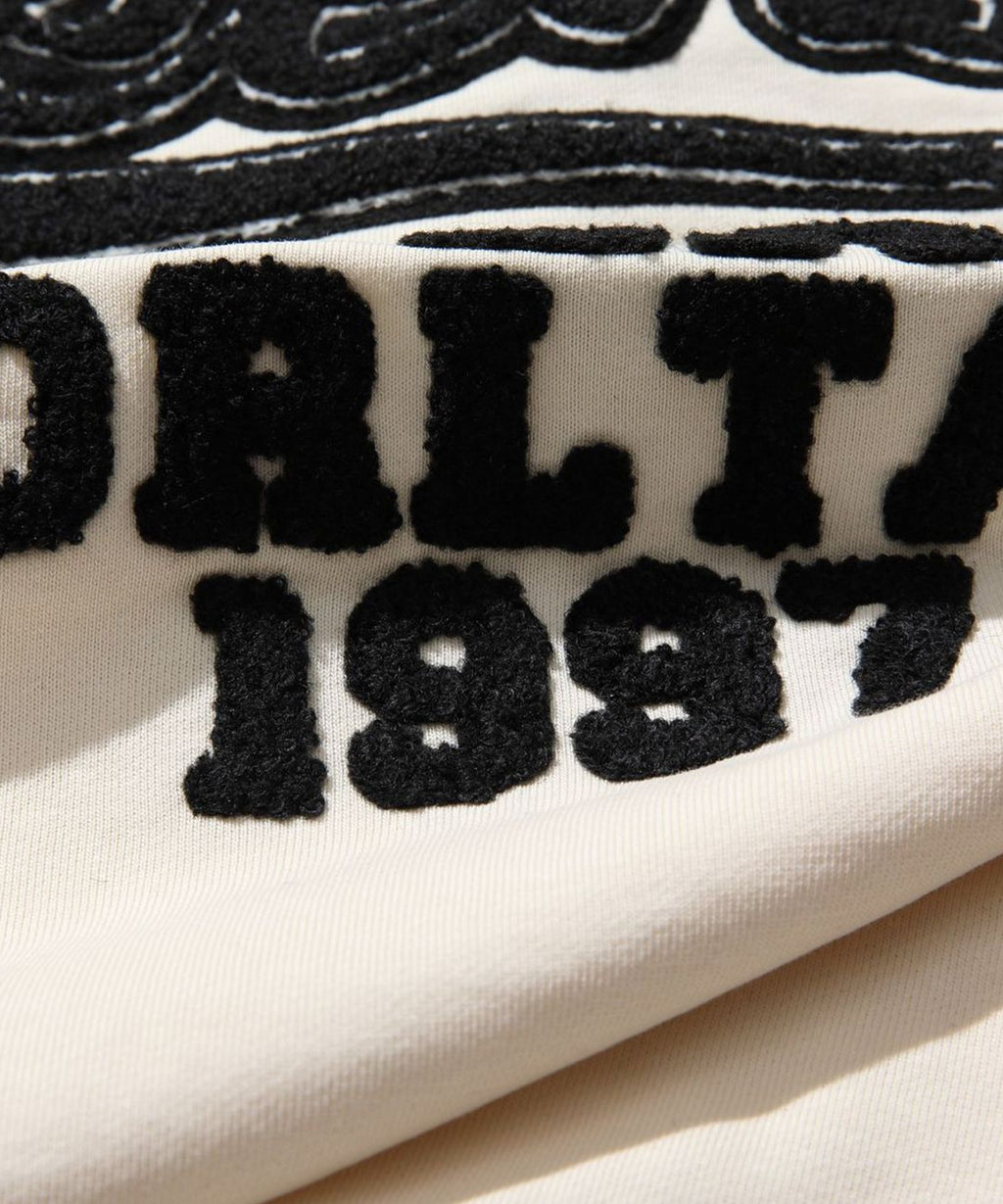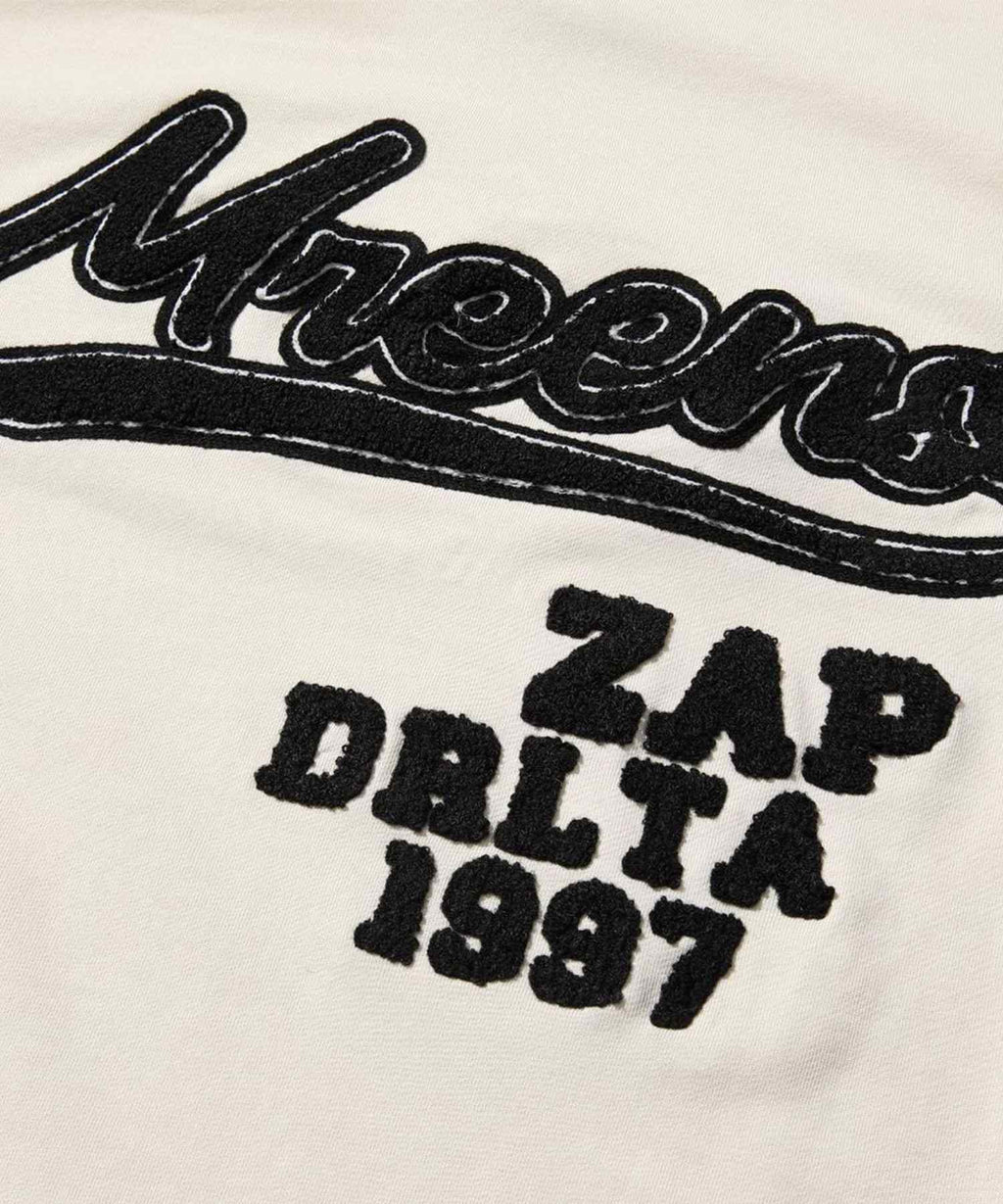 存在感のある袖切り替えデザインに英字刺繍が映える一着です。