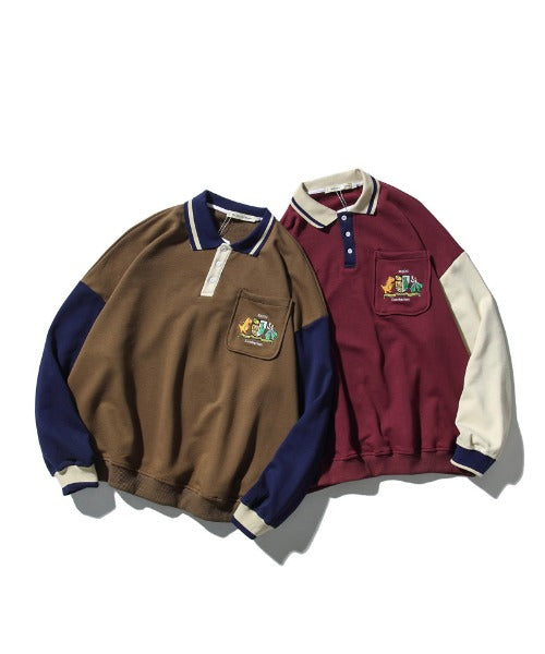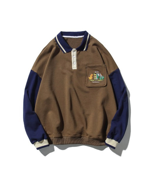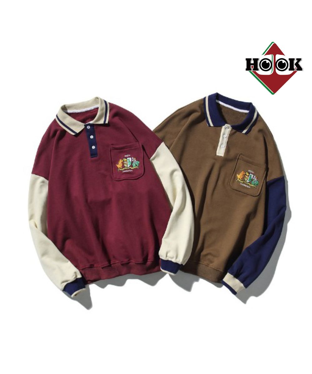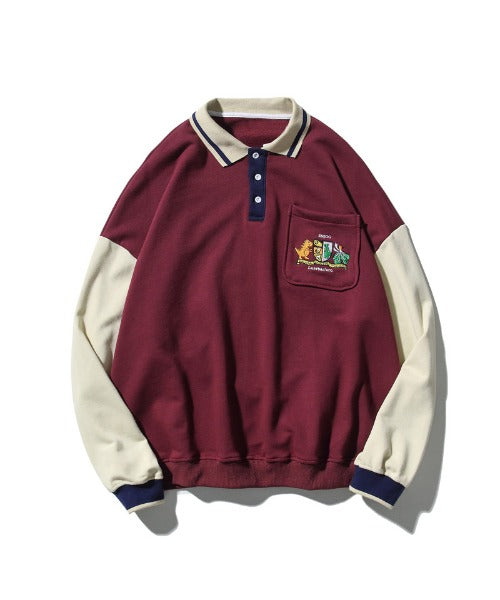 アメリカンアンティーク風デザインのエンブレム刺繍がされた長袖ポロシャツ登場!