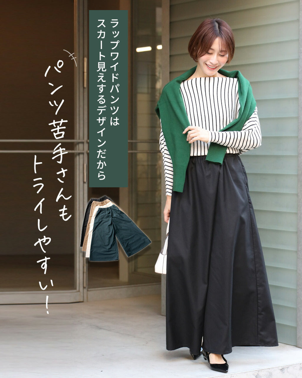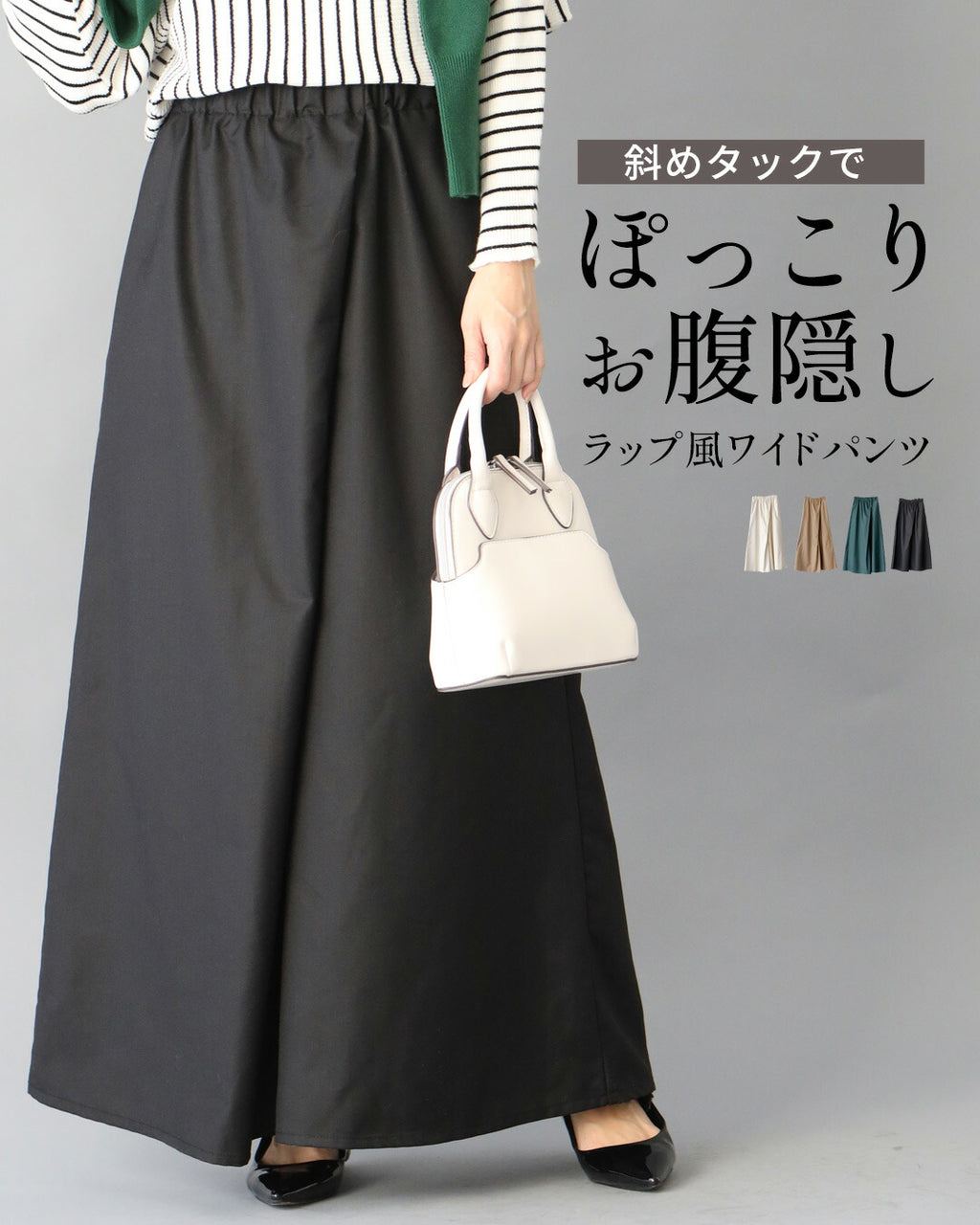 ■斜めタックでぽっこりお腹隠し ラップ風ワイドパンツ