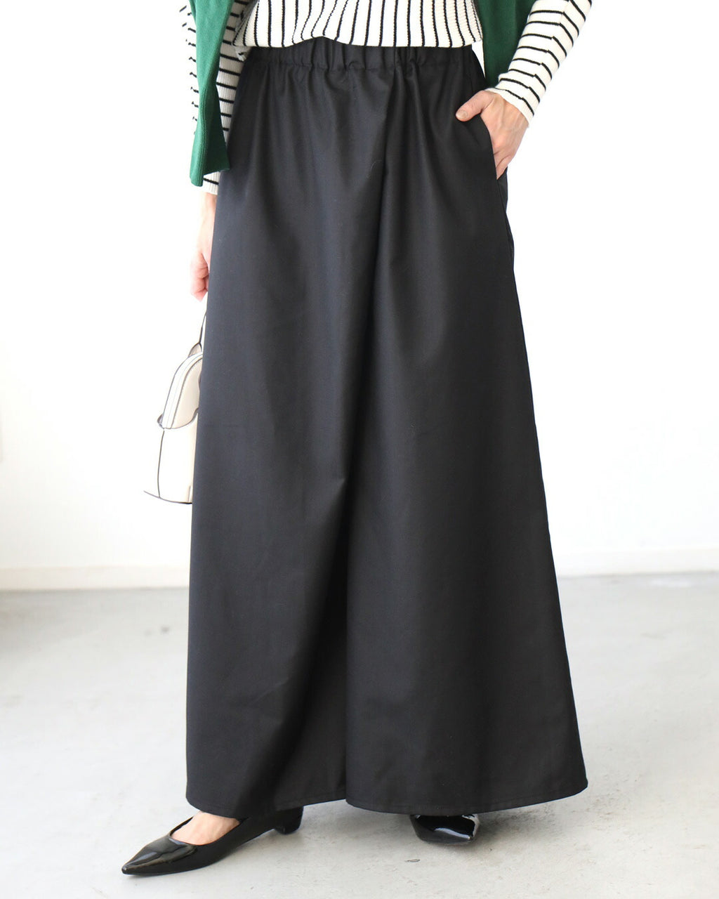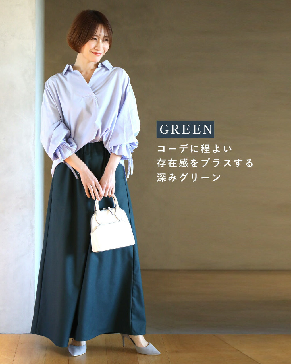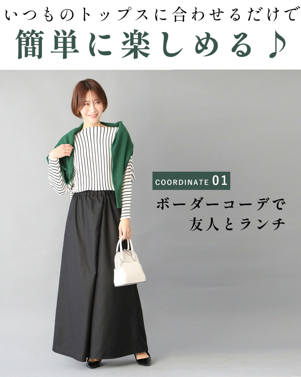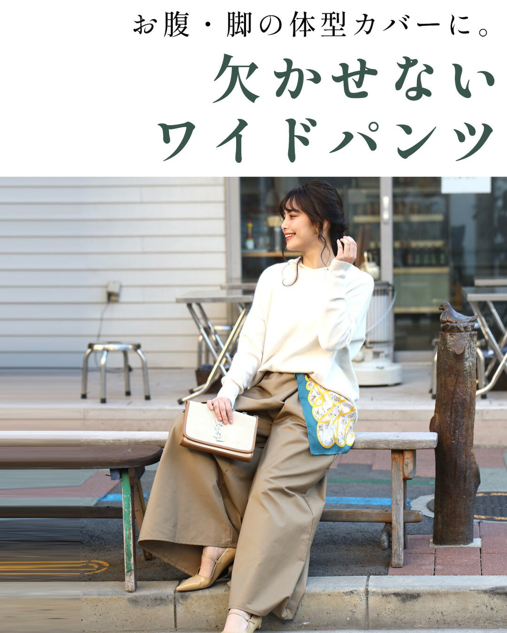 ワイドなシルエットが脚のラインを拾わず、動きやすさも抜群。