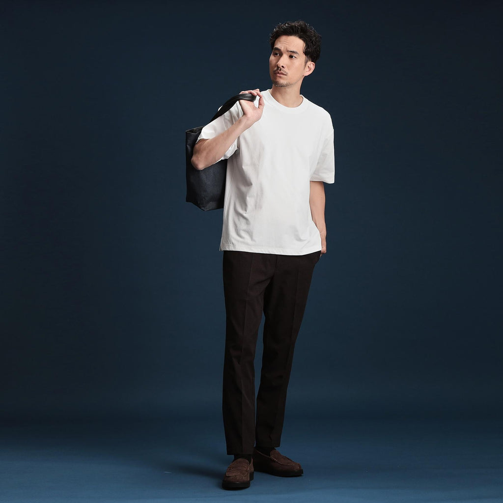 ややオーバーサイズなシルエットなので、一枚着でも、ジャケットやセットアップのインナーとしても合わせやすい。