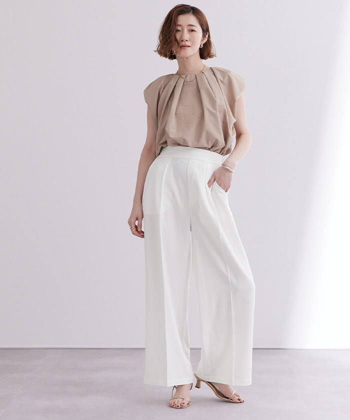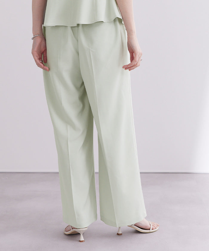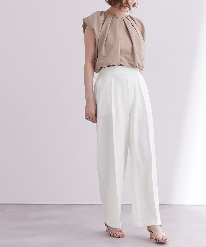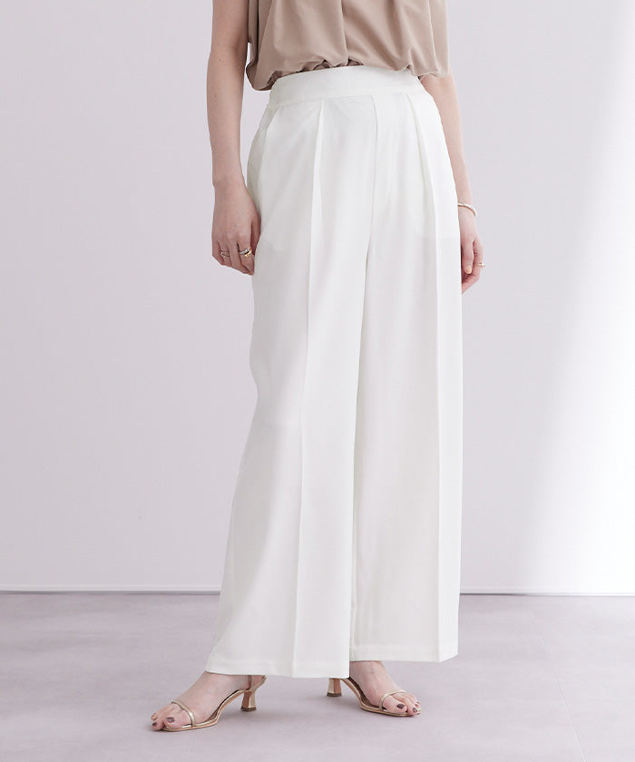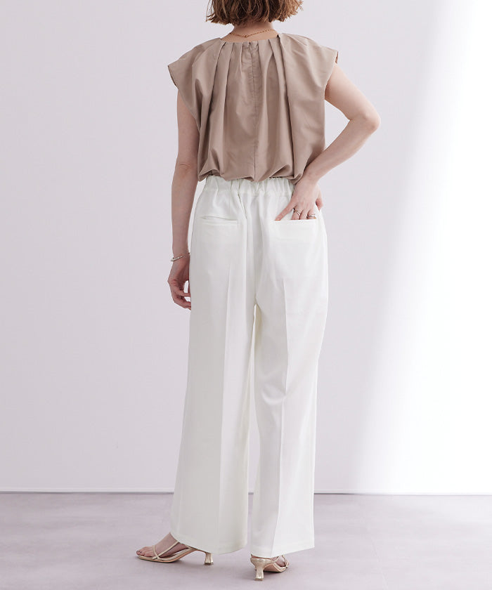 後ベルトゴム仕様で楽に履けるワイドパンツ。