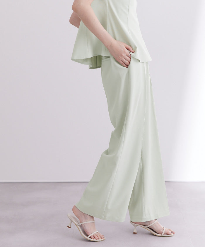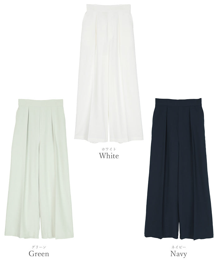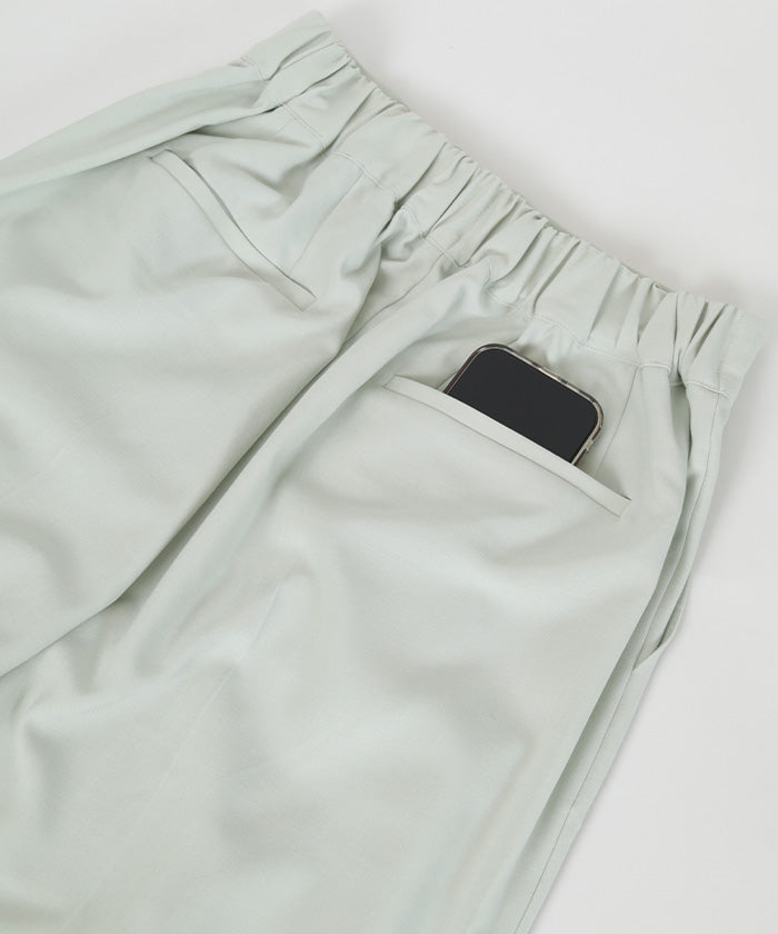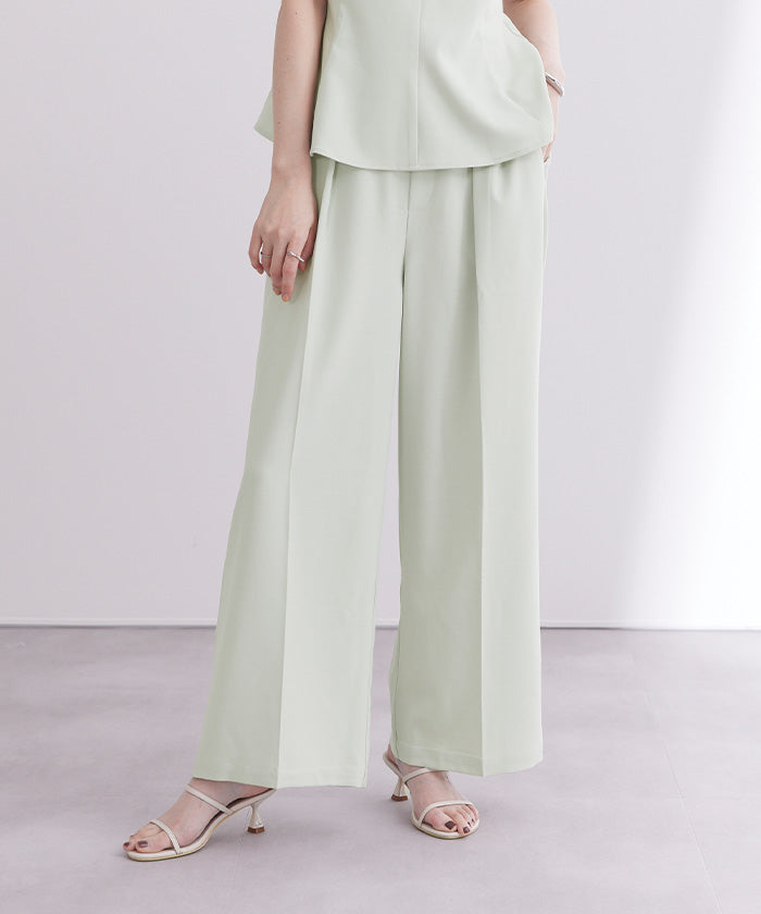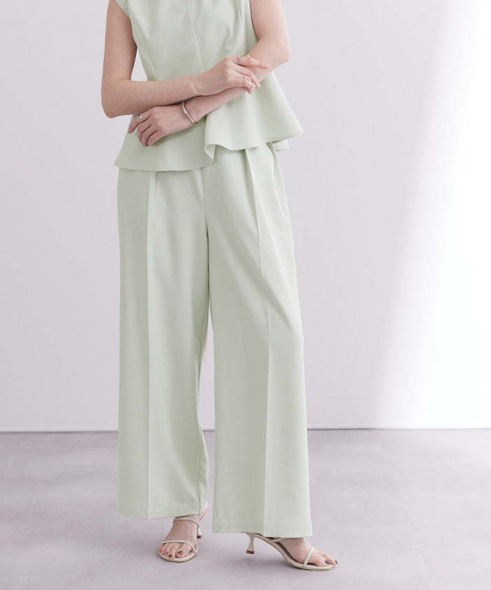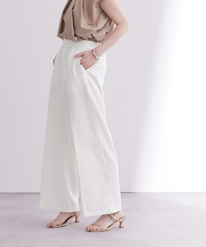 後ベルトゴム仕様で楽に履けるワイドパンツ。