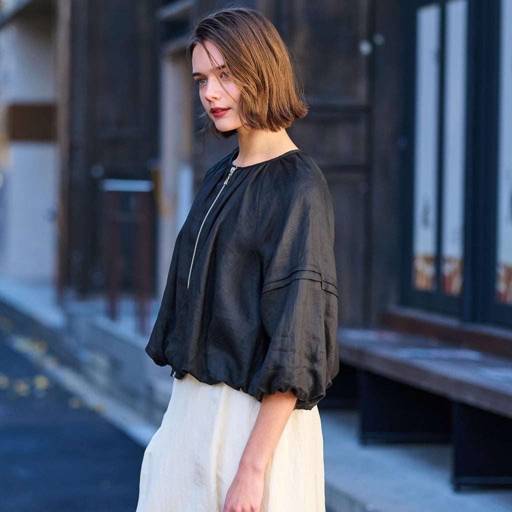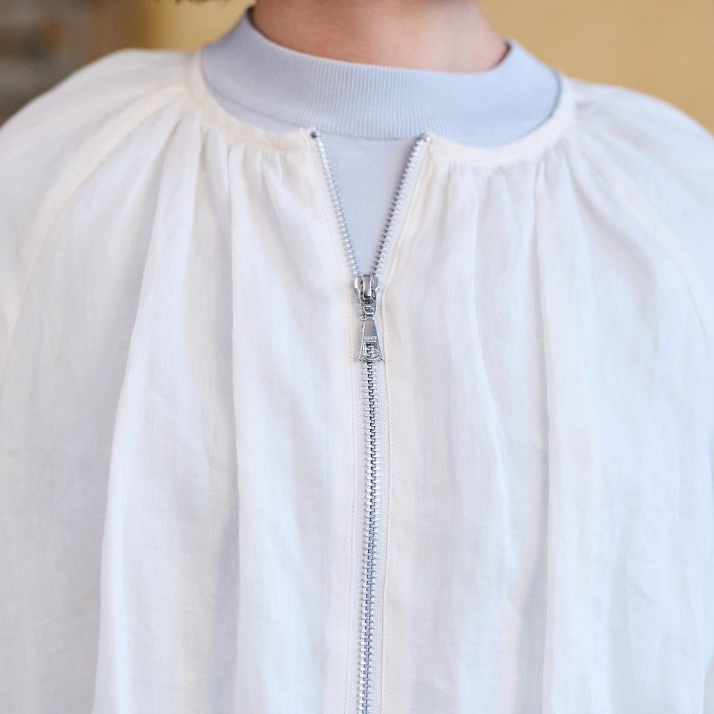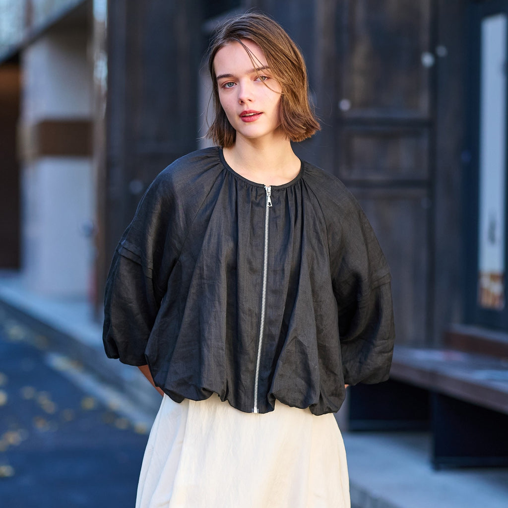 フロントジップを閉じてプルオーバー風に着こなすのも、開けてさらりと羽織るのもおすすめです。