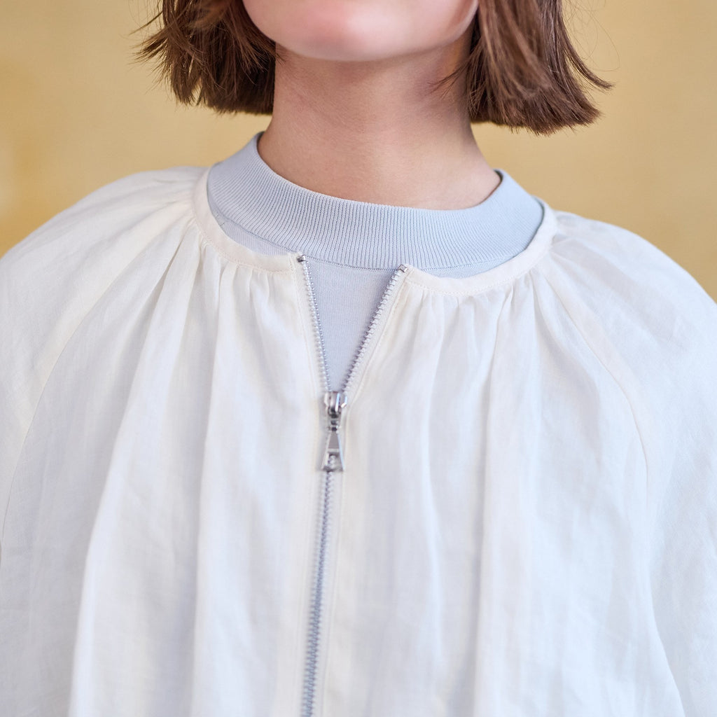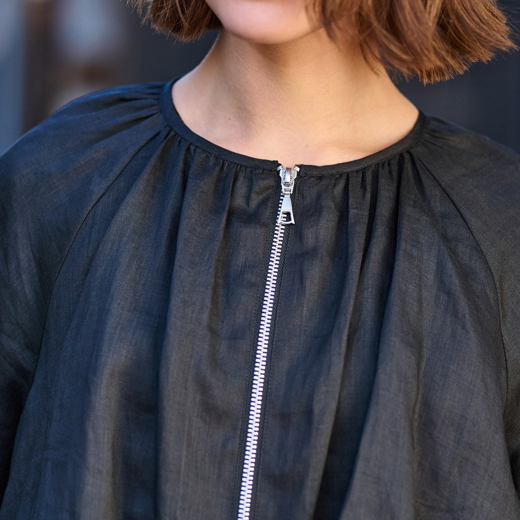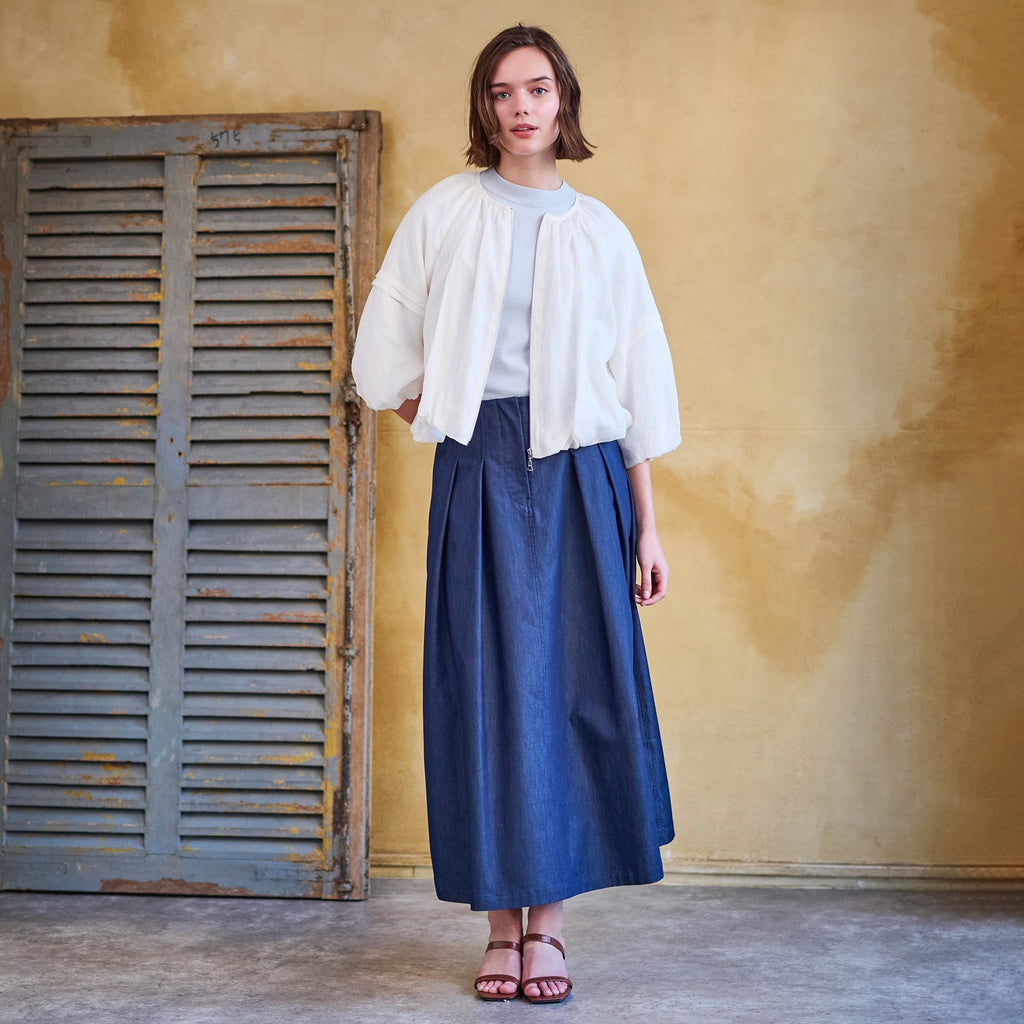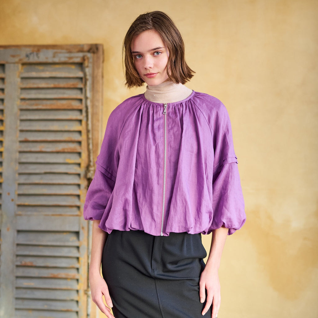 フロントジップを閉じてプルオーバー風に着こなすのも、開けてさらりと羽織るのもおすすめです。