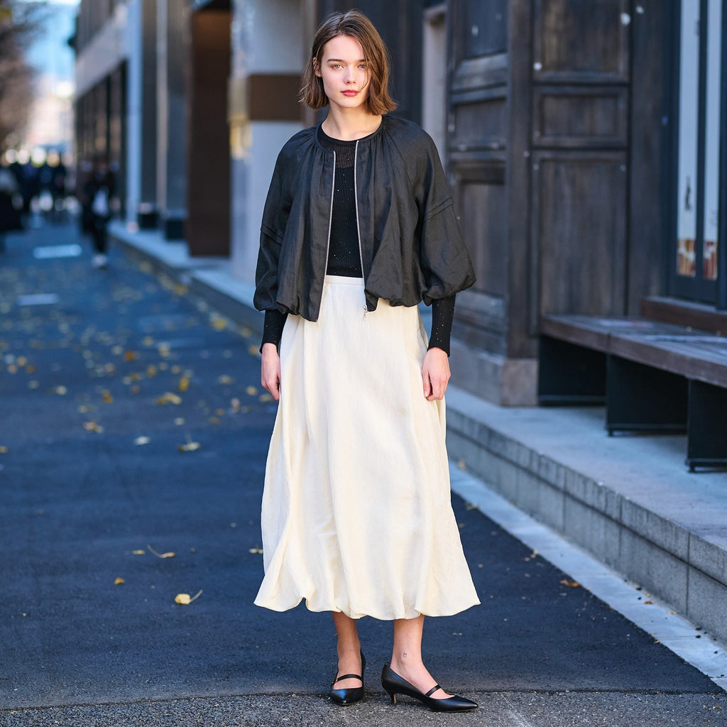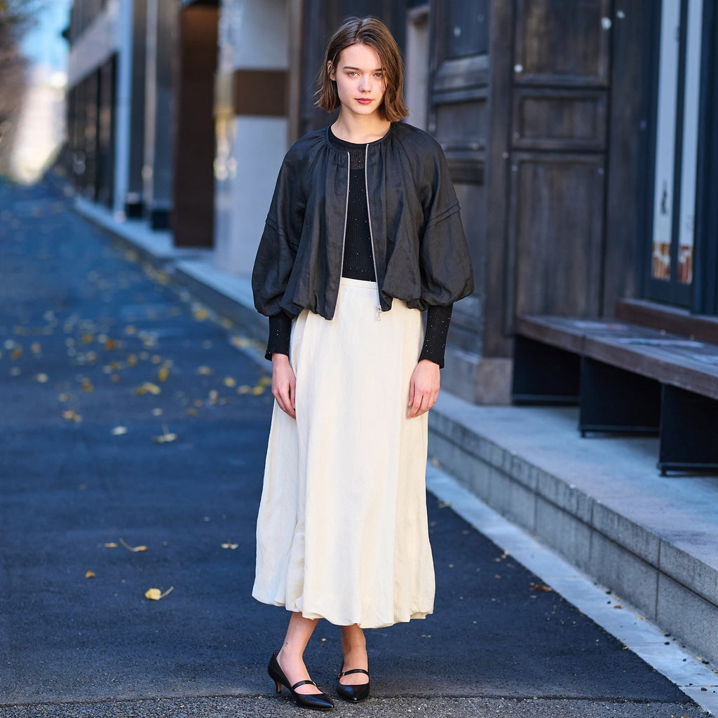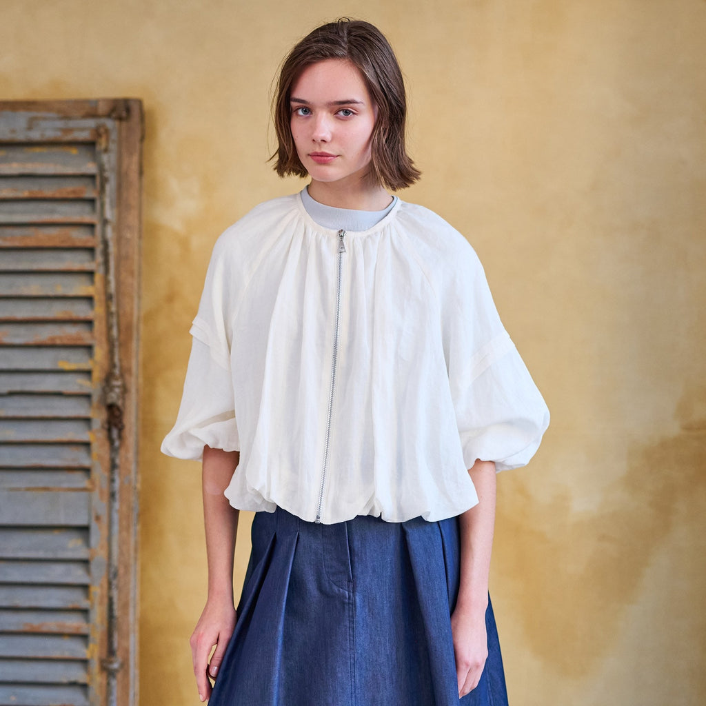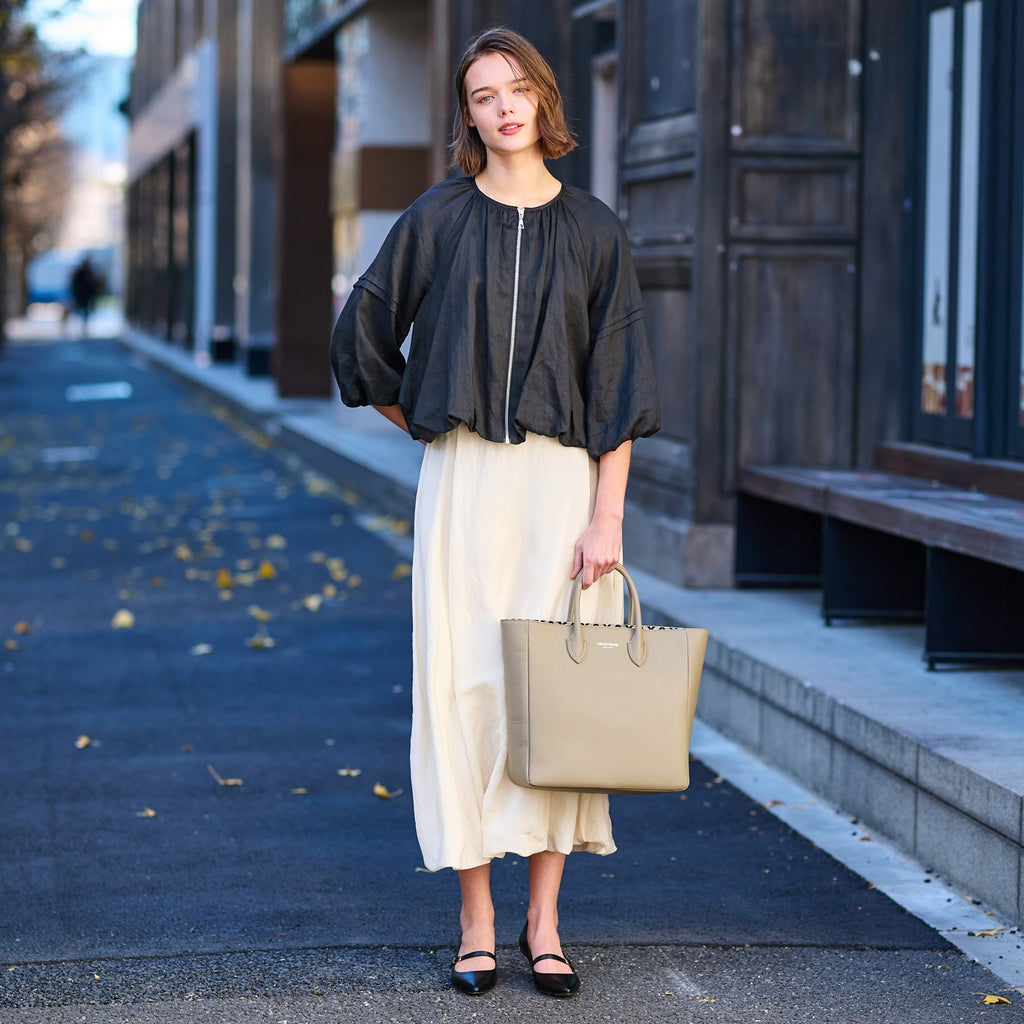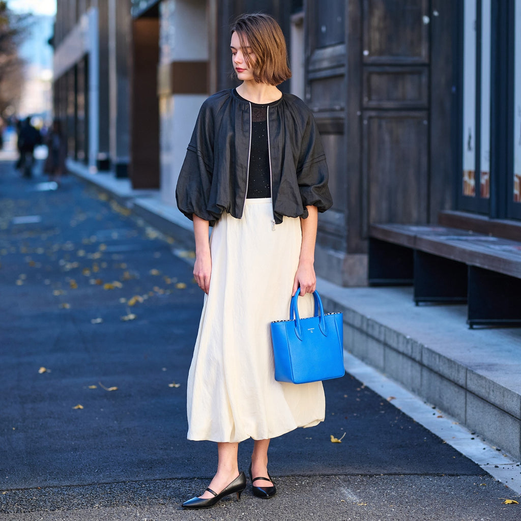今年らしい袖のタックデザインをプラスすることで、シルエットにアクセントを加え、より旬な印象に仕上げています。