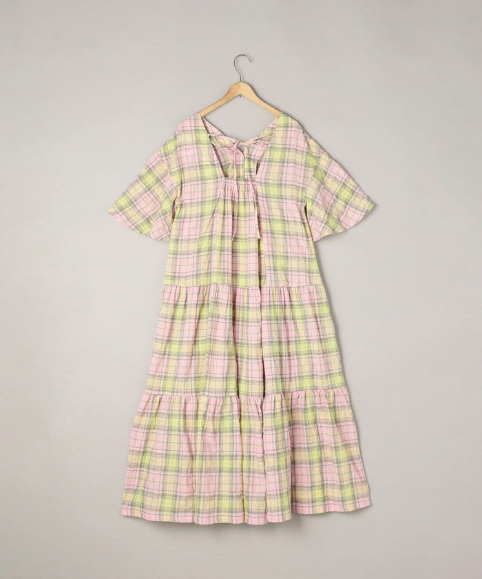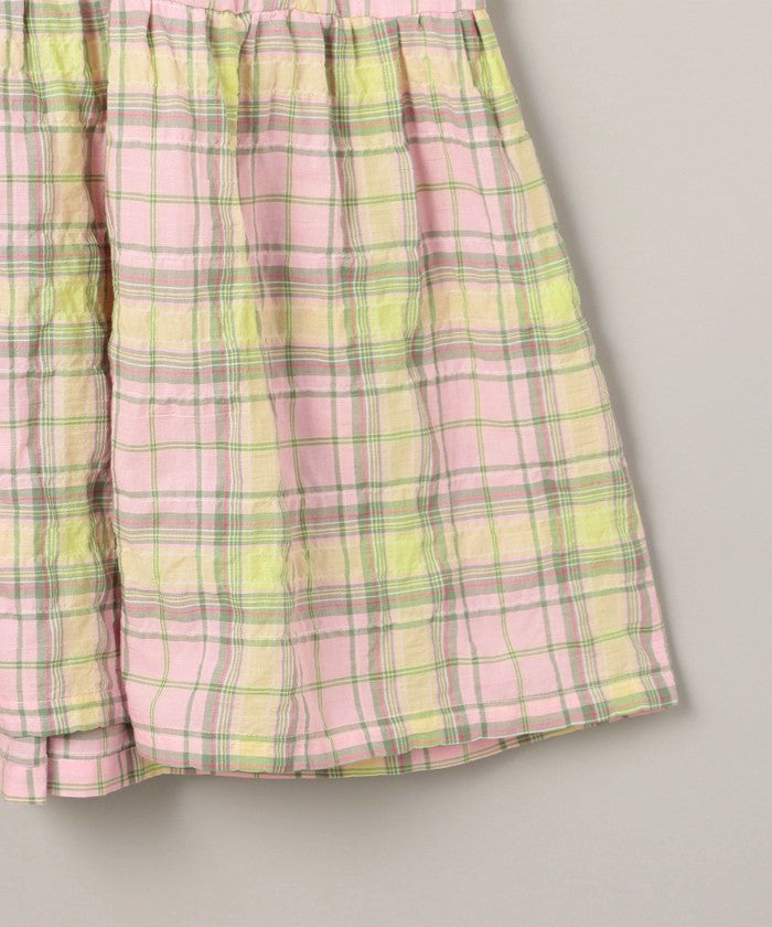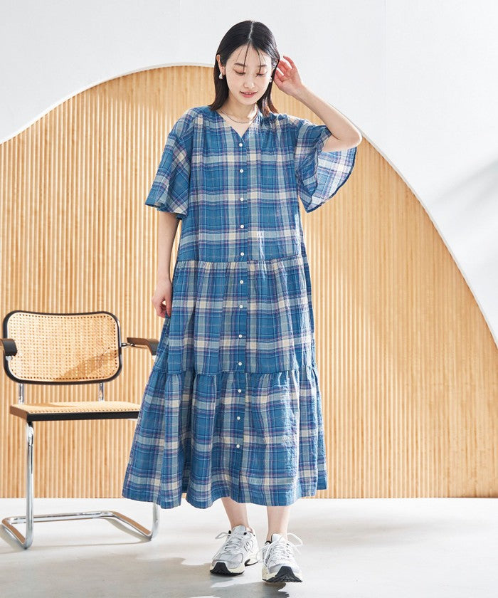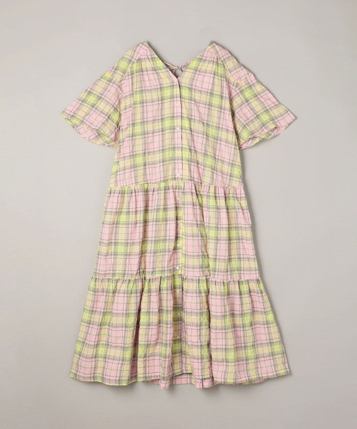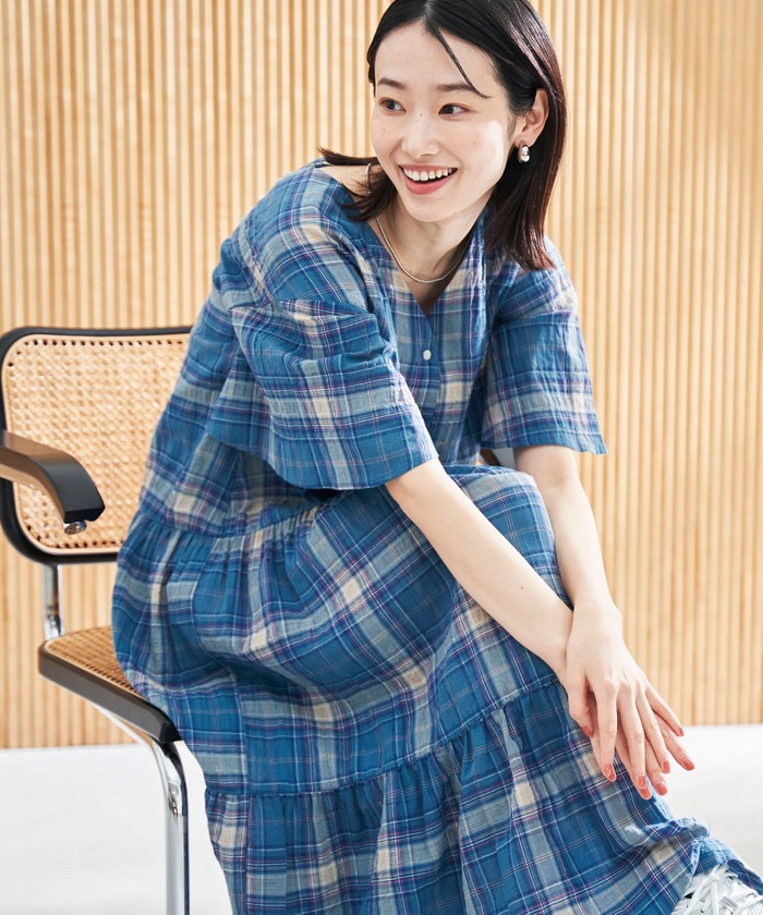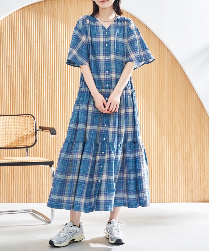 ●さらっとした肌触りと清涼感が魅力のシャーリングチェックを使用したフレアスリーブワンピース