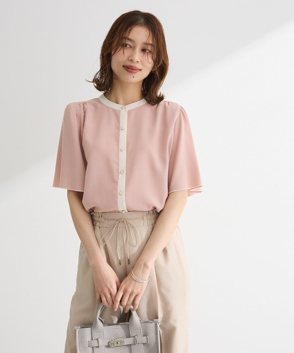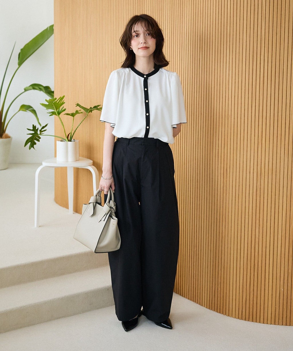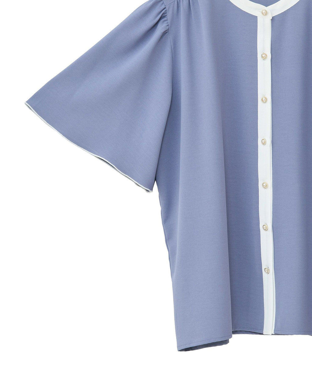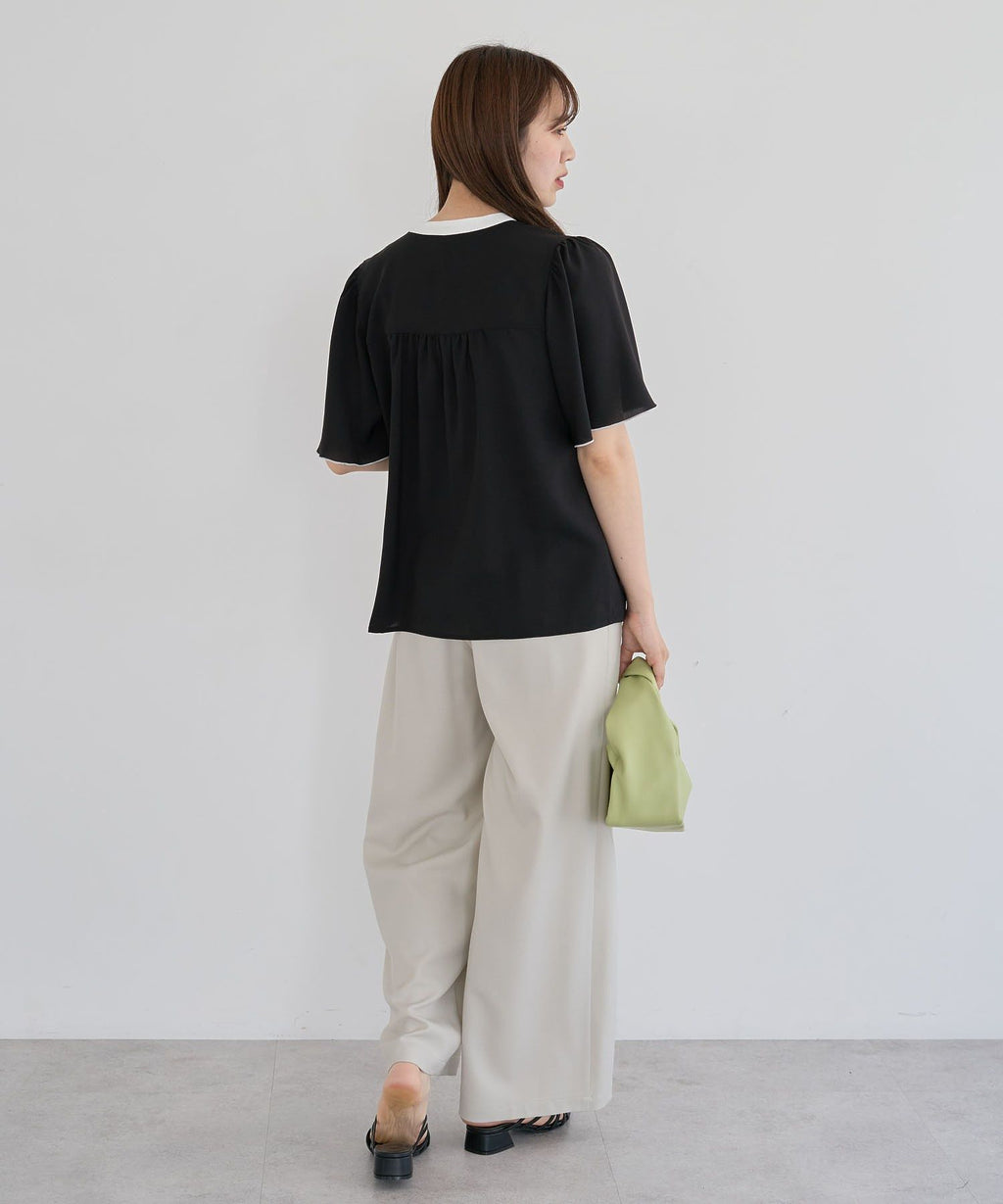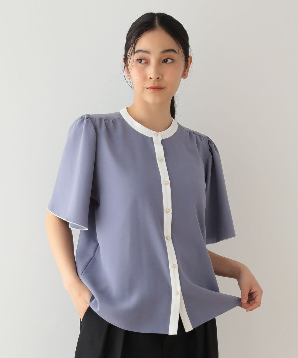 ネックラインや前立てのバイカラー配色がクラシカルな着こなしを叶えるブラウス。ふんわりと広がるフレアスリーブや、パール調ボタンがフェミニンな印象を与えます。ショルダー部分やバックヨークに施したギャザーのポイント使いがアクセントに。きれいめはもちろん、カジュアルアイテムと合わせたミックススタイルもおすすめです。透け感[ややあり]