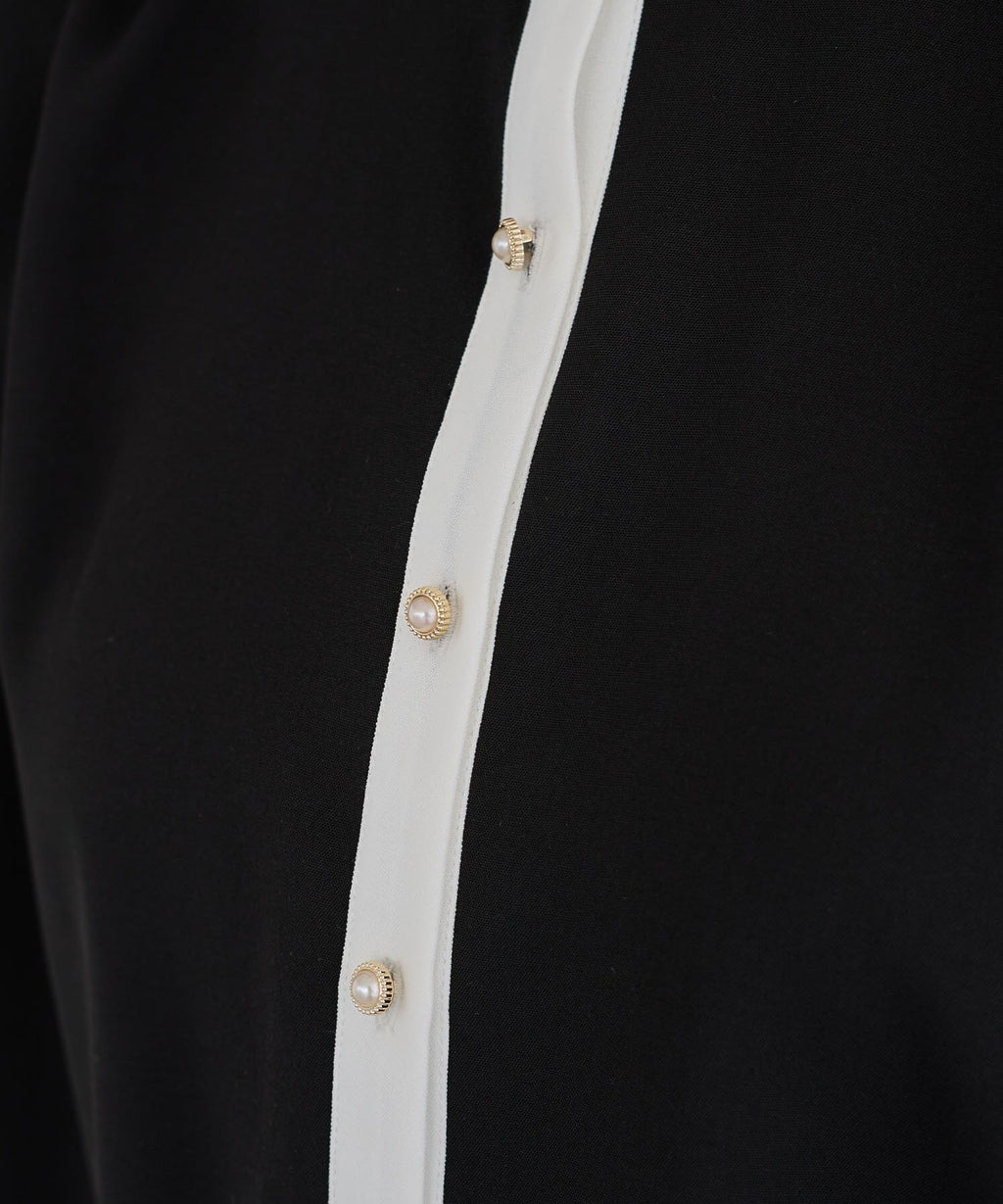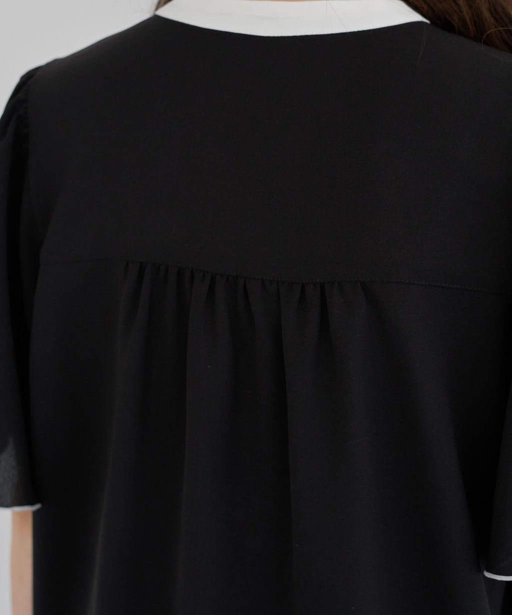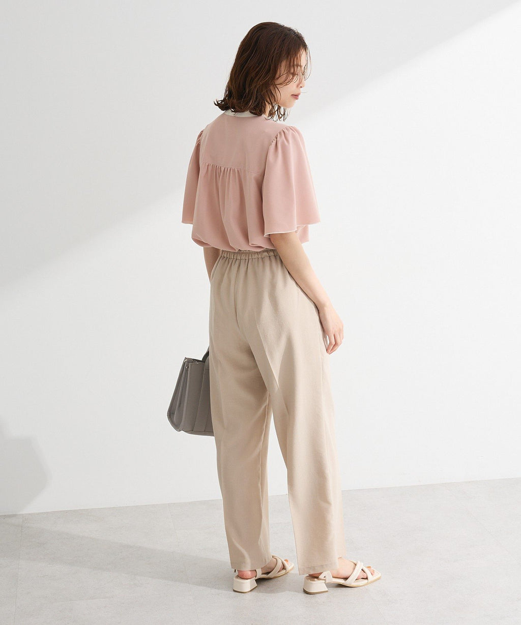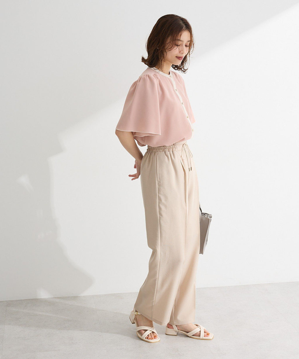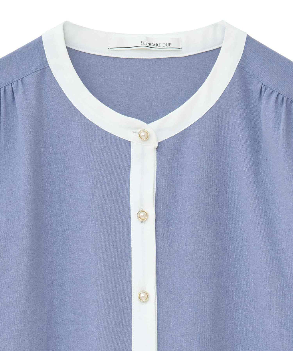 ネックラインや前立てのバイカラー配色がクラシカルな着こなしを叶えるブラウス。ふんわりと広がるフレアスリーブや、パール調ボタンがフェミニンな印象を与えます。ショルダー部分やバックヨークに施したギャザーのポイント使いがアクセントに。きれいめはもちろん、カジュアルアイテムと合わせたミックススタイルもおすすめです。透け感[ややあり]