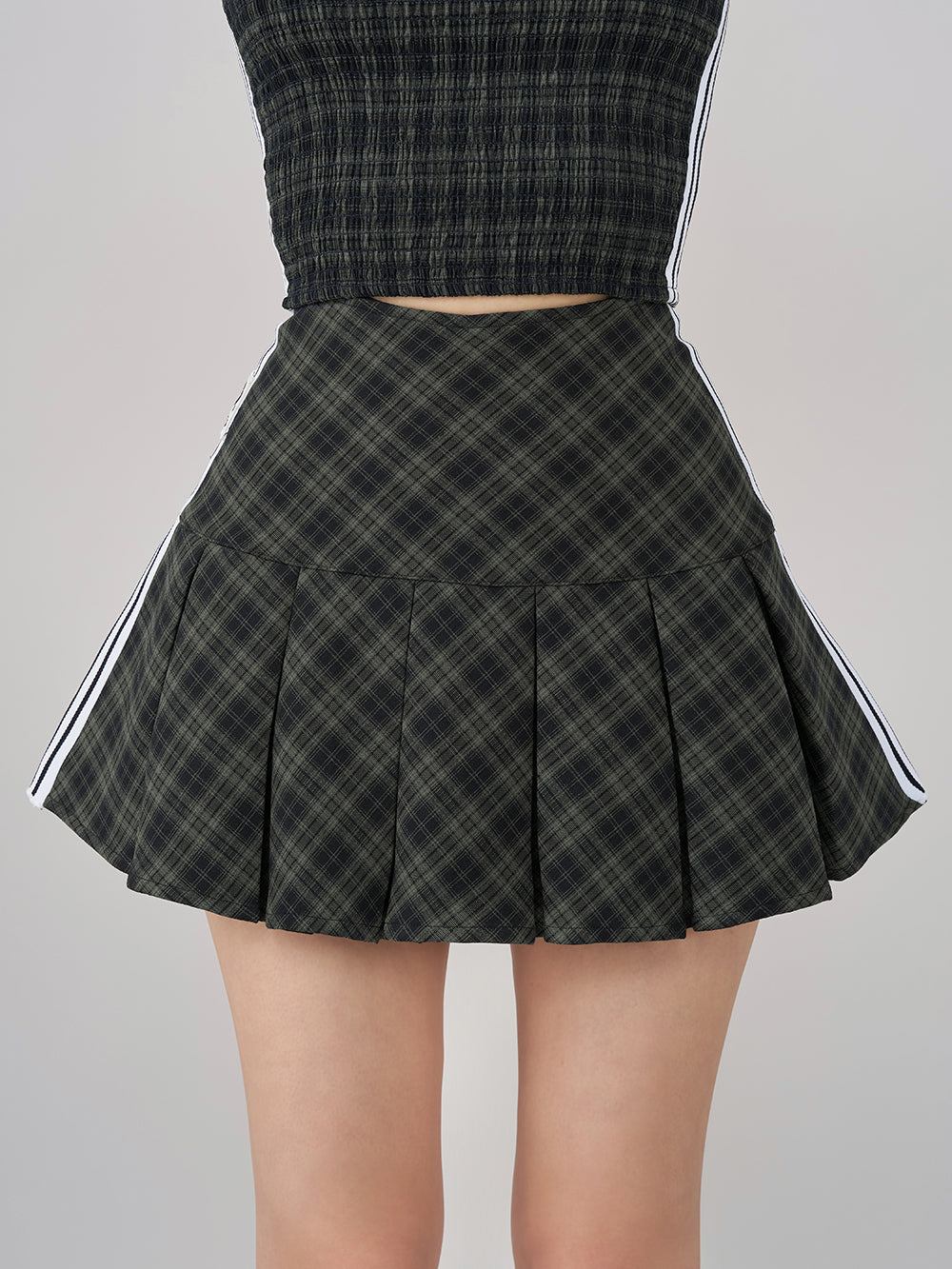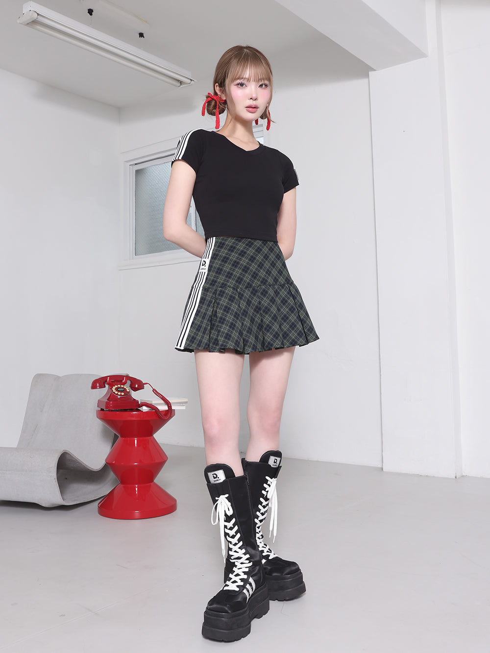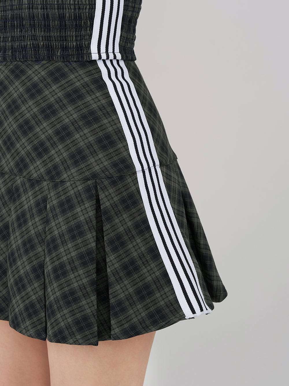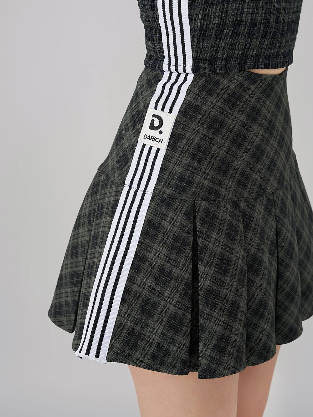 レトロなチェック素材のミニスカートに、オリジナルのサイドラインテープを施し、