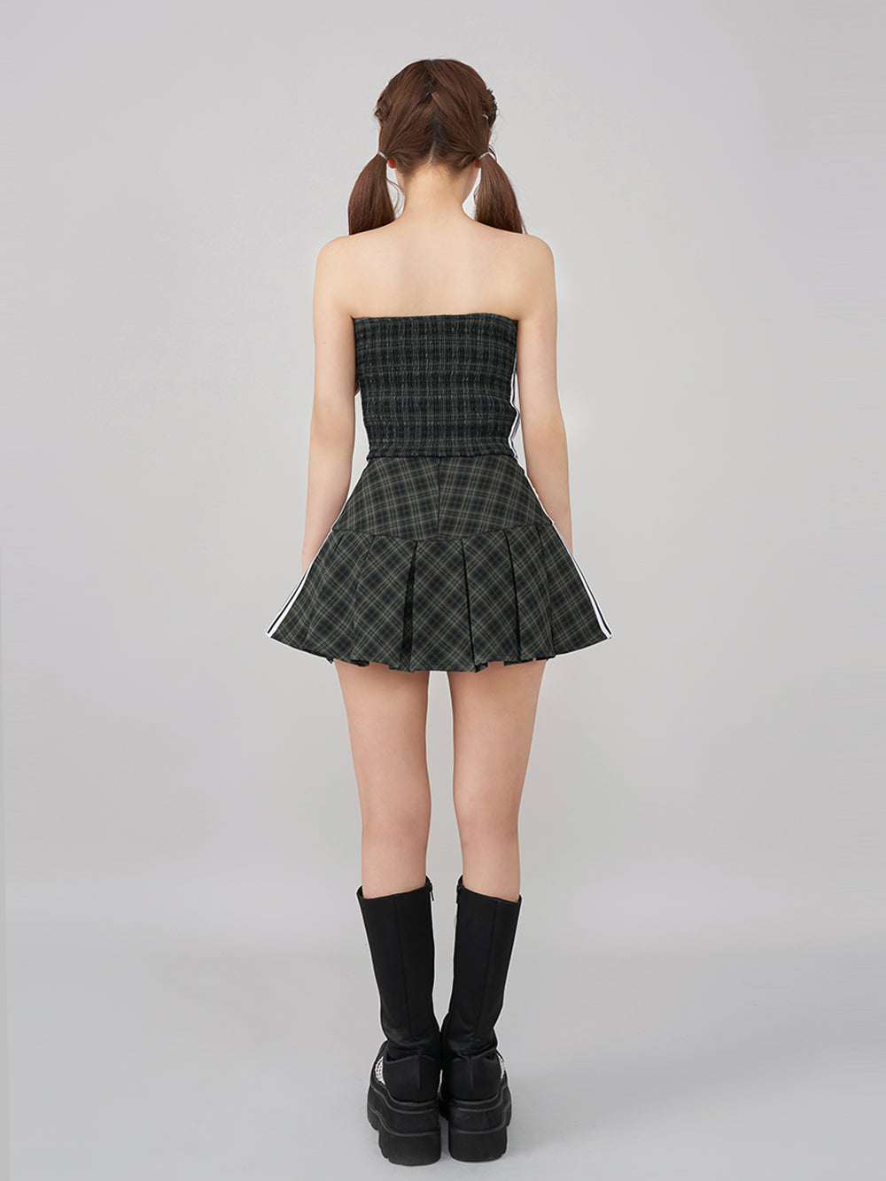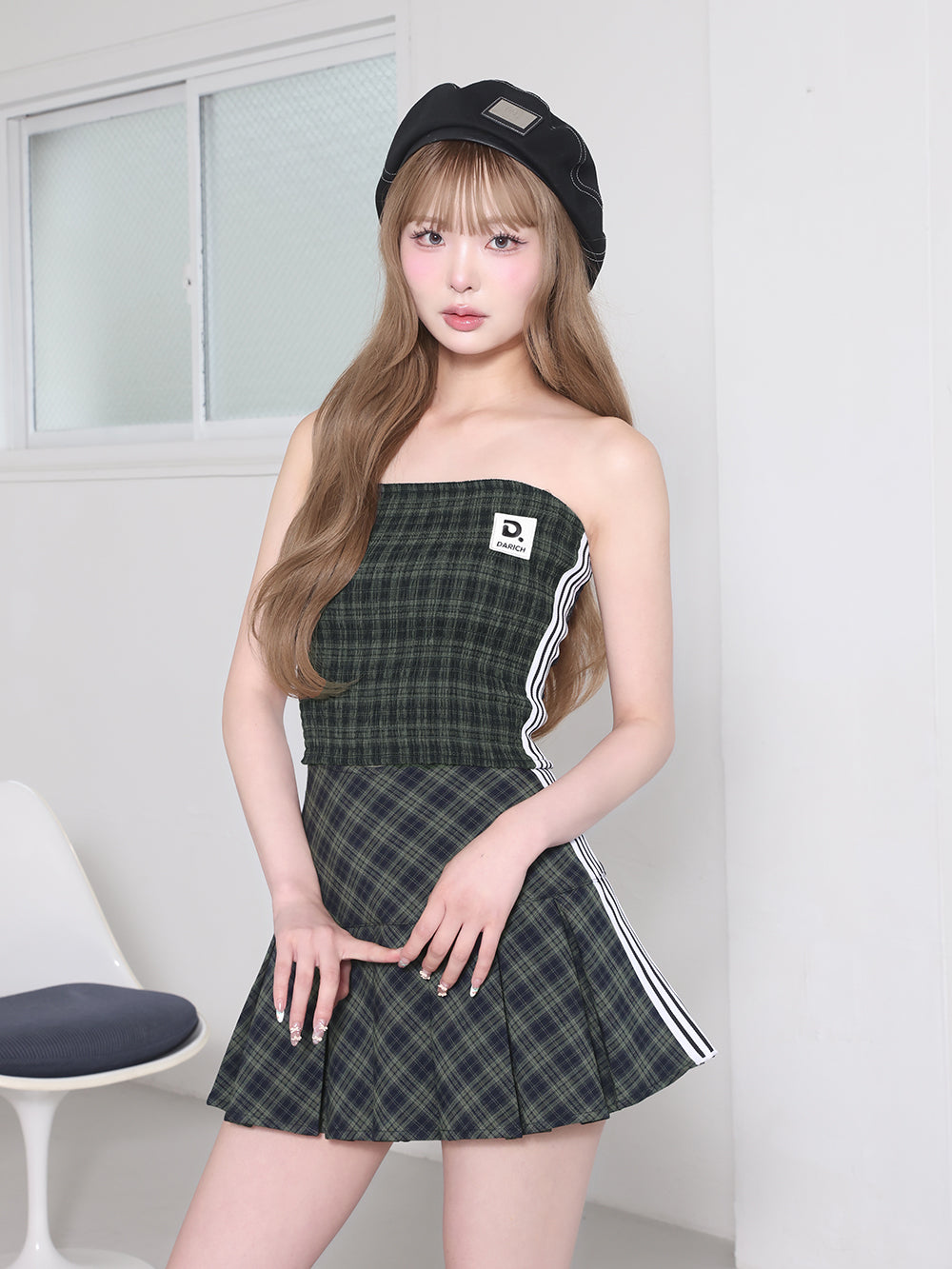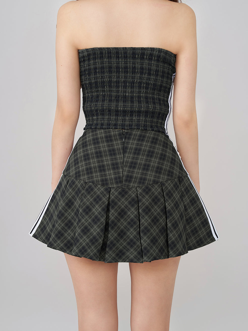 レトロなチェック素材のミニスカートに、オリジナルのサイドラインテープを施し、