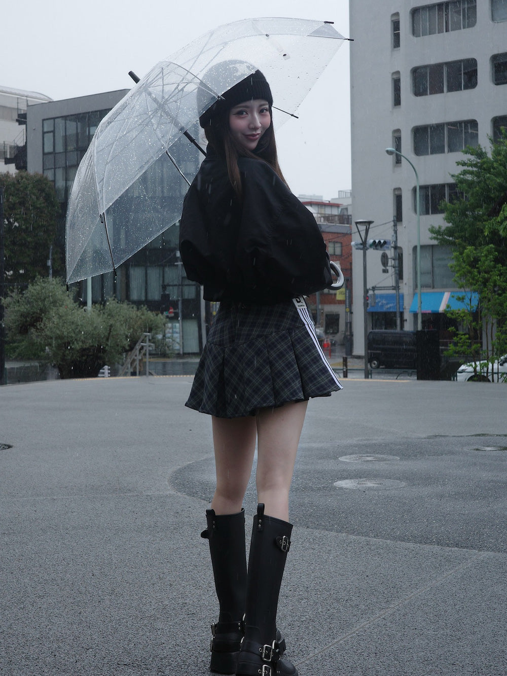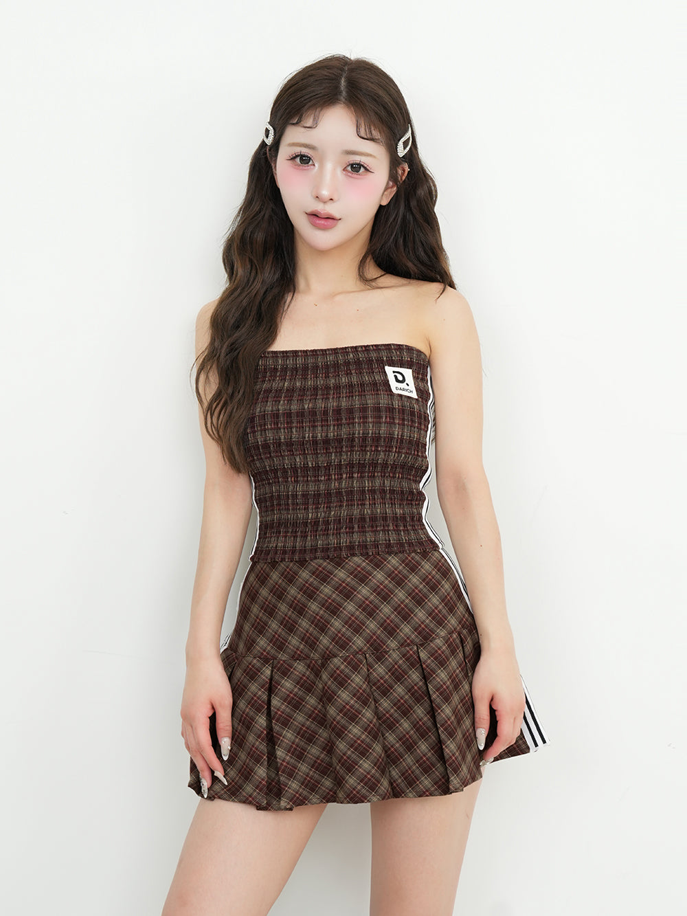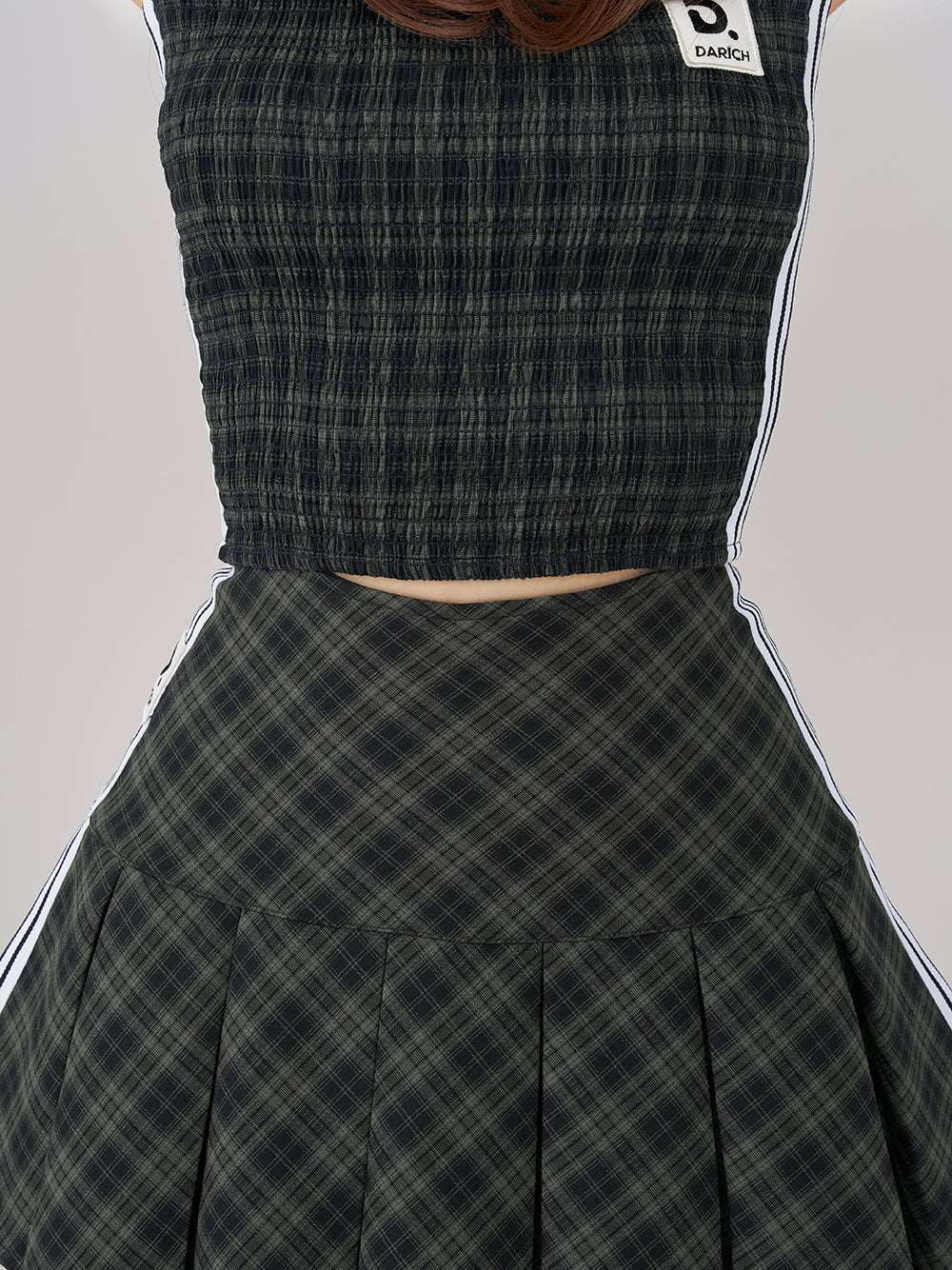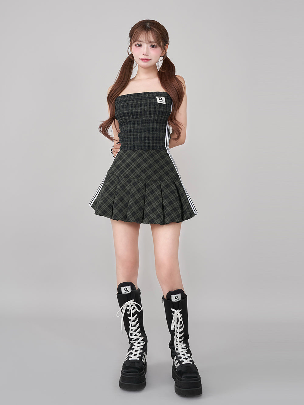 レトロなチェック素材のミニスカートに、オリジナルのサイドラインテープを施し、