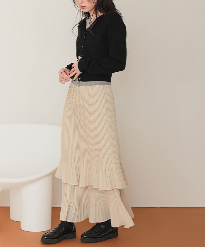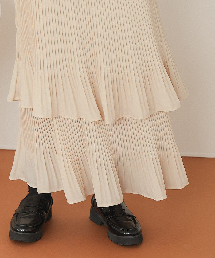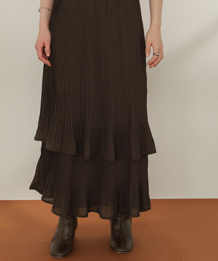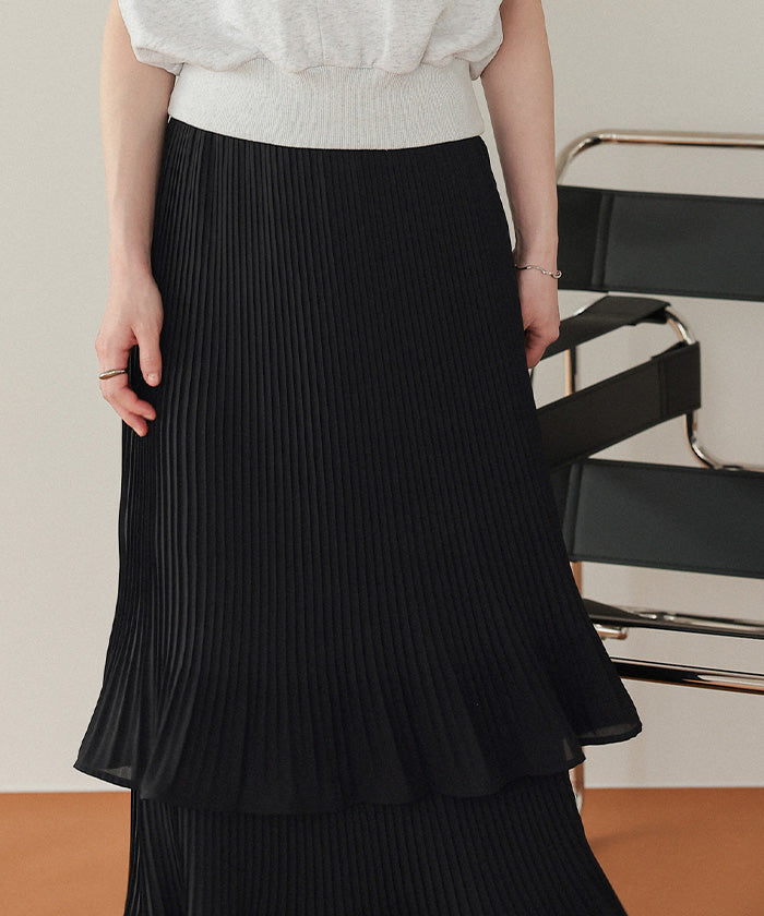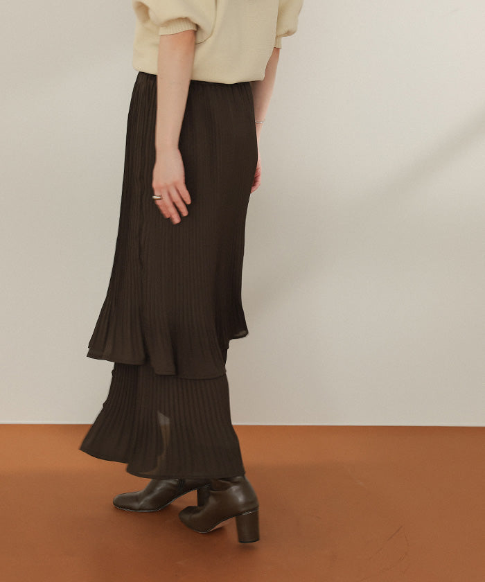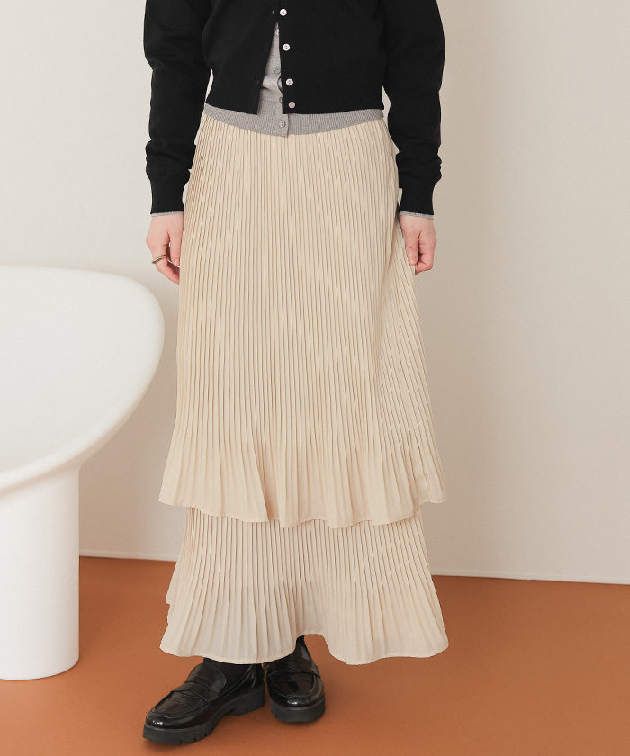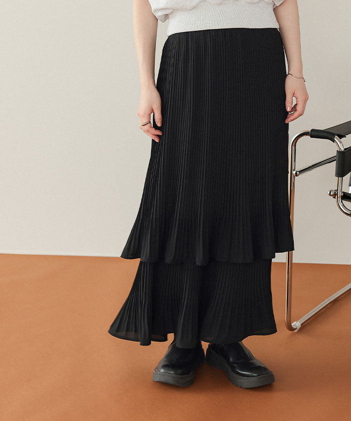 ・プリーツ素材が2つに重なった動きのあるティアードスカート