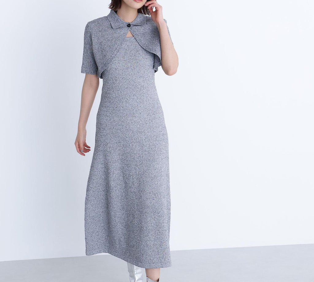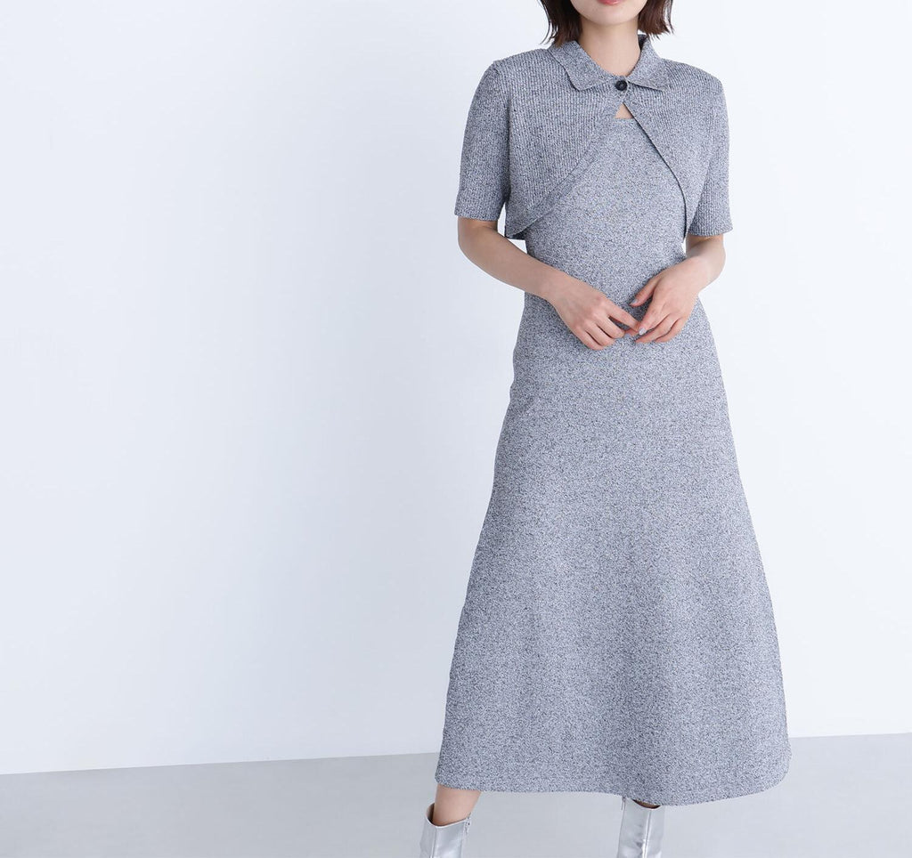 メランジの見え方がポイントのボレロとニットワンピースのSETアイテム。ボレロはスコッチ釦をポイントにしたショート丈と、裾に向かってラウンドのヘムラインにした拘りのデザイン。ワンピースはすっきりとしたナローシルエットで、ボレロとレイヤードした時に、胸元がキレイに見えるスクエアネックデザインです。