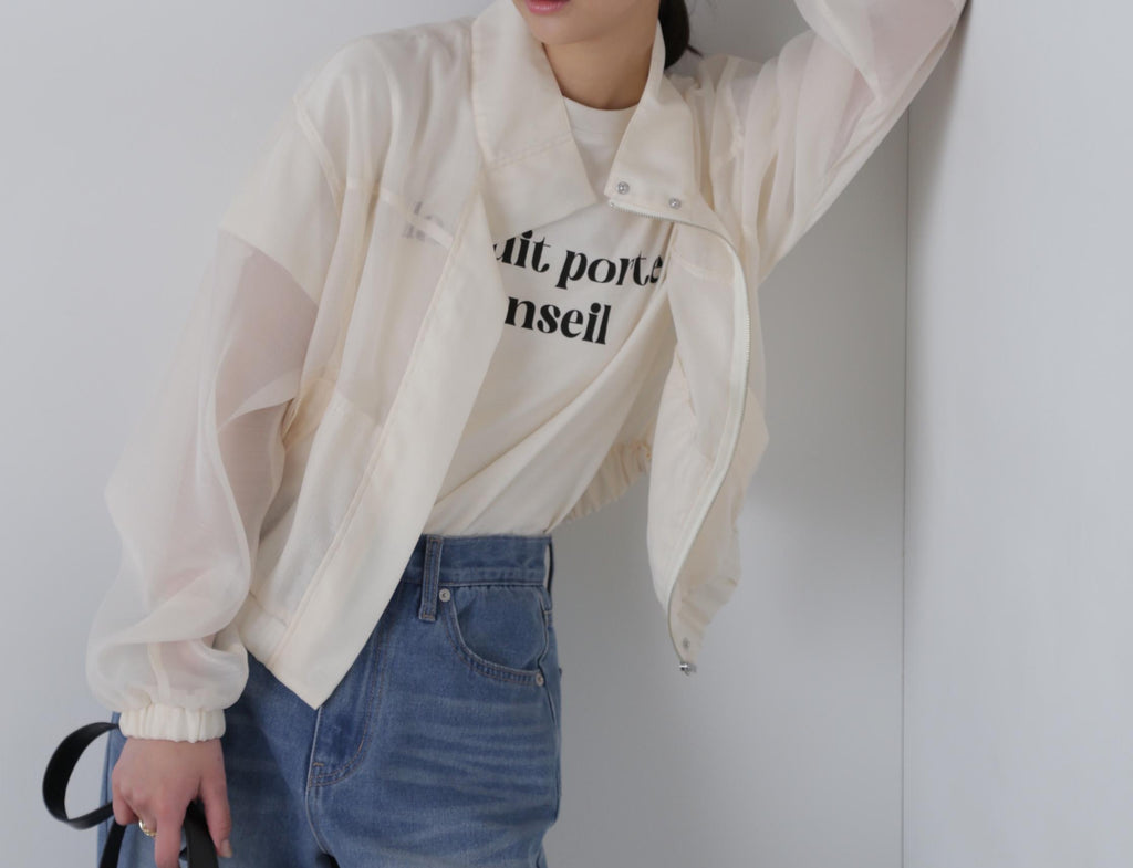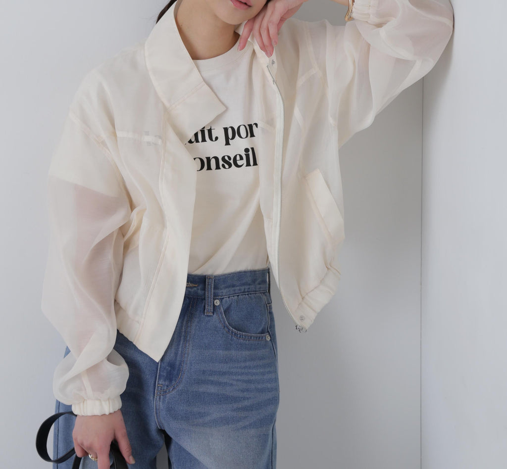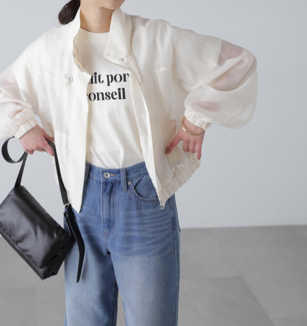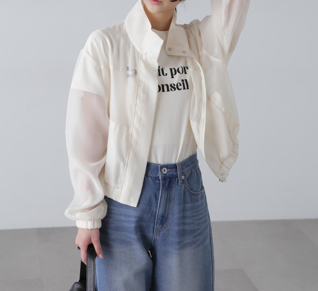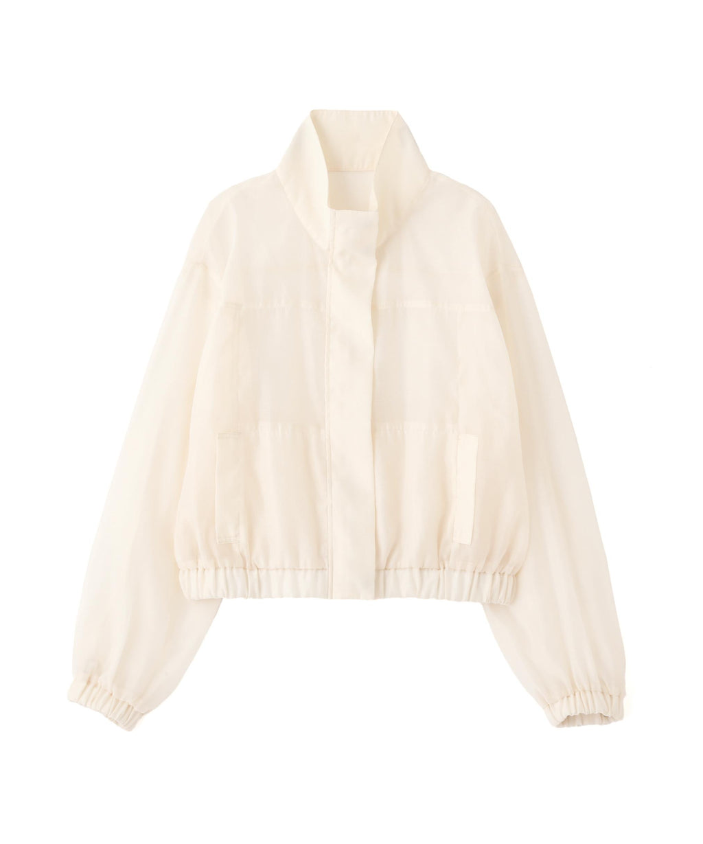 〔fabric&design〕毎年ご好評いただくリラックスしたオーバーサイズシルエットのシアーブルゾン。今期はスタンドカラーへアップデートしています。合繊のシアーボイルで若干のハリがある素材。シアーシャツほどくたっとせずブルゾンに適した生地です。ブルゾン縫製でカジュアル過ぎず仕立てにもこだわった1枚です。袖口と裾をゴムできゅっとさせたギャザーで表情を加え、スタイリングした際もパンツからスカートまでバランスが取りやすい着丈感です。〔styling〕パンツ、スカート、ワンピース問わずスタイリングしやすく、シャツのような着こなしができ、冷房対策アイテムとしても重宝してくれます。肩掛けなどしてプラスワンアイテムとしても◎。