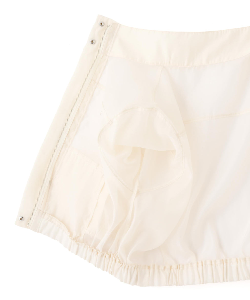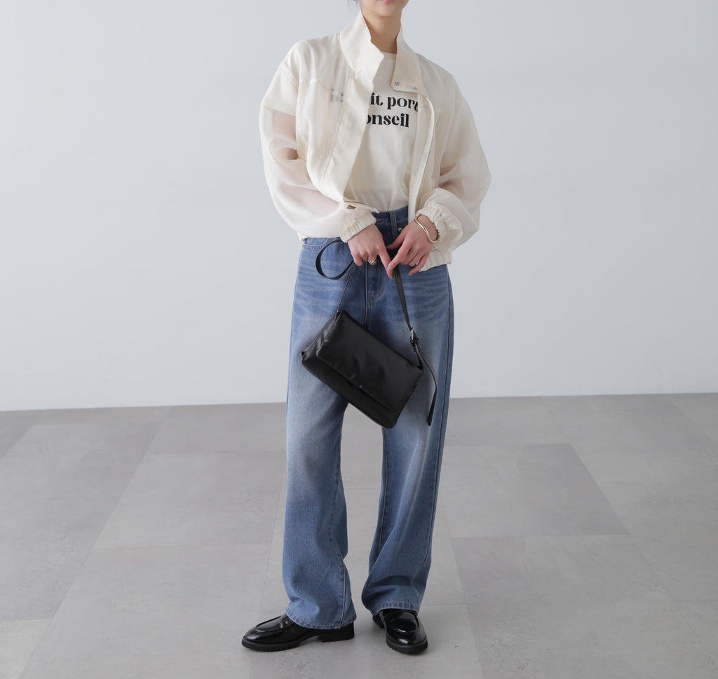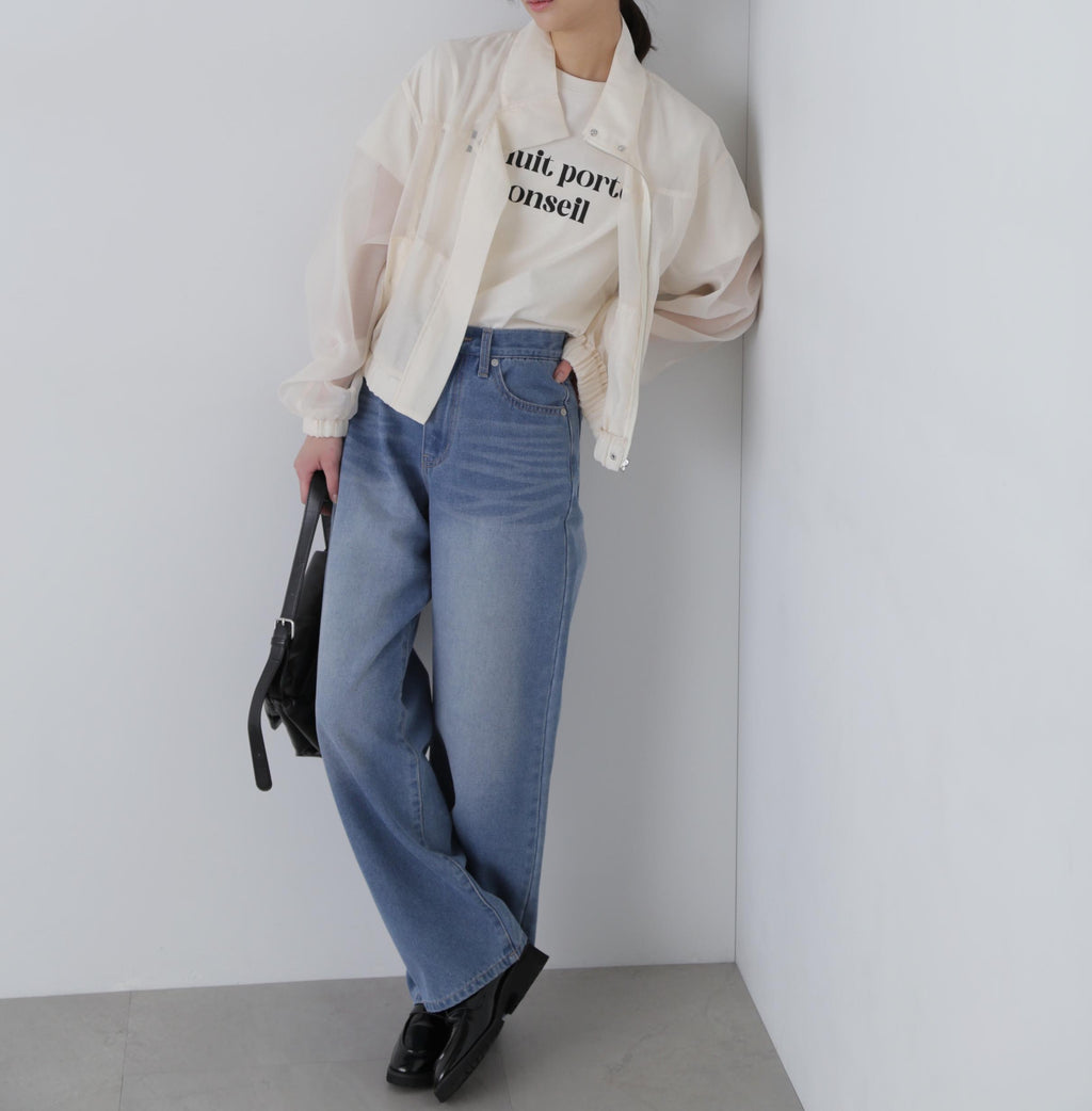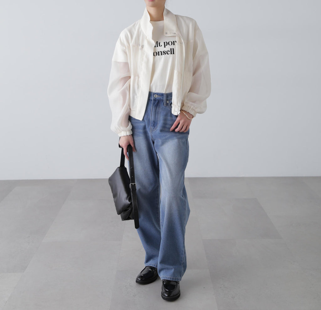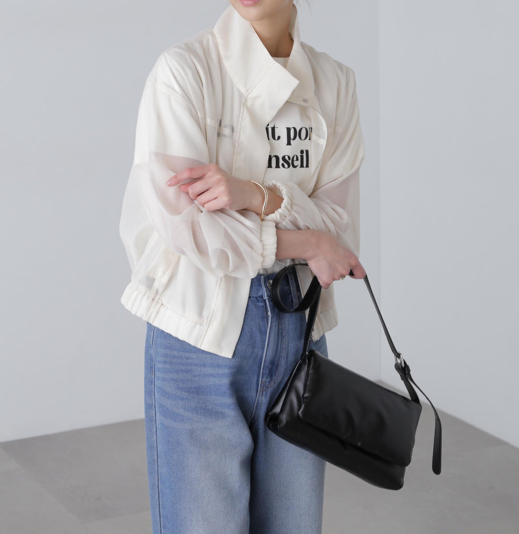 〔fabric&design〕毎年ご好評いただくリラックスしたオーバーサイズシルエットのシアーブルゾン。今期はスタンドカラーへアップデートしています。合繊のシアーボイルで若干のハリがある素材。シアーシャツほどくたっとせずブルゾンに適した生地です。ブルゾン縫製でカジュアル過ぎず仕立てにもこだわった1枚です。袖口と裾をゴムできゅっとさせたギャザーで表情を加え、スタイリングした際もパンツからスカートまでバランスが取りやすい着丈感です。〔styling〕パンツ、スカート、ワンピース問わずスタイリングしやすく、シャツのような着こなしができ、冷房対策アイテムとしても重宝してくれます。肩掛けなどしてプラスワンアイテムとしても◎。