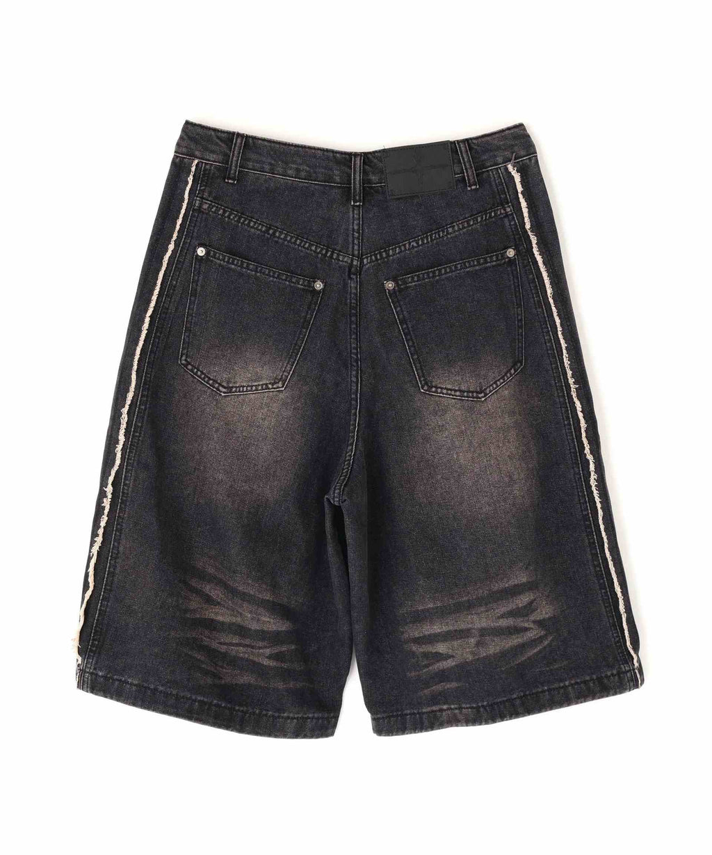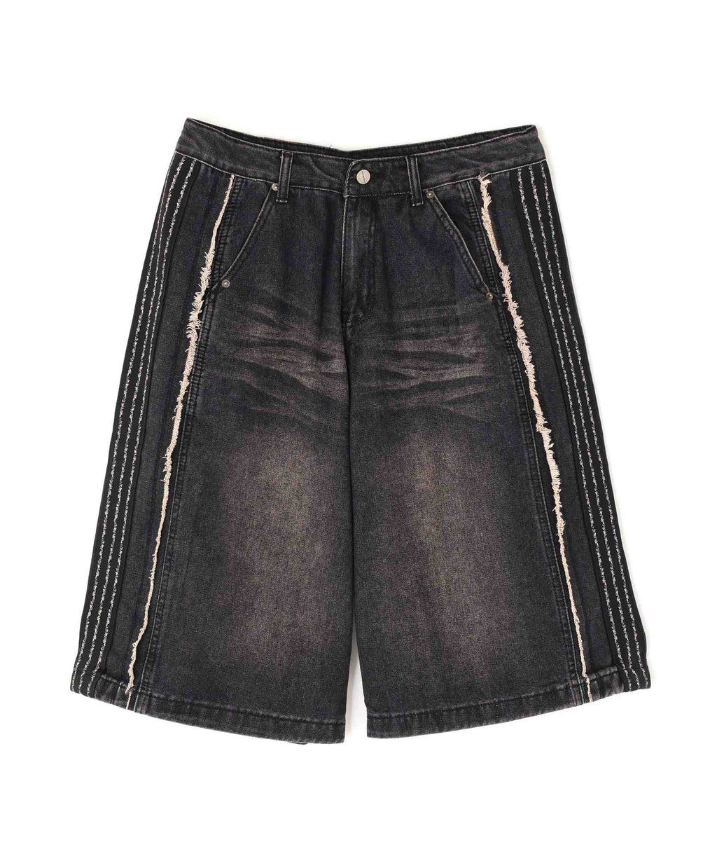 両サイドのラインテープとフリンジが目を惹くデニムショーツ。