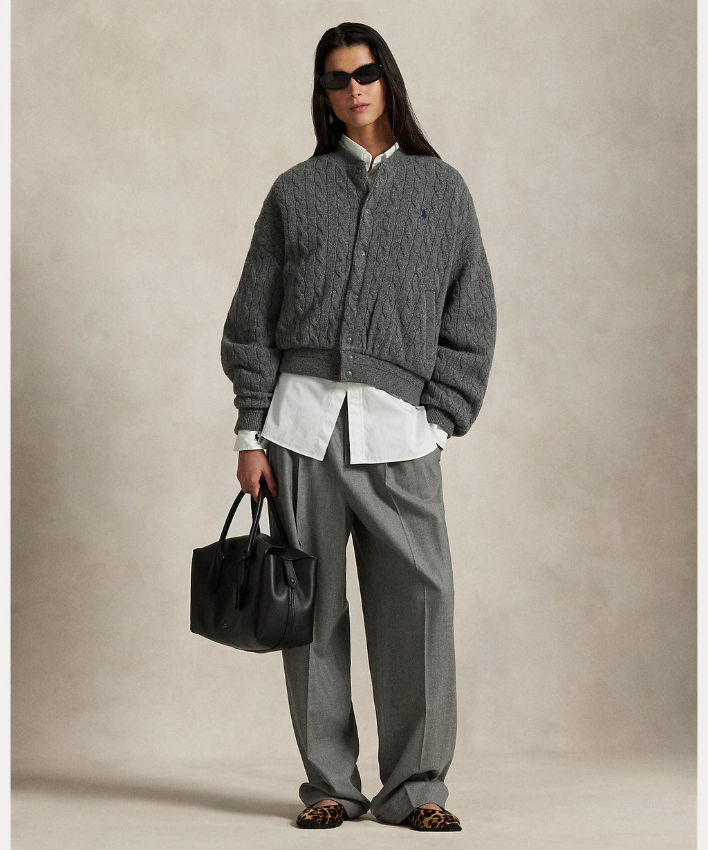 ボンバージャケットのゆったりとしたスタイルに、クラシックなケーブルニット構造を融合。ウールとカシミヤを使用し、ダイヤモンドキルティングの裏地を施した、薄めの中綿入りの重ね着アイテム。ポニー刺繍でシグネチャーの仕上がりをプラス。