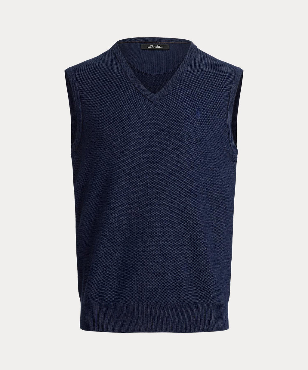 ピケステッチで編み上げ、さりげないテクスチャーを生み出したセーターベスト。蒸れにくいCoolmax(R)繊維を使用し、クールでドライ、快適な着心地をキープ