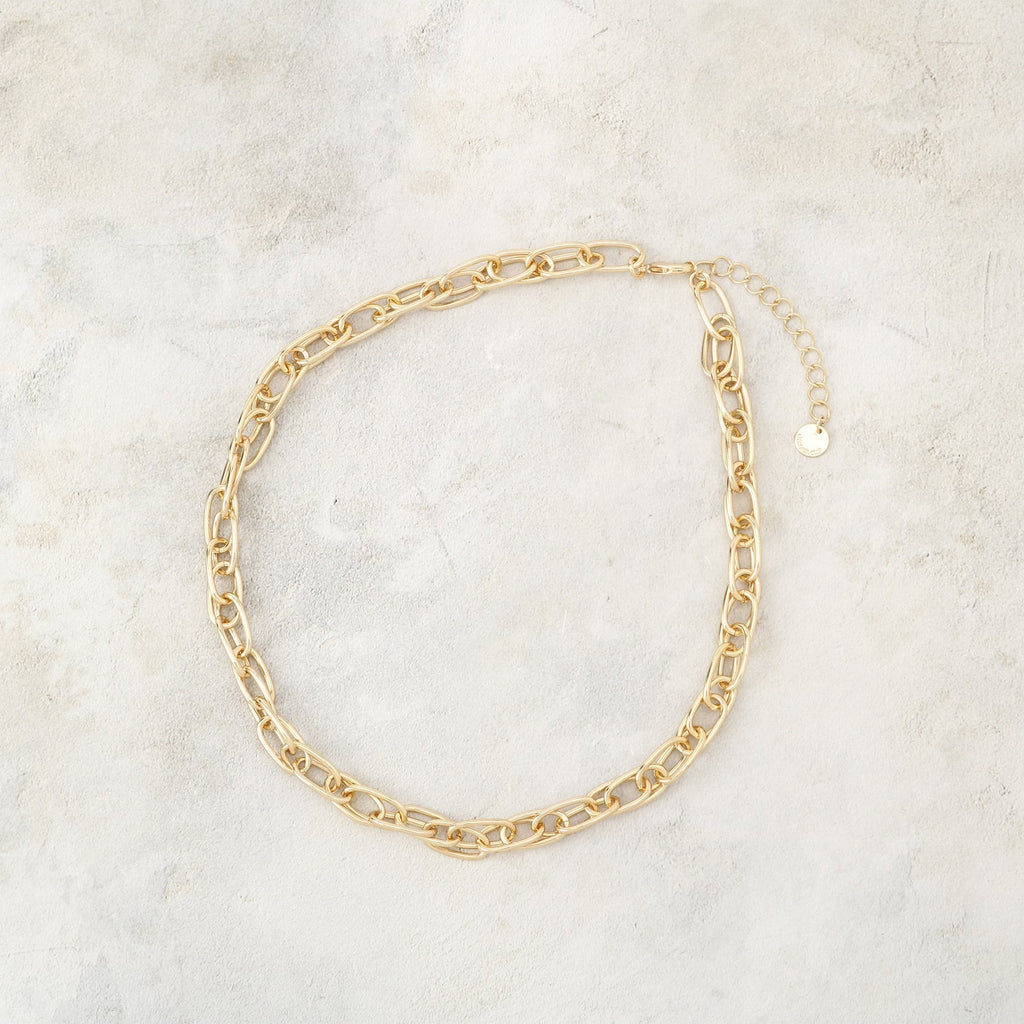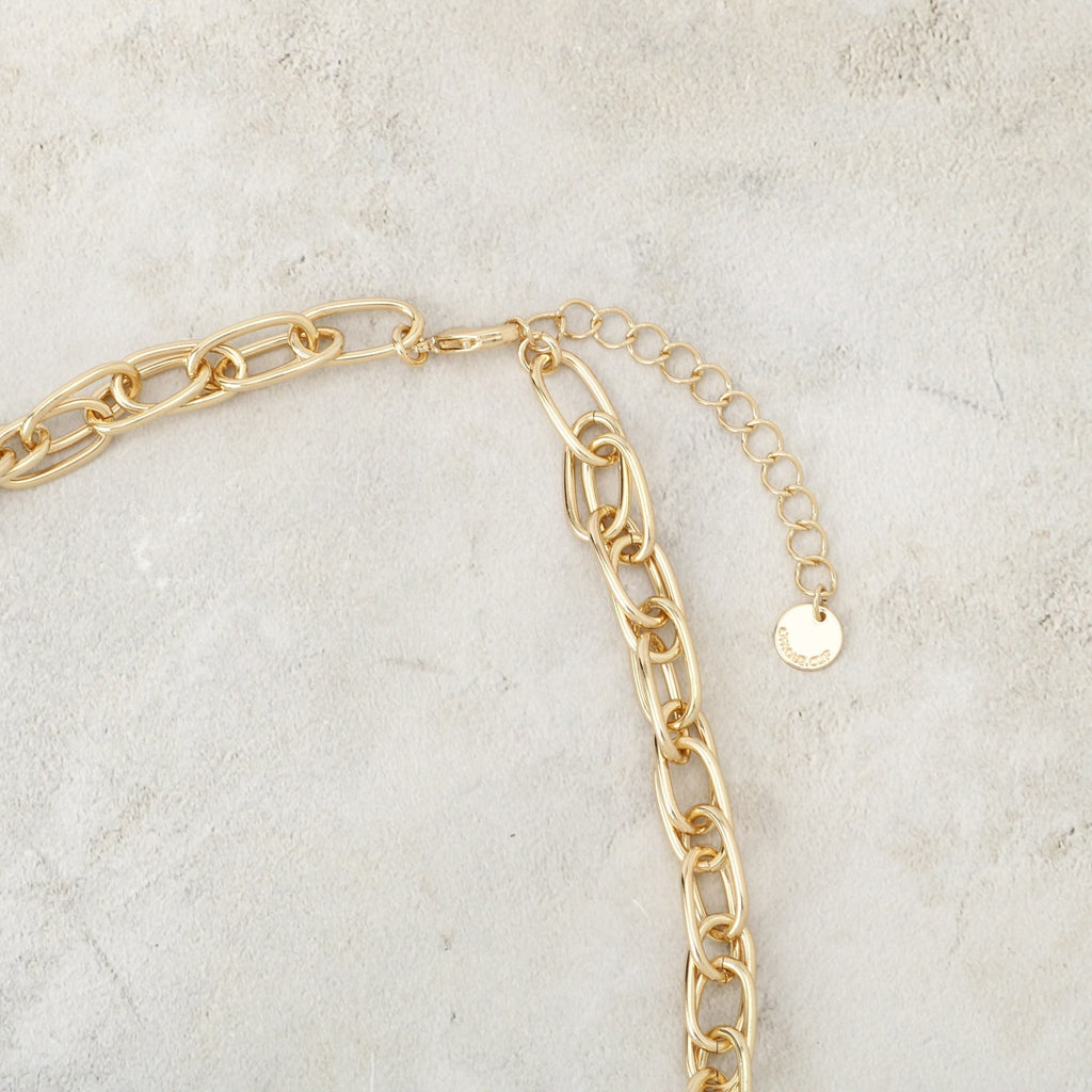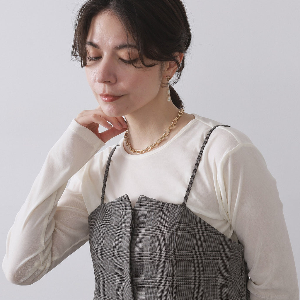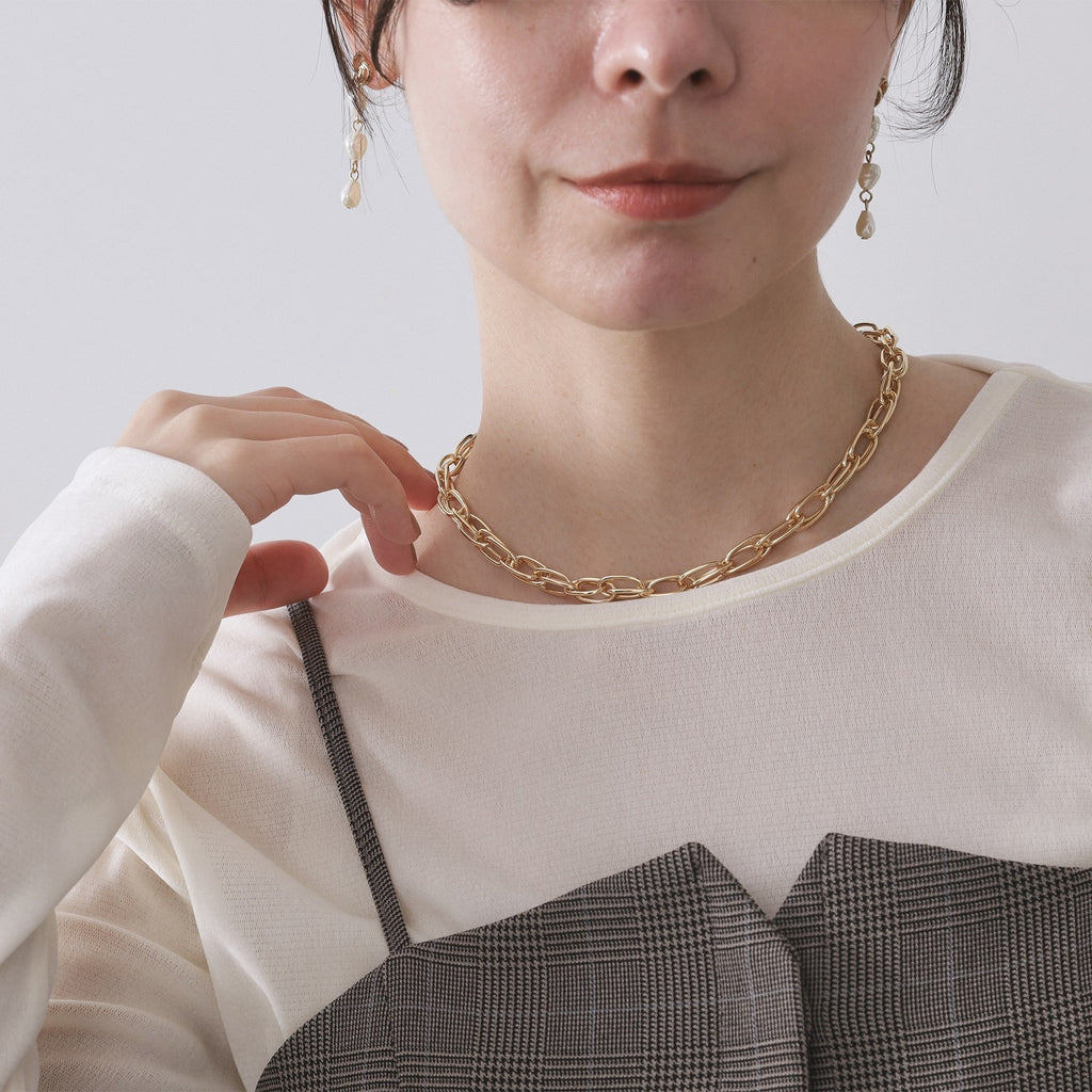丸みのあるチェーンがいくつも重なったデザインは、華奢すぎない程よいボリューム感で、スタイリングを選ばないアイテム。
