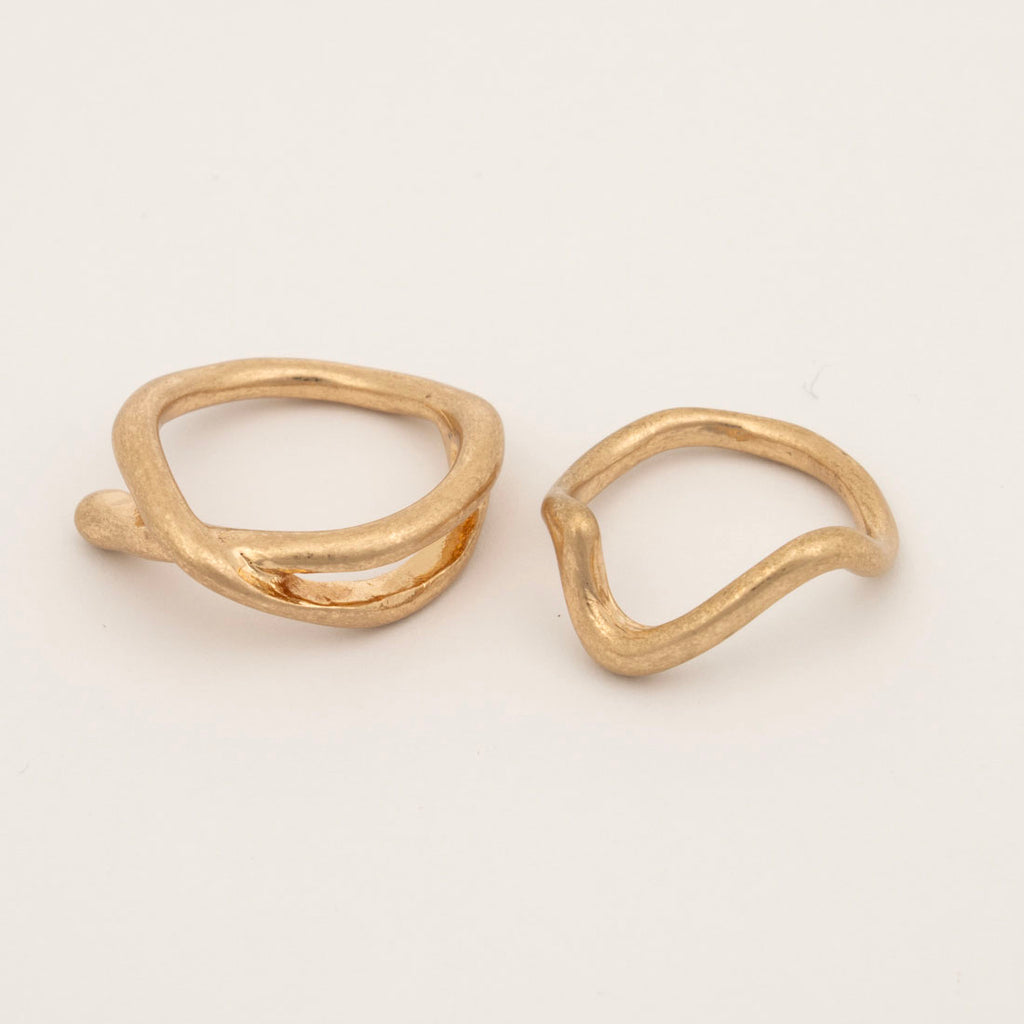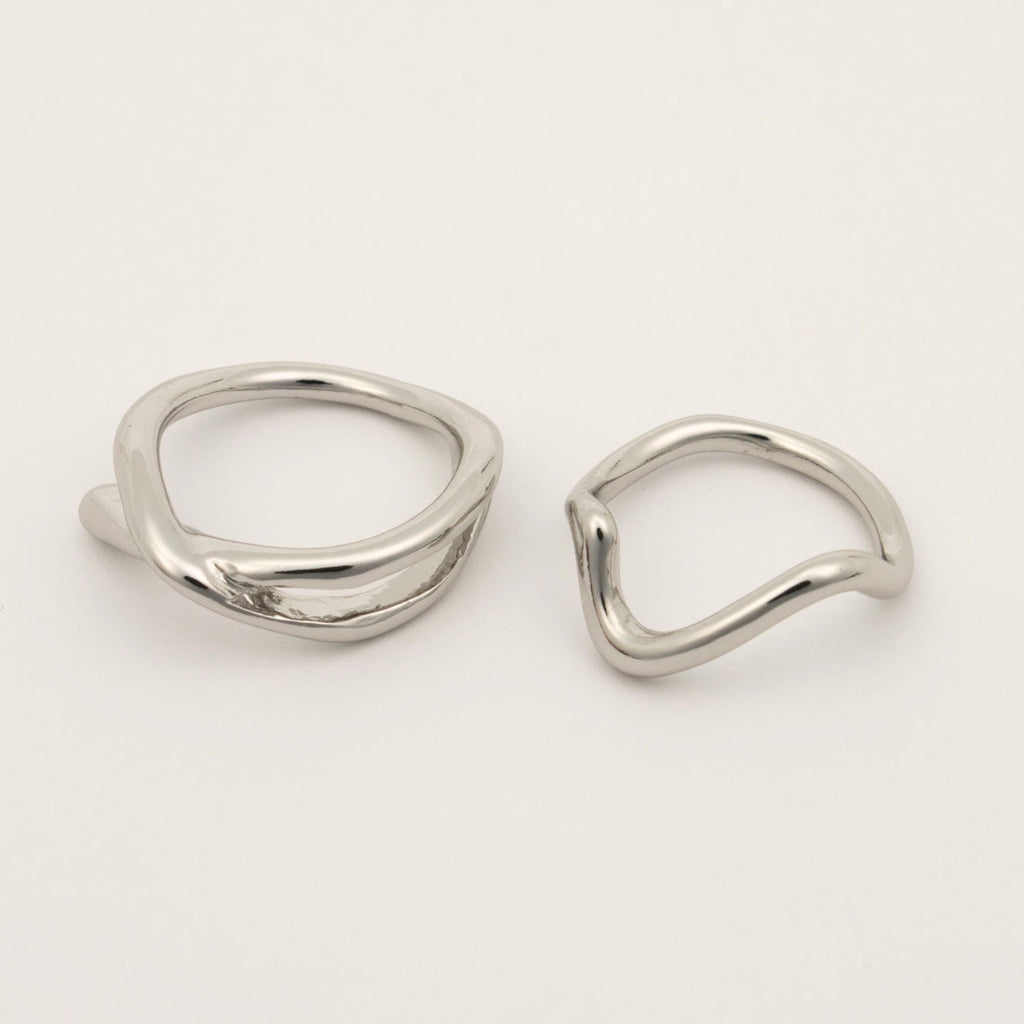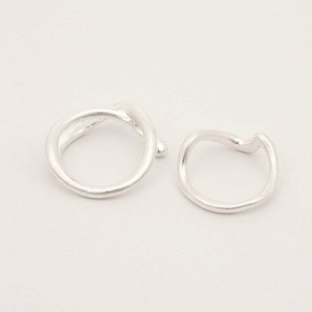 異なるフォルムのリングを組み合わせることで、1つでシンプルに、2つを重ね付けして存在感を出すなど、気分やコーディネートに合わせて楽しめるアイテムです。