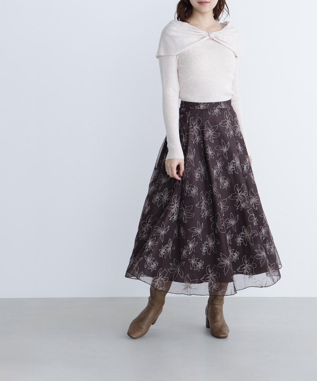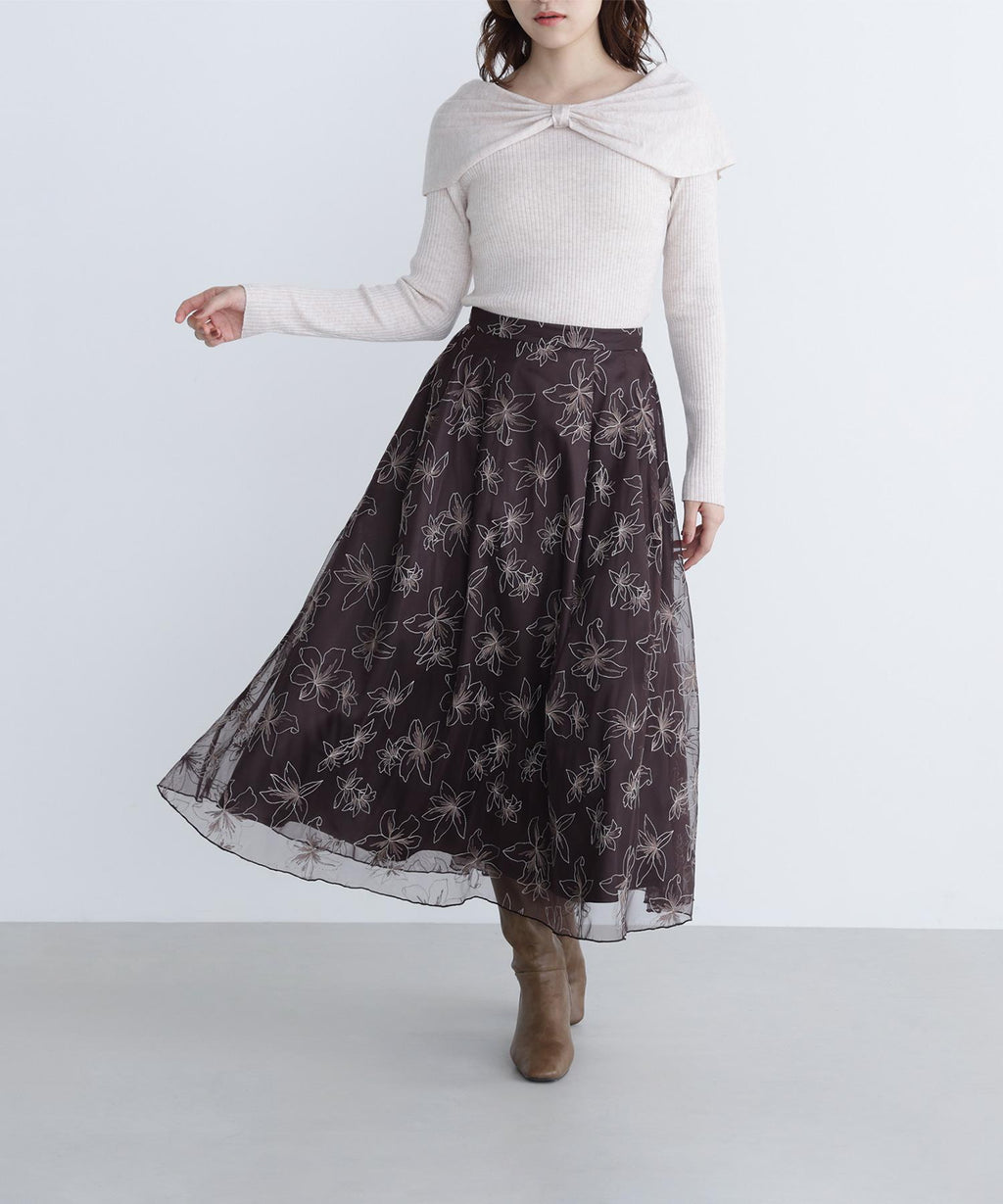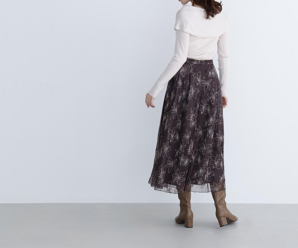 チュールにあしらった繊細な刺しゅうが映えるフレアスカート。ふんわり広がるフレアシルエットで、動くたびに優雅な雰囲気を演出します。ウエストは後ろファスナー仕様にして、ウエストまわりをすっきり見せながらきちんと感も両立。裏地には高級感あふれるサテンを使用しています。トップス次第でオンにもオフシーンにも着回せます。