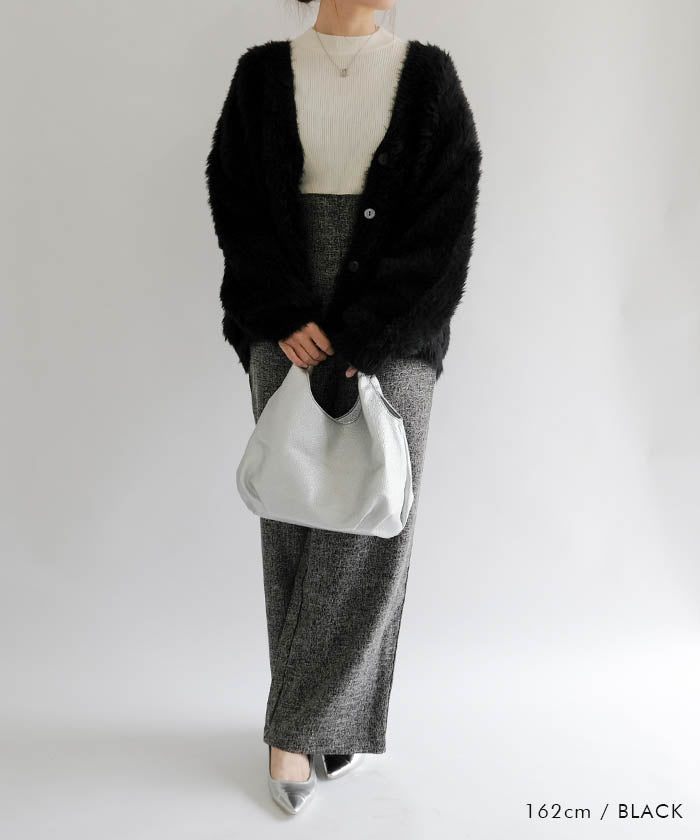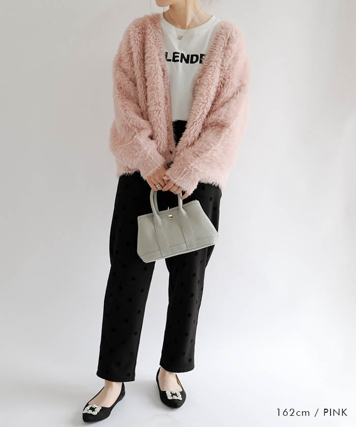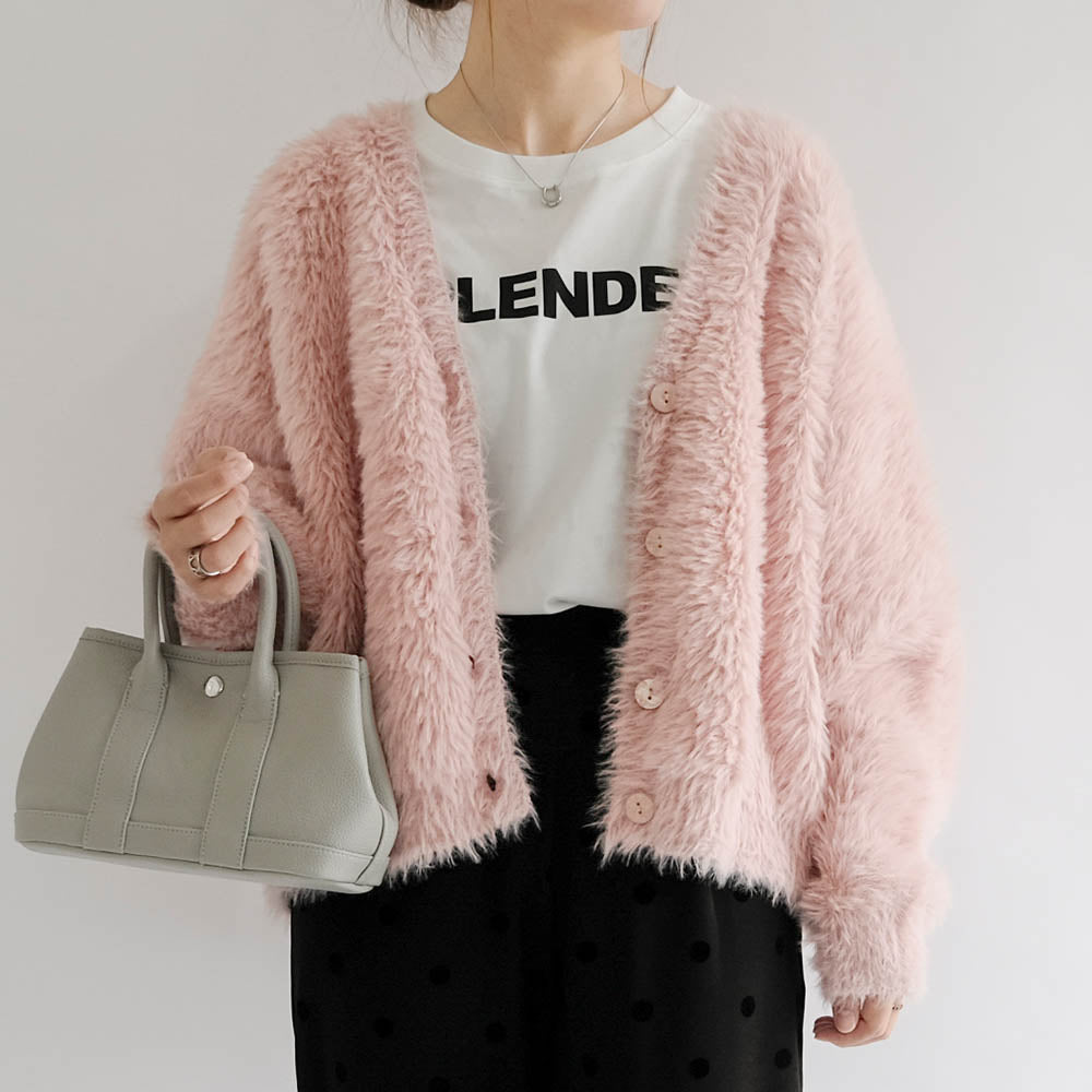 フェザーのふんわり感が主役になるカーディガンなので、合わせるアイテムはシンプルでも十分華やか。