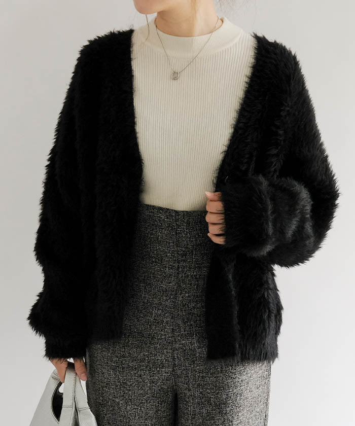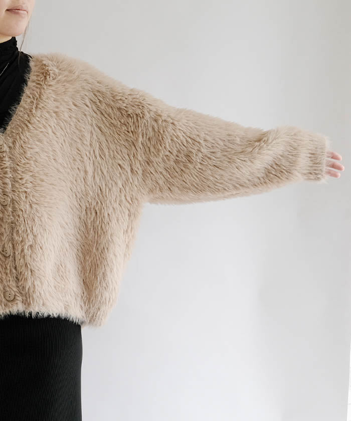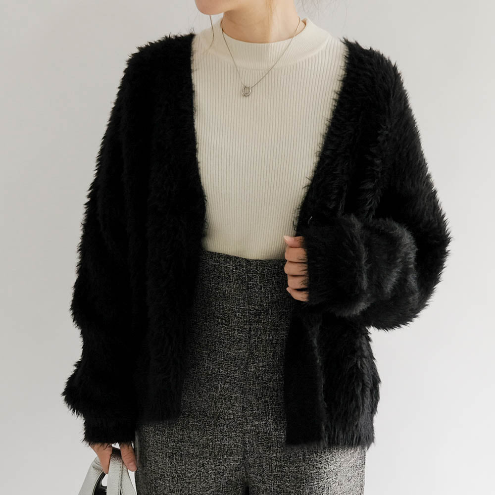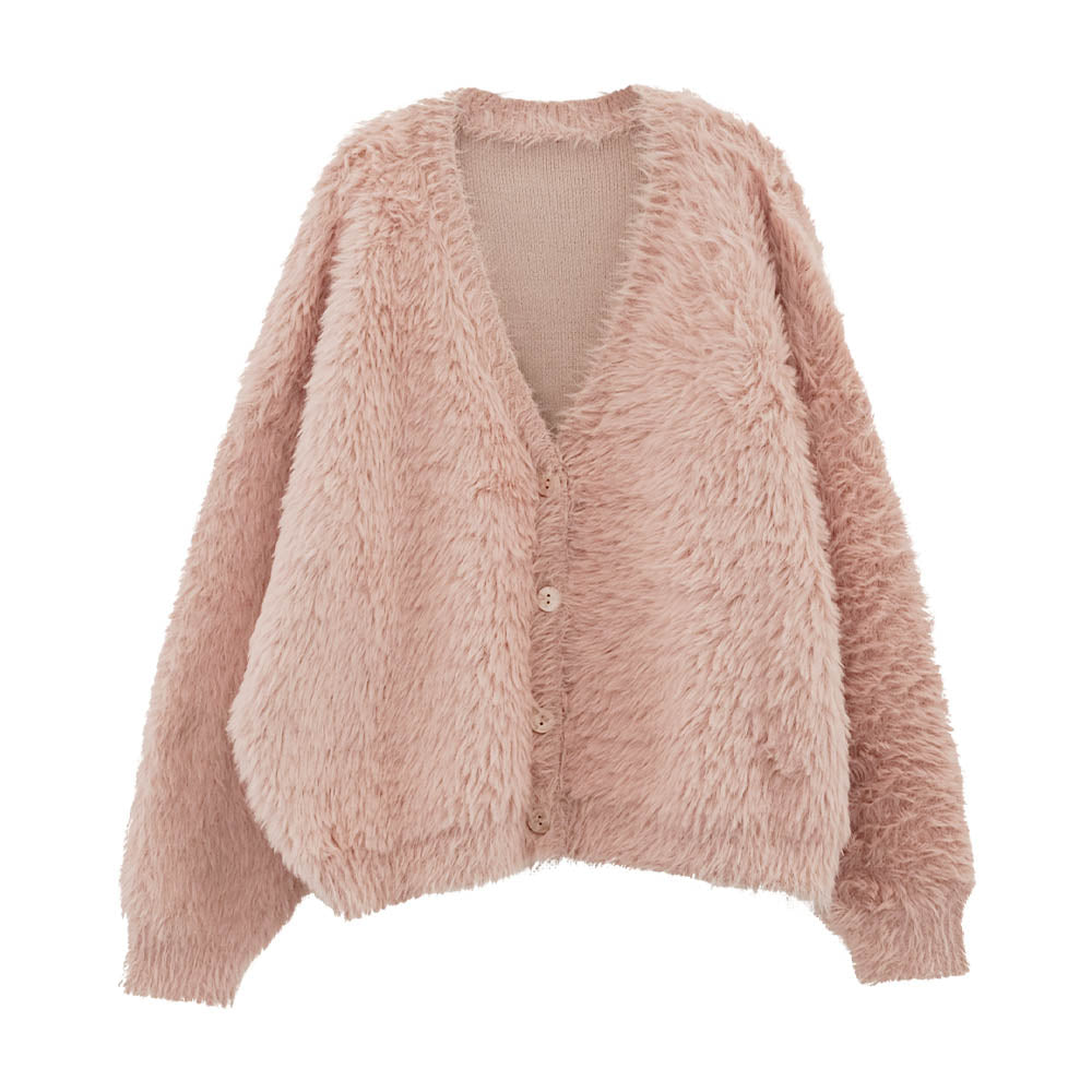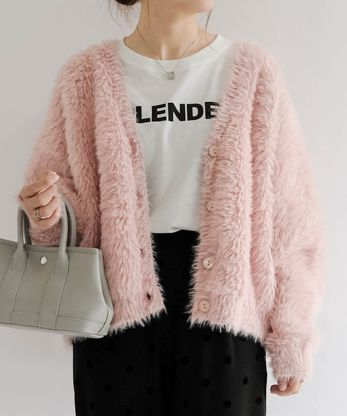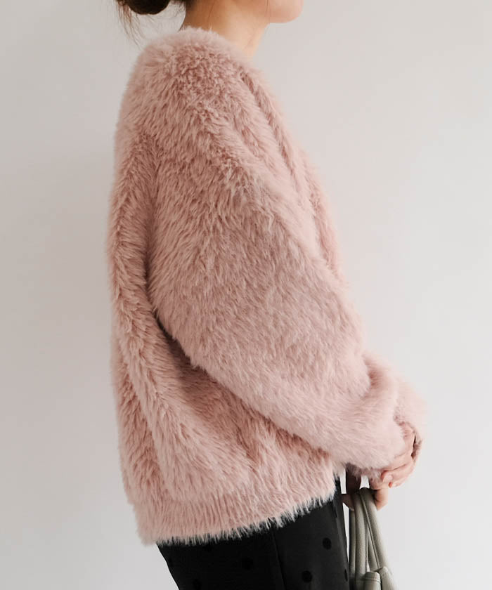思わず触れたくなるような、ふわふわとしたフェザー素材が魅力のニットカーディガン。