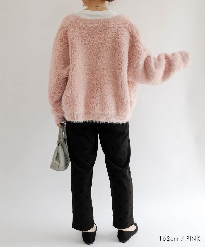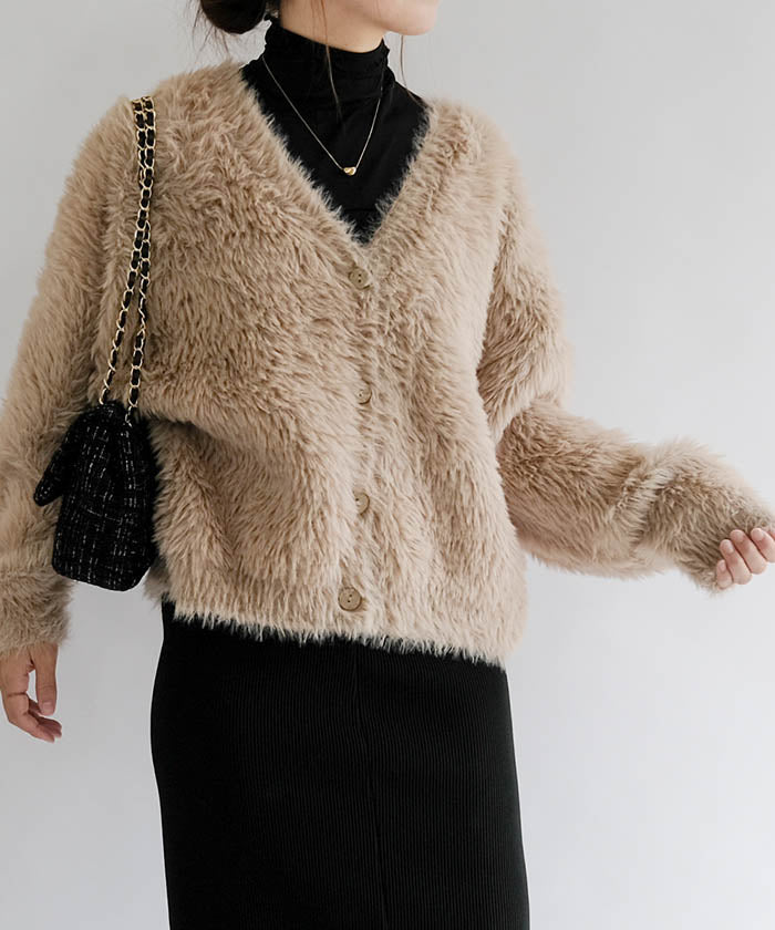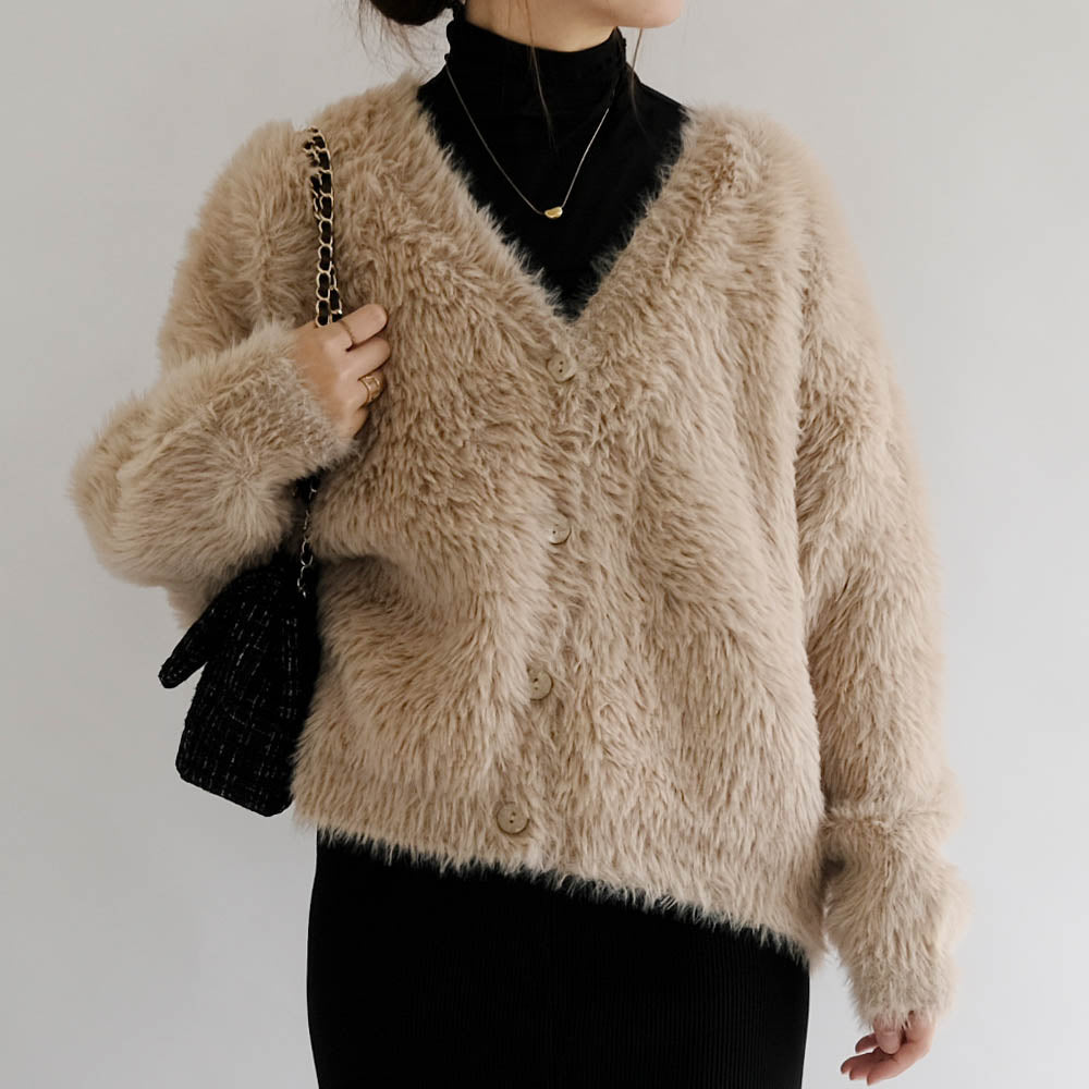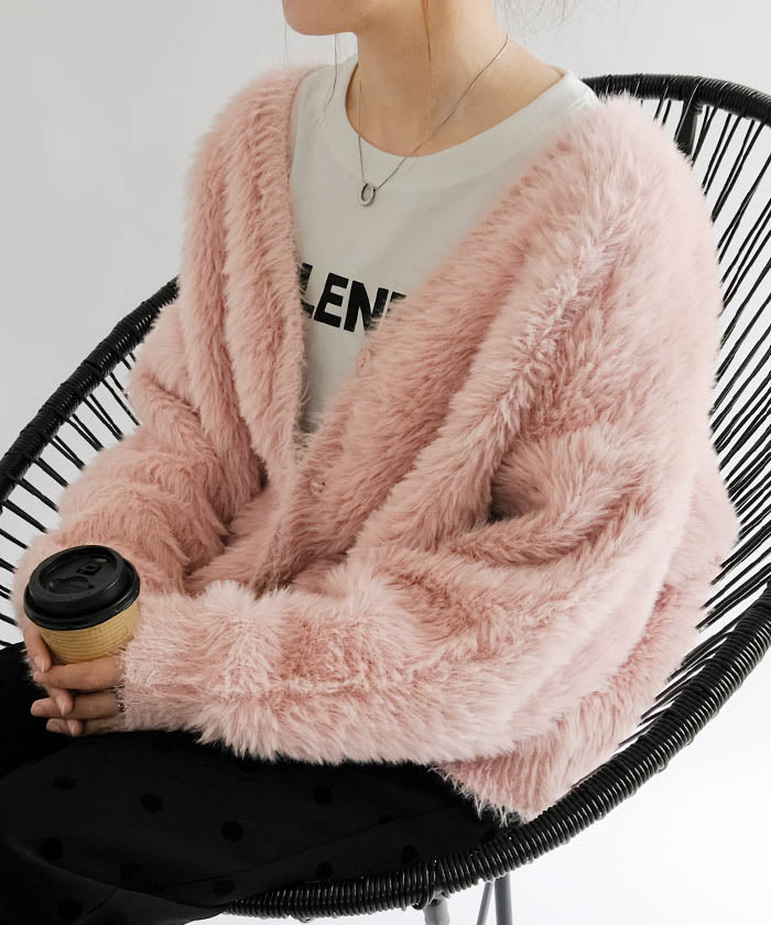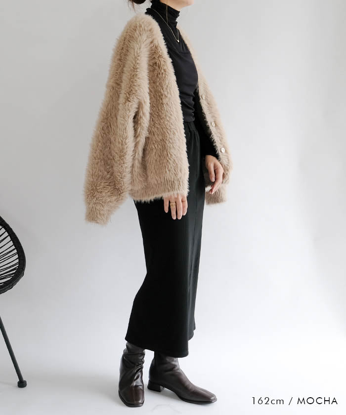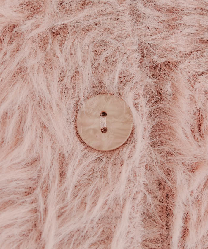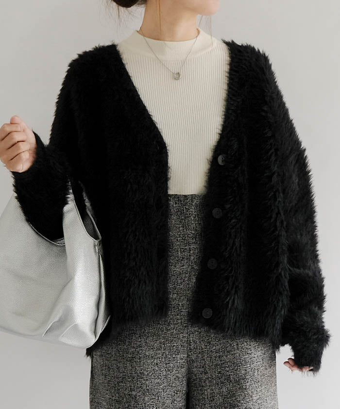 思わず触れたくなるような、ふわふわとしたフェザー素材が魅力のニットカーディガン。