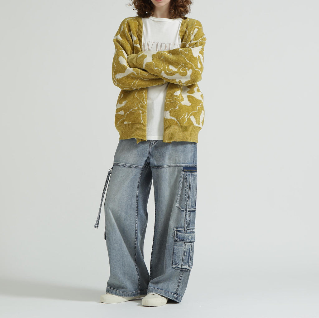 ・大胆なカモフラージュ柄が印象的な、Vネックのニットカーディガン