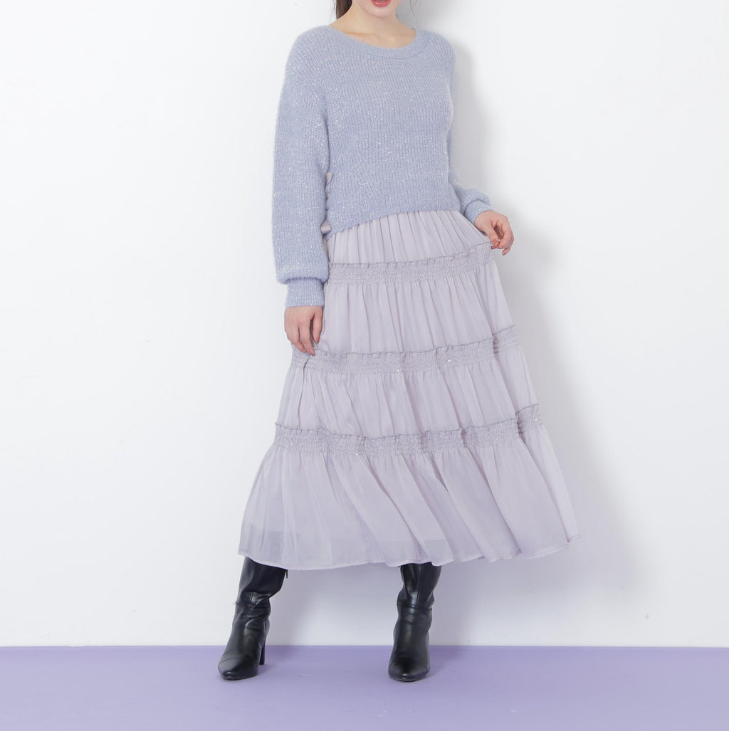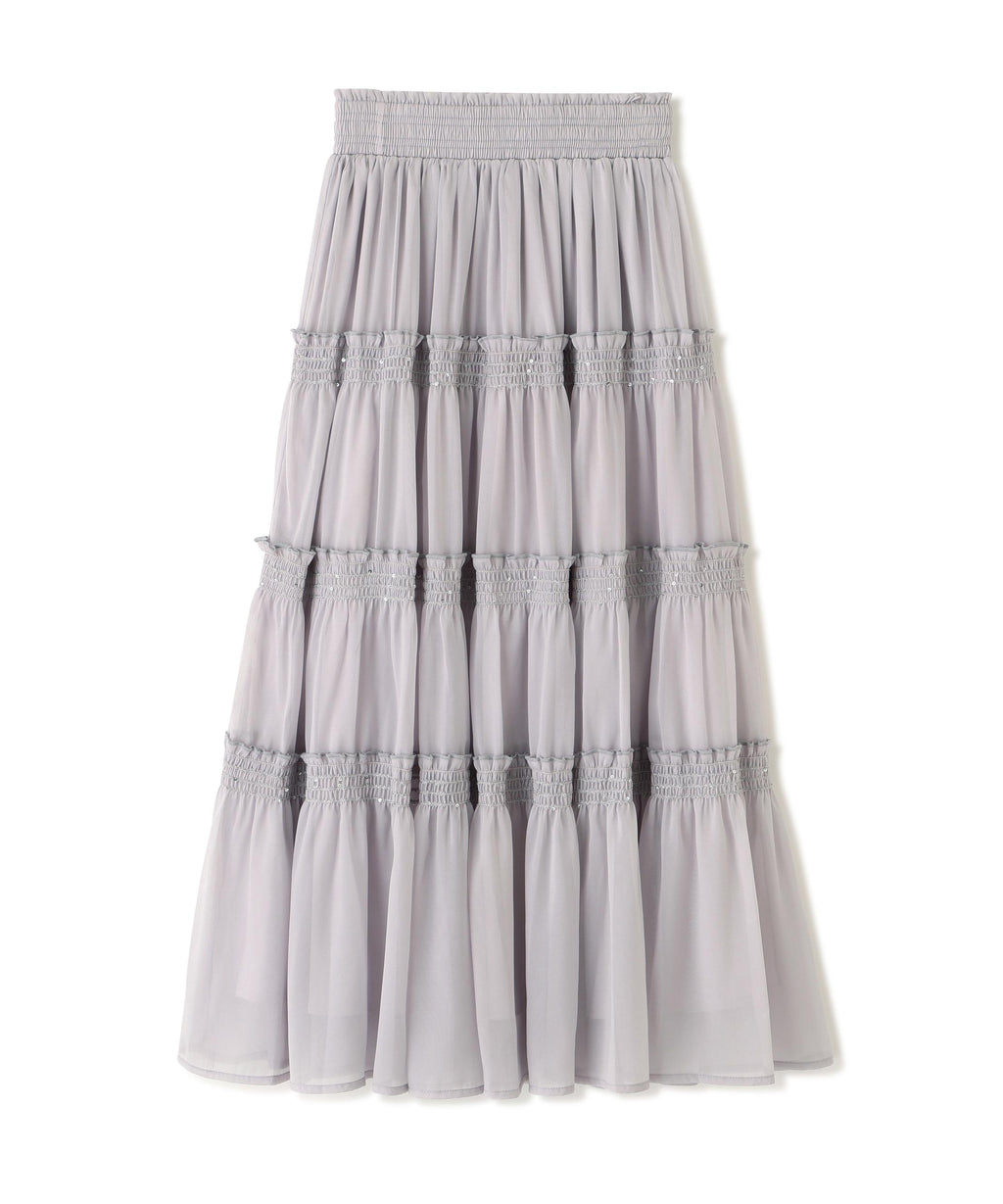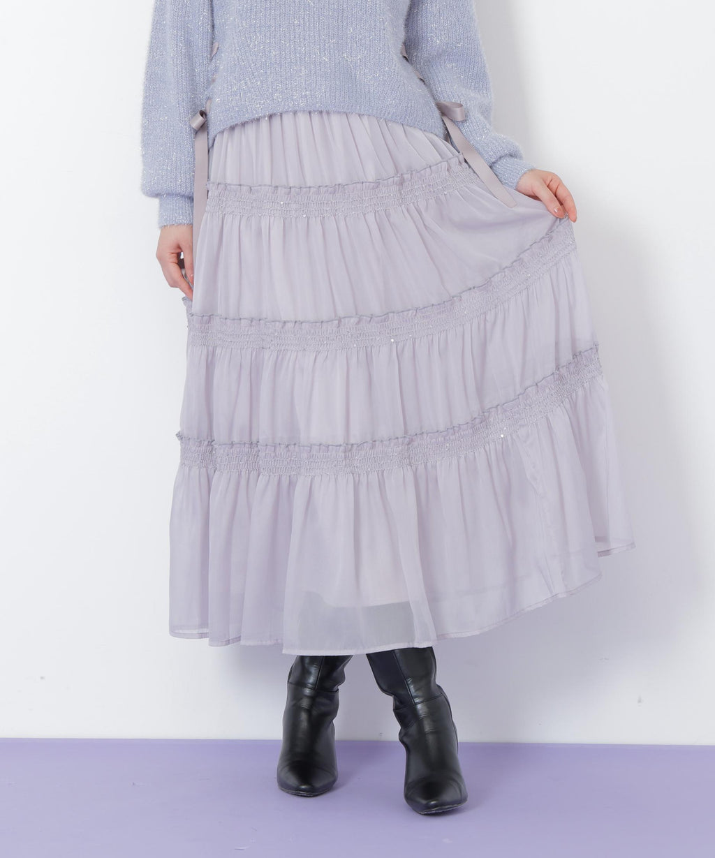 光沢感のある素材とスパンコールとシャーリングによるギャザーが華やかなティアードスカート。動くたびにきらめき、エレガントで女性らしい印象に見せてくれます。シンプルなトップスと合わせるだけで華やかなスタイルが完成。デイリーはもちろん、パーティーやお呼ばれシーンにもおすすめです。※撮影時照明の関係により、色味が違って見える場合がございます。