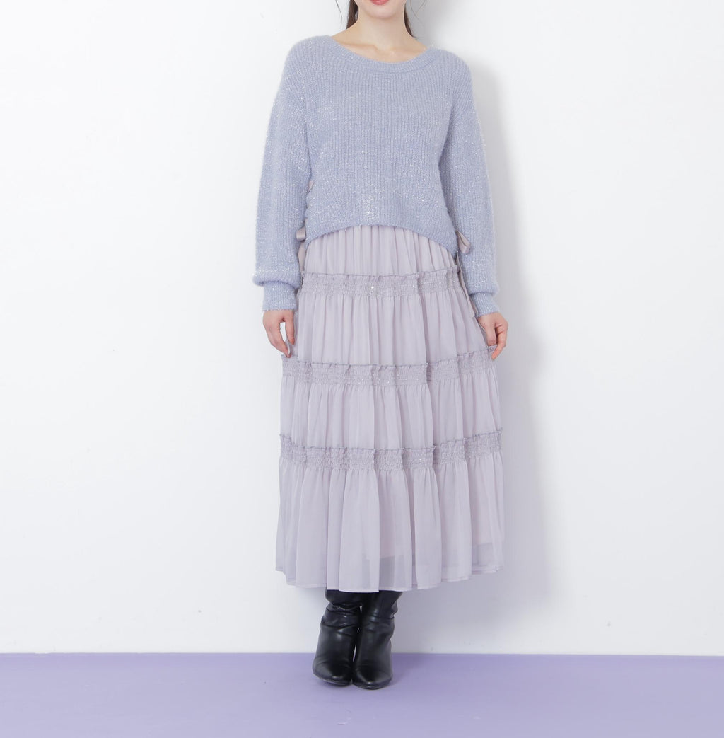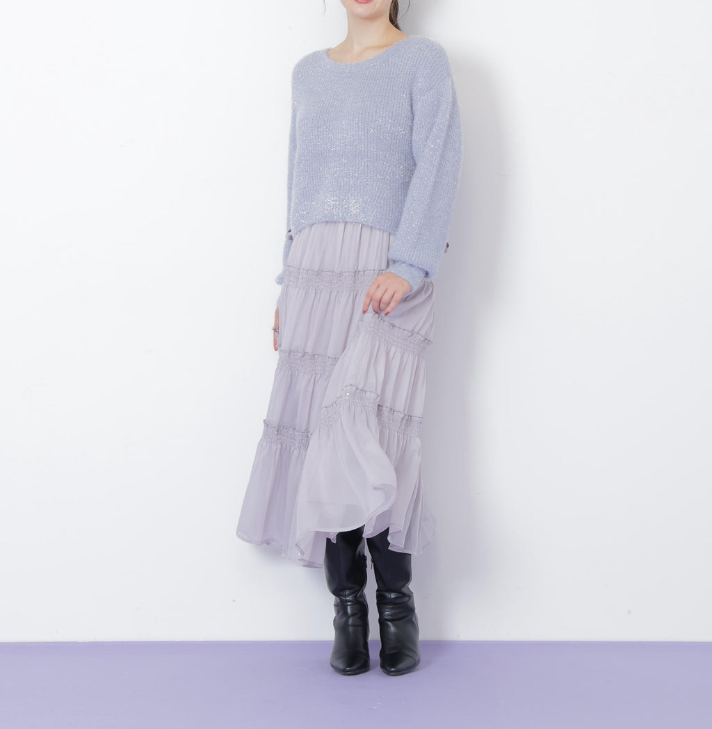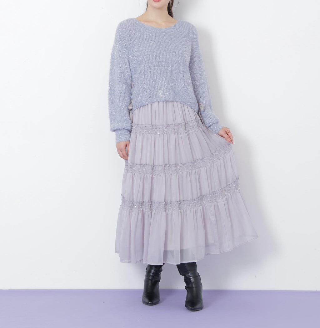 光沢感のある素材とスパンコールとシャーリングによるギャザーが華やかなティアードスカート。動くたびにきらめき、エレガントで女性らしい印象に見せてくれます。シンプルなトップスと合わせるだけで華やかなスタイルが完成。デイリーはもちろん、パーティーやお呼ばれシーンにもおすすめです。※撮影時照明の関係により、色味が違って見える場合がございます。