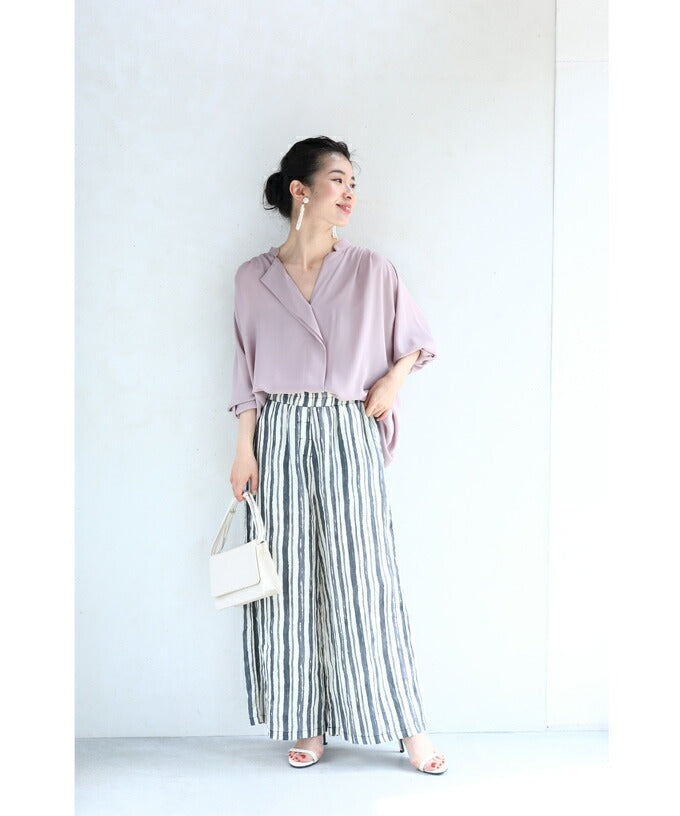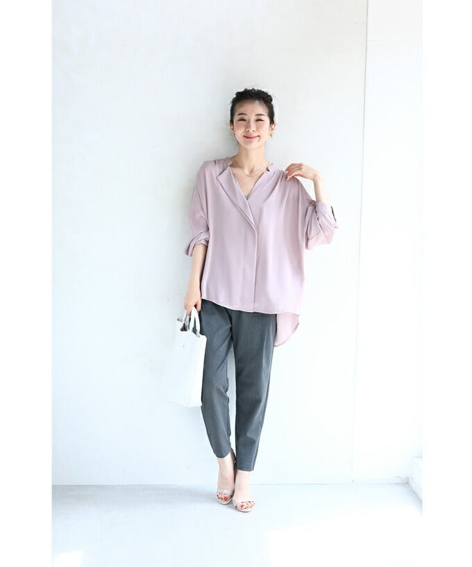 片側のみに襟をあしらったアシンメトリーなVネックデザインが特徴。