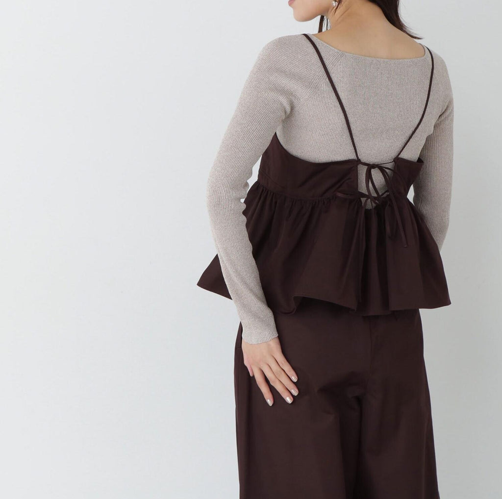 後ろ姿も可愛らしいバックリボン付きのキャミソールは、肩紐で長さ調節が可能。ふんわり広がるペプラムシルエットも今年らしいポイント。中にシアートップスや半袖ニットなどレイヤードできる仕様。同じ素材のパンツを揃えていただくと、セットアップコーディネートも楽しめます。