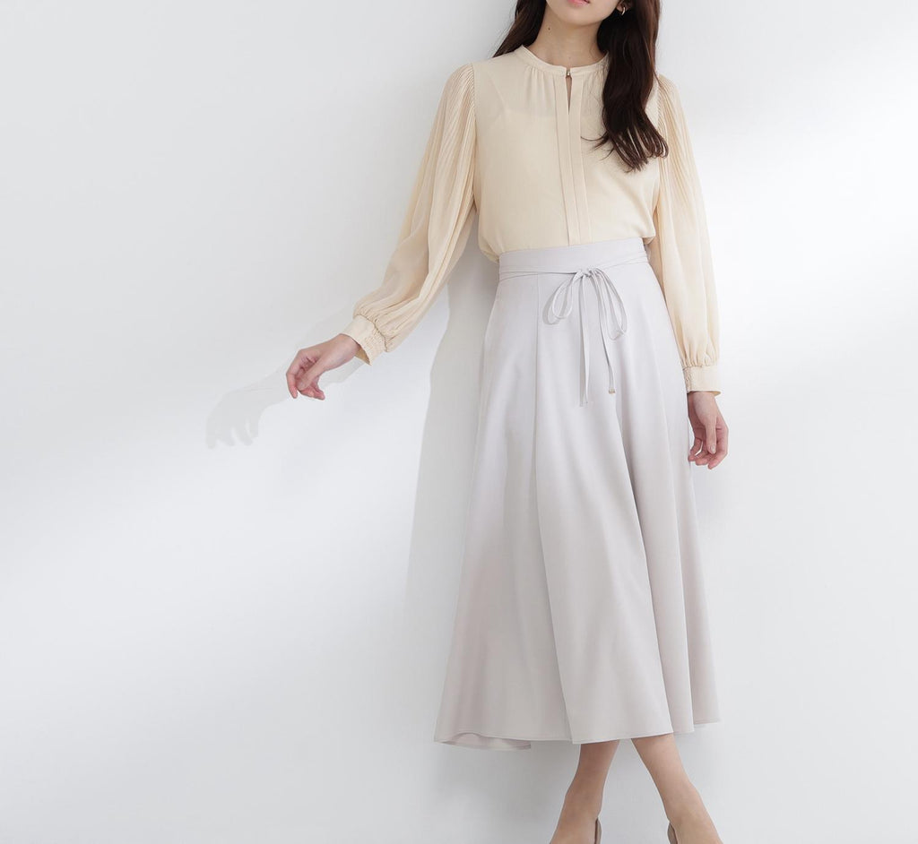 上品な揺れ感とすっきりとしたシルエットが魅力のフレアスカート。ウエストにあしらった細めのナローリボンが控えめなアクセントとなり、華やかになりすぎず大人の女性らしさを演出。程よく広がるフレアラインは脚をきれいに見せてくれるので、オフィスでも端正なスタイルを叶えます。キレイめブラウスやニットとも相性が良く、通勤から上品なデイリースタイルまで幅広く活躍してくれます。