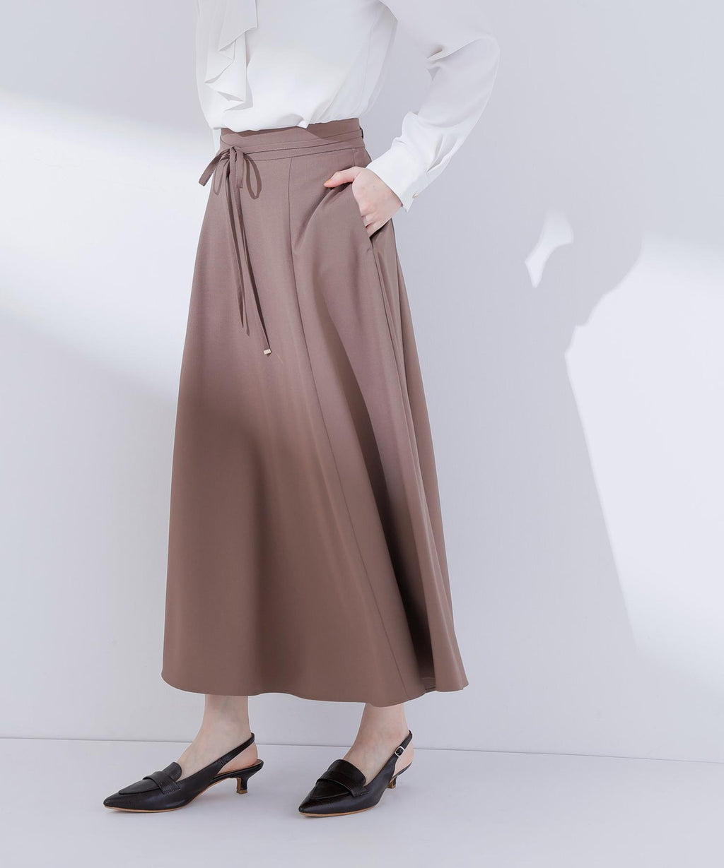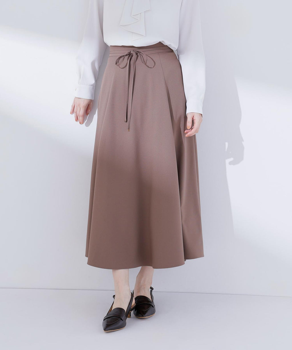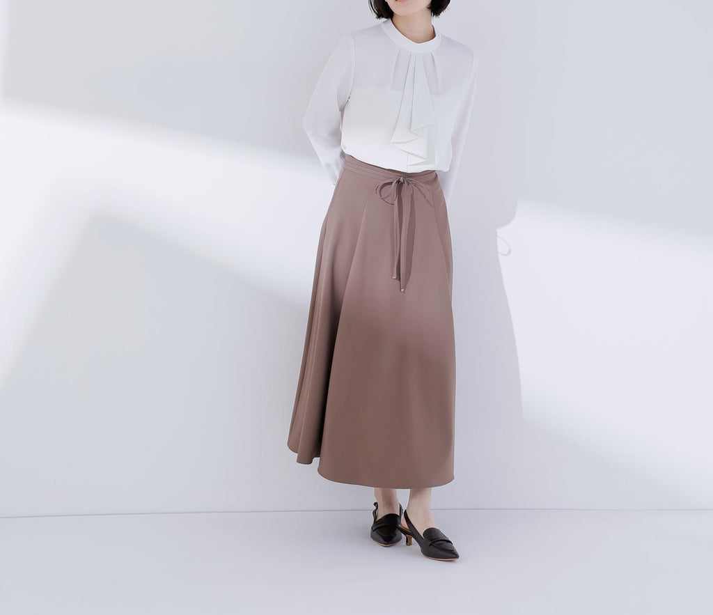 上品な揺れ感とすっきりとしたシルエットが魅力のフレアスカート。ウエストにあしらった細めのナローリボンが控えめなアクセントとなり、華やかになりすぎず大人の女性らしさを演出。程よく広がるフレアラインは脚をきれいに見せてくれるので、オフィスでも端正なスタイルを叶えます。キレイめブラウスやニットとも相性が良く、通勤から上品なデイリースタイルまで幅広く活躍してくれます。