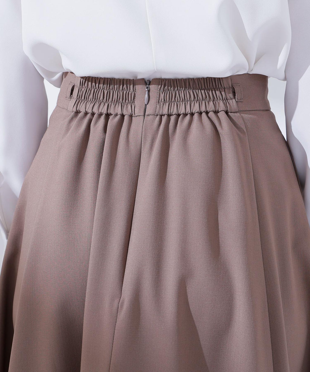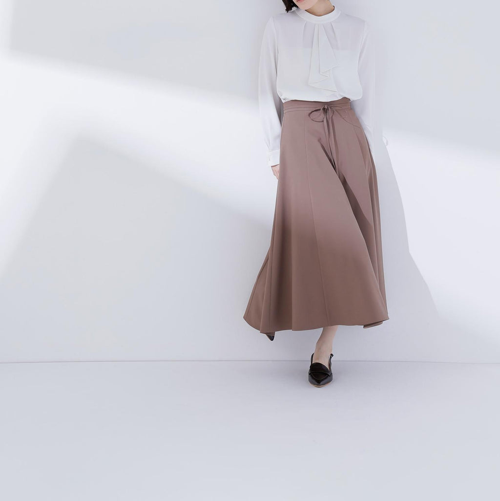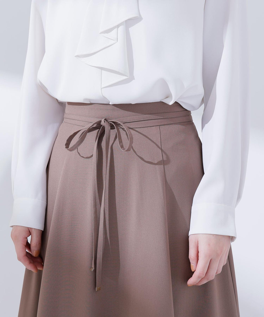 上品な揺れ感とすっきりとしたシルエットが魅力のフレアスカート。ウエストにあしらった細めのナローリボンが控えめなアクセントとなり、華やかになりすぎず大人の女性らしさを演出。程よく広がるフレアラインは脚をきれいに見せてくれるので、オフィスでも端正なスタイルを叶えます。キレイめブラウスやニットとも相性が良く、通勤から上品なデイリースタイルまで幅広く活躍してくれます。