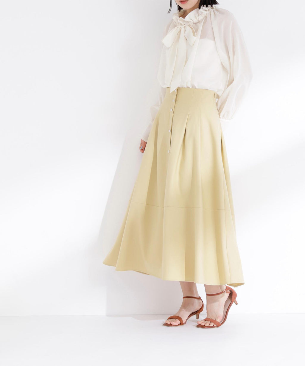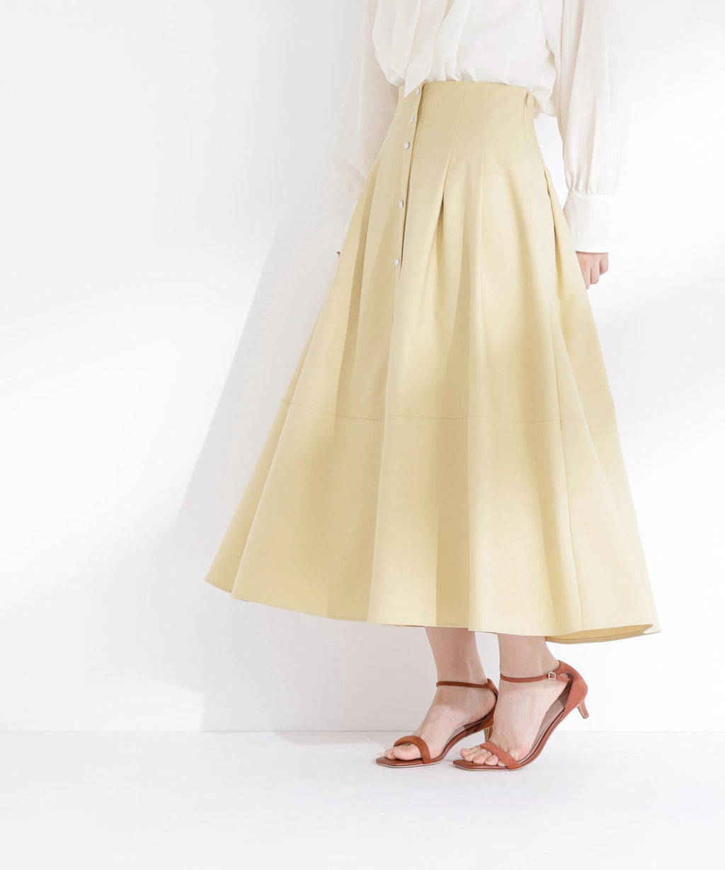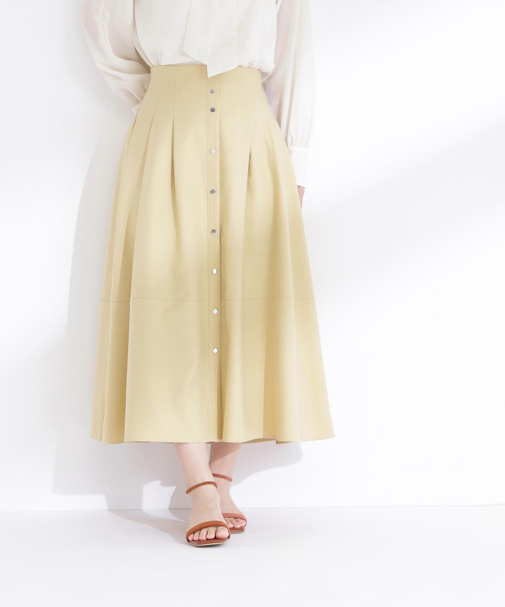 フロントのメタルボタンがアクセントになったフレアスカート。すっきりとしたハイウエストデザインで、スタイルアップ効果を期待できます。腰まわりがきれいに見えるシルエットが魅力。カジュアルにもお仕事シーンにも着回せるデザインです。前ボタンは見せかけ仕様で、ウエストラインが広がらないディテールに。裾部分は本開きにして足さばき良く仕上げています。