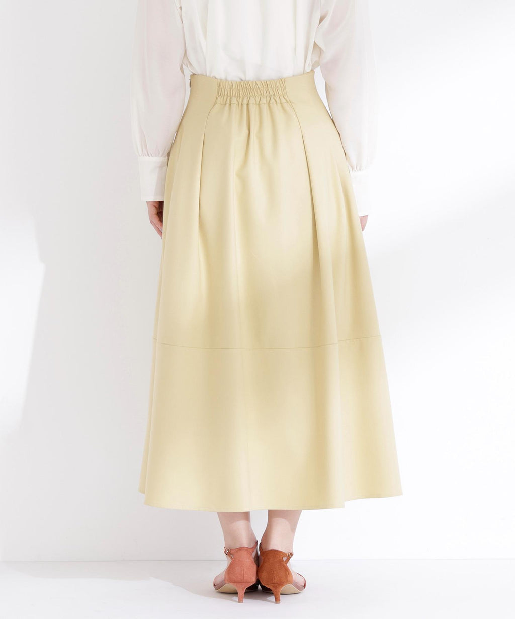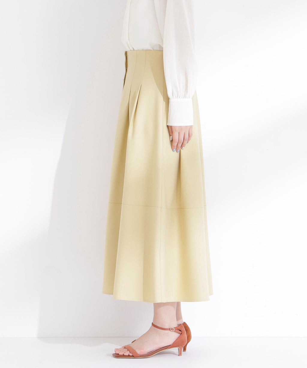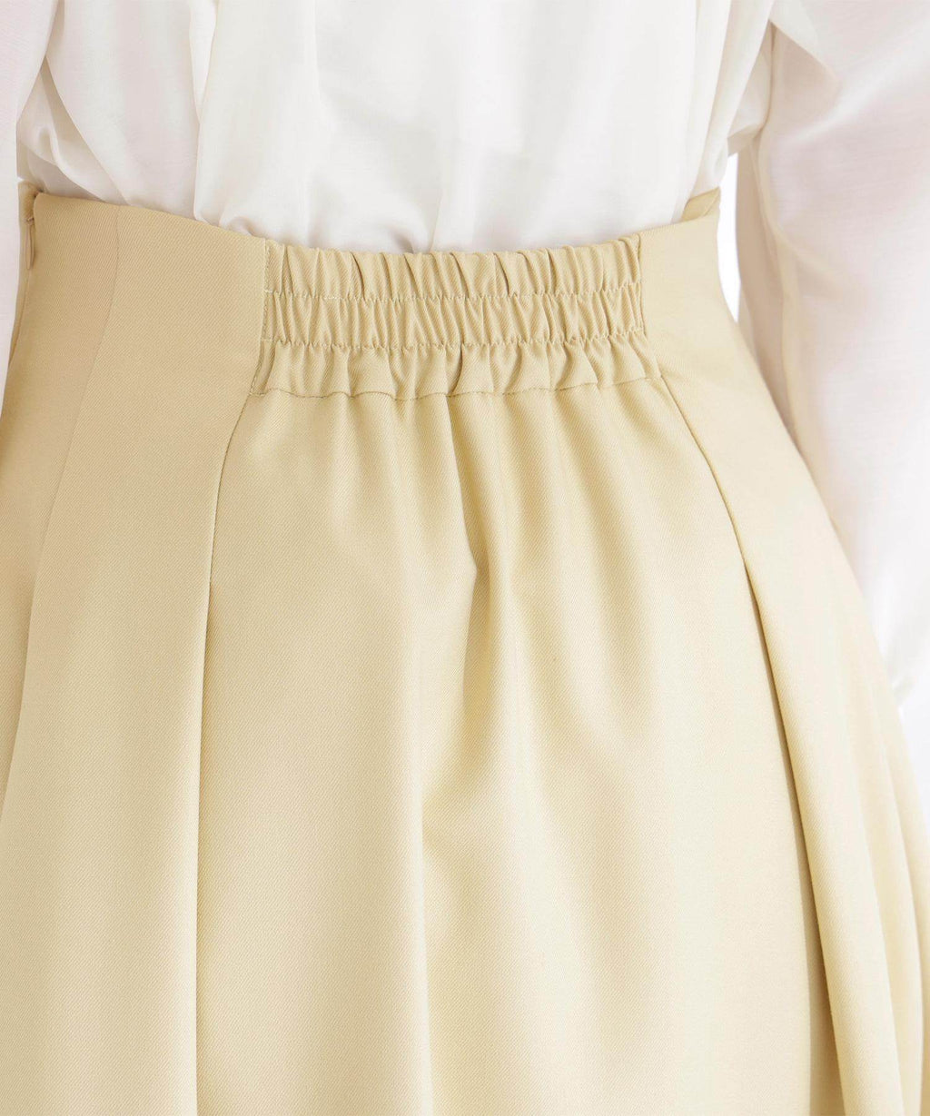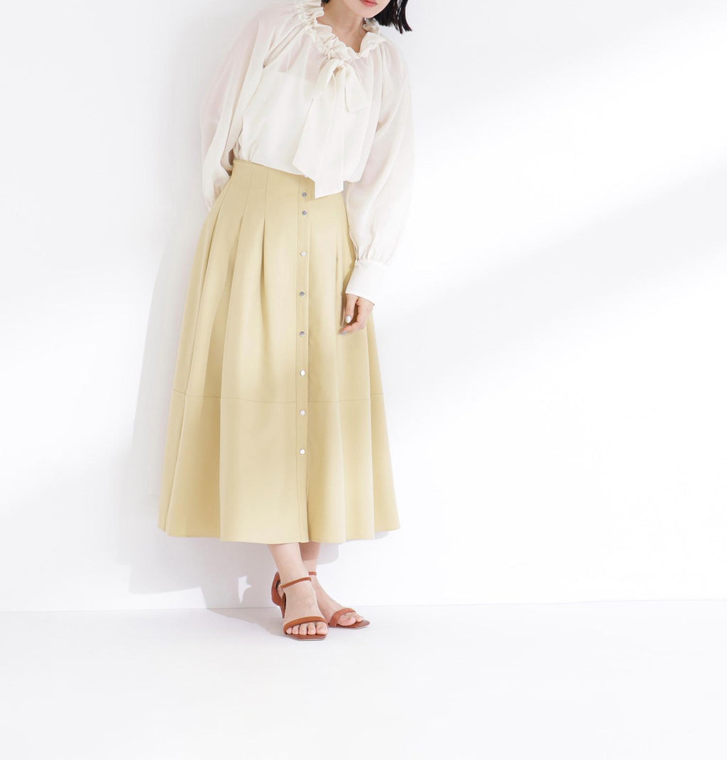 フロントのメタルボタンがアクセントになったフレアスカート。すっきりとしたハイウエストデザインで、スタイルアップ効果を期待できます。腰まわりがきれいに見えるシルエットが魅力。カジュアルにもお仕事シーンにも着回せるデザインです。前ボタンは見せかけ仕様で、ウエストラインが広がらないディテールに。裾部分は本開きにして足さばき良く仕上げています。