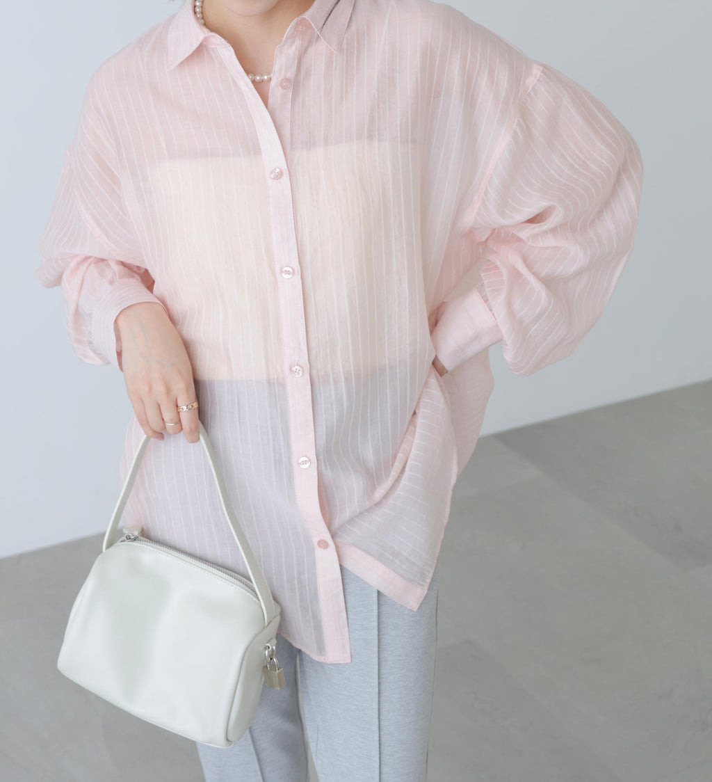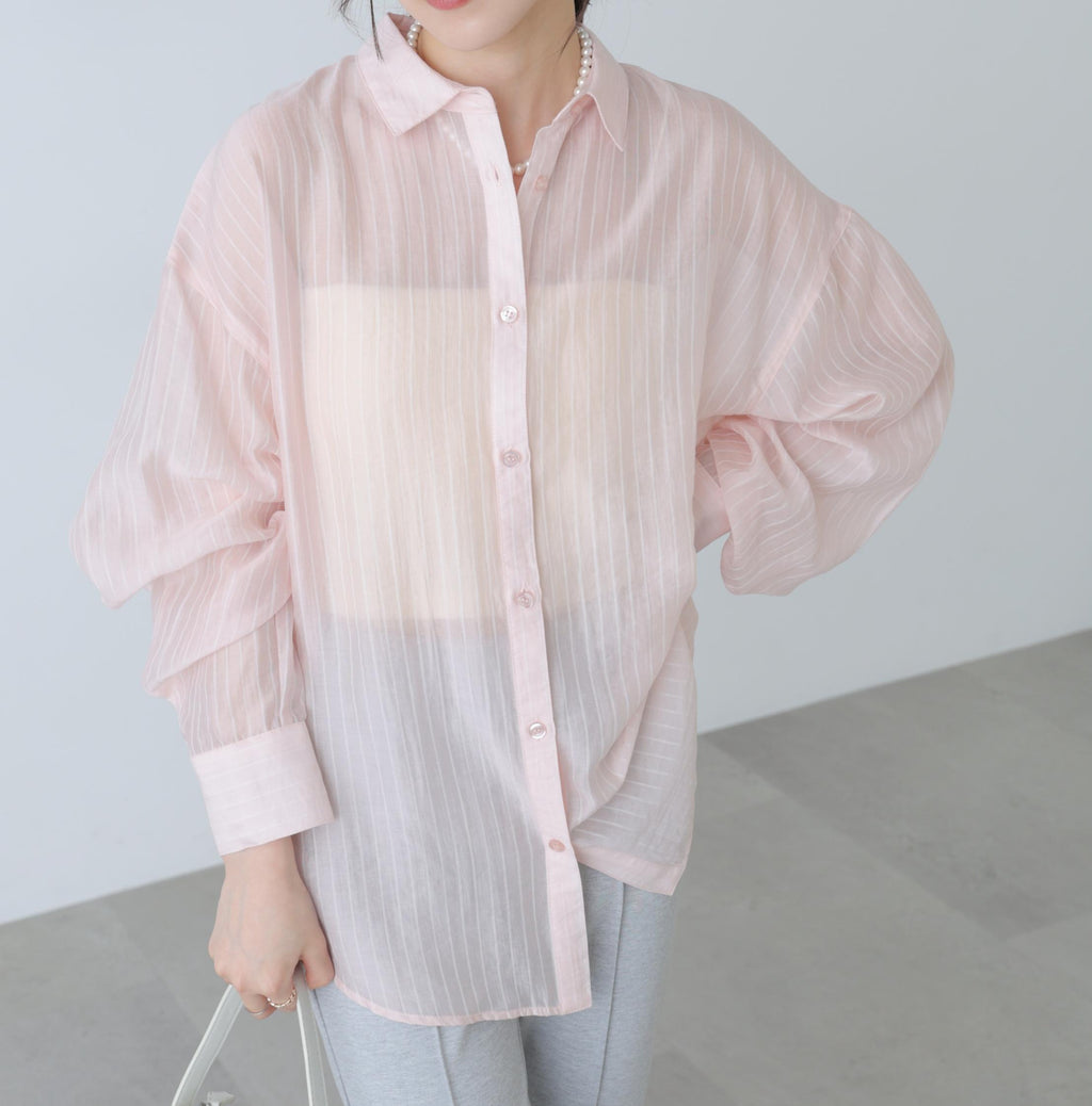 毎年ご好評のシアーシャツが、細いダブルストライプにリニューアル!マニッシュになりがちなストライプ柄も、シアー素材で女性らしく着られます。爽やかなカラーと程よいオーバーシルエットで抜け感を演出。デニム×タンクトップの上からラフに羽織るだけで、こなれ感のあるスタイルが完成。薄手なのでビスチェのインナーとしてもおすすめです。