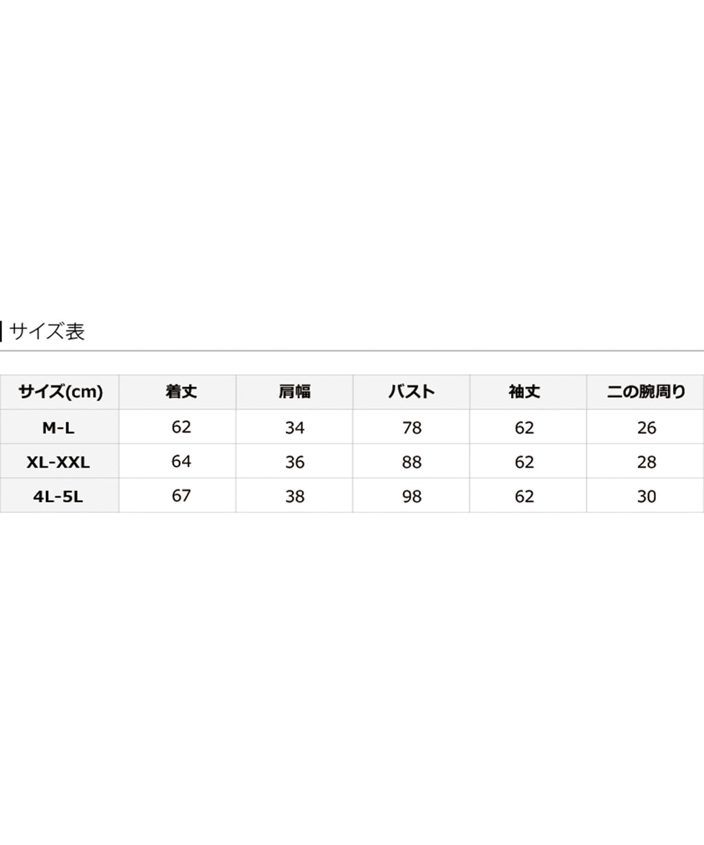 XL-XXL/LL : 着丈:64cm, 肩幅:36cm, 胸囲:88cm, 袖丈:62cm