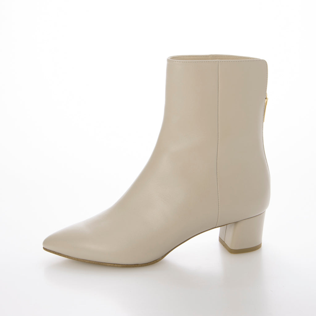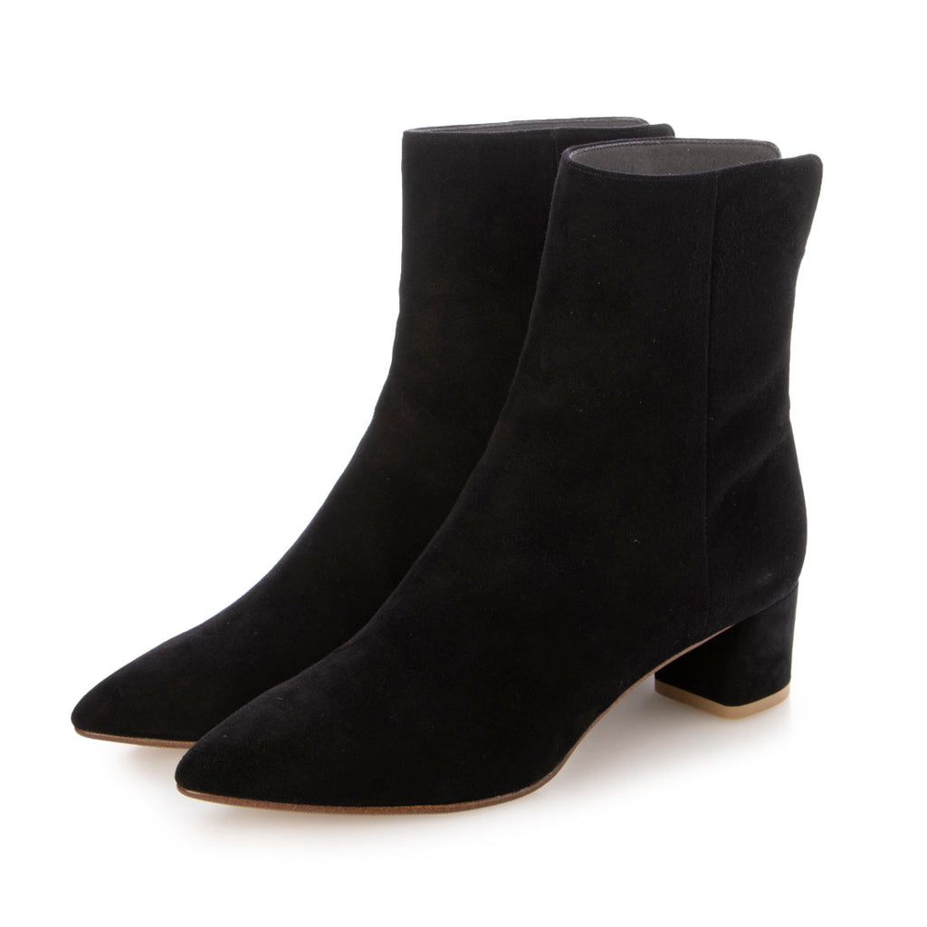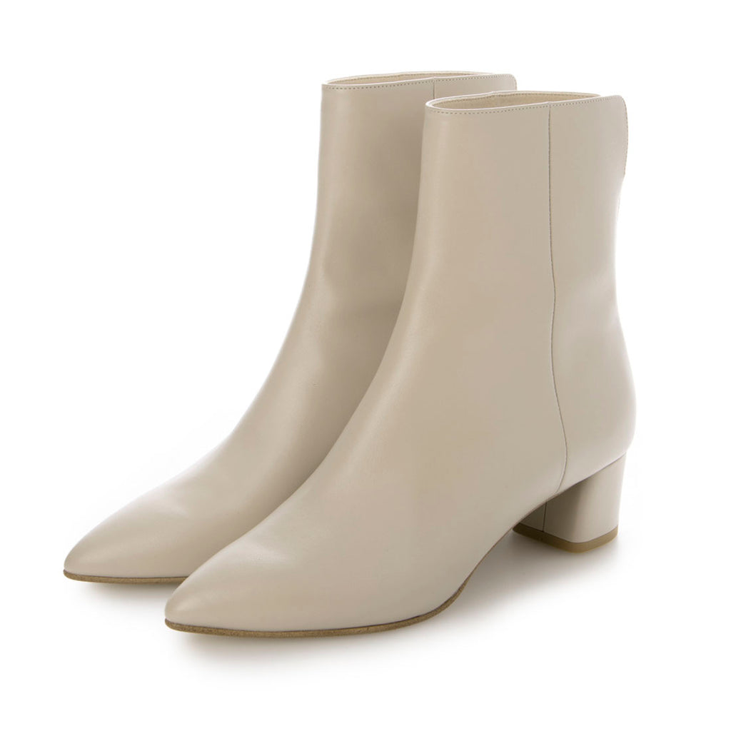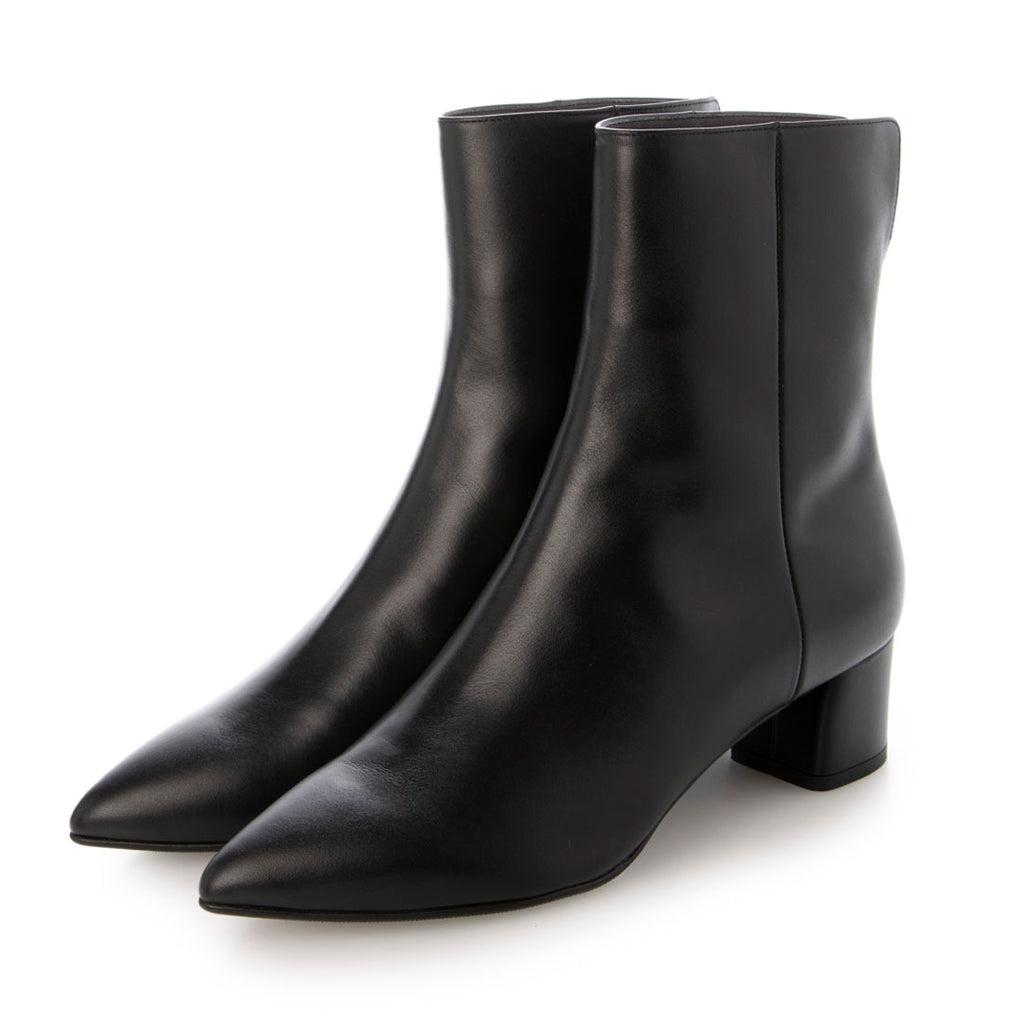 やや丸みを感じるポインテッドトウのシンプルプレーンなショートブーツ。