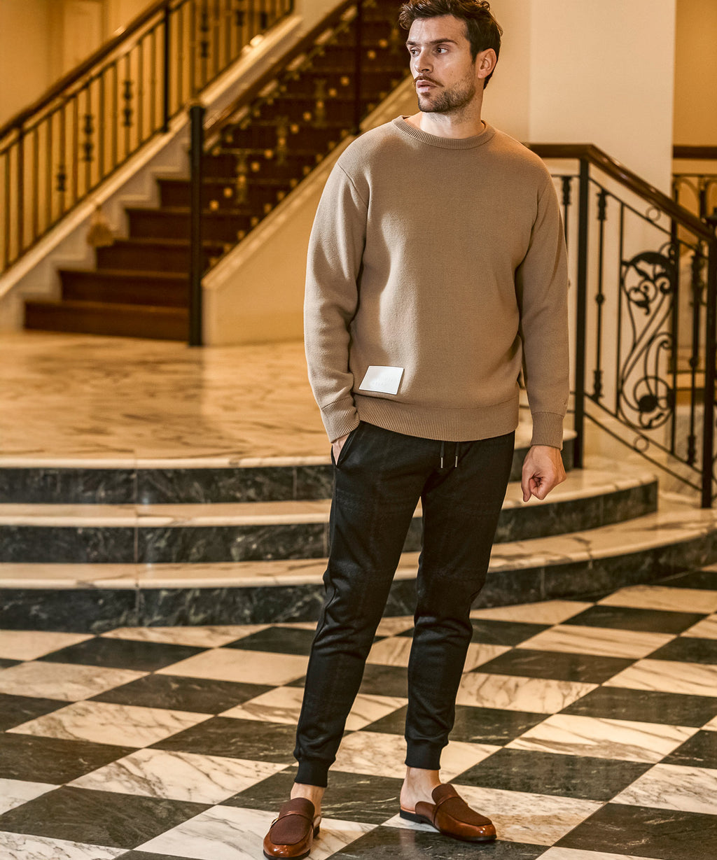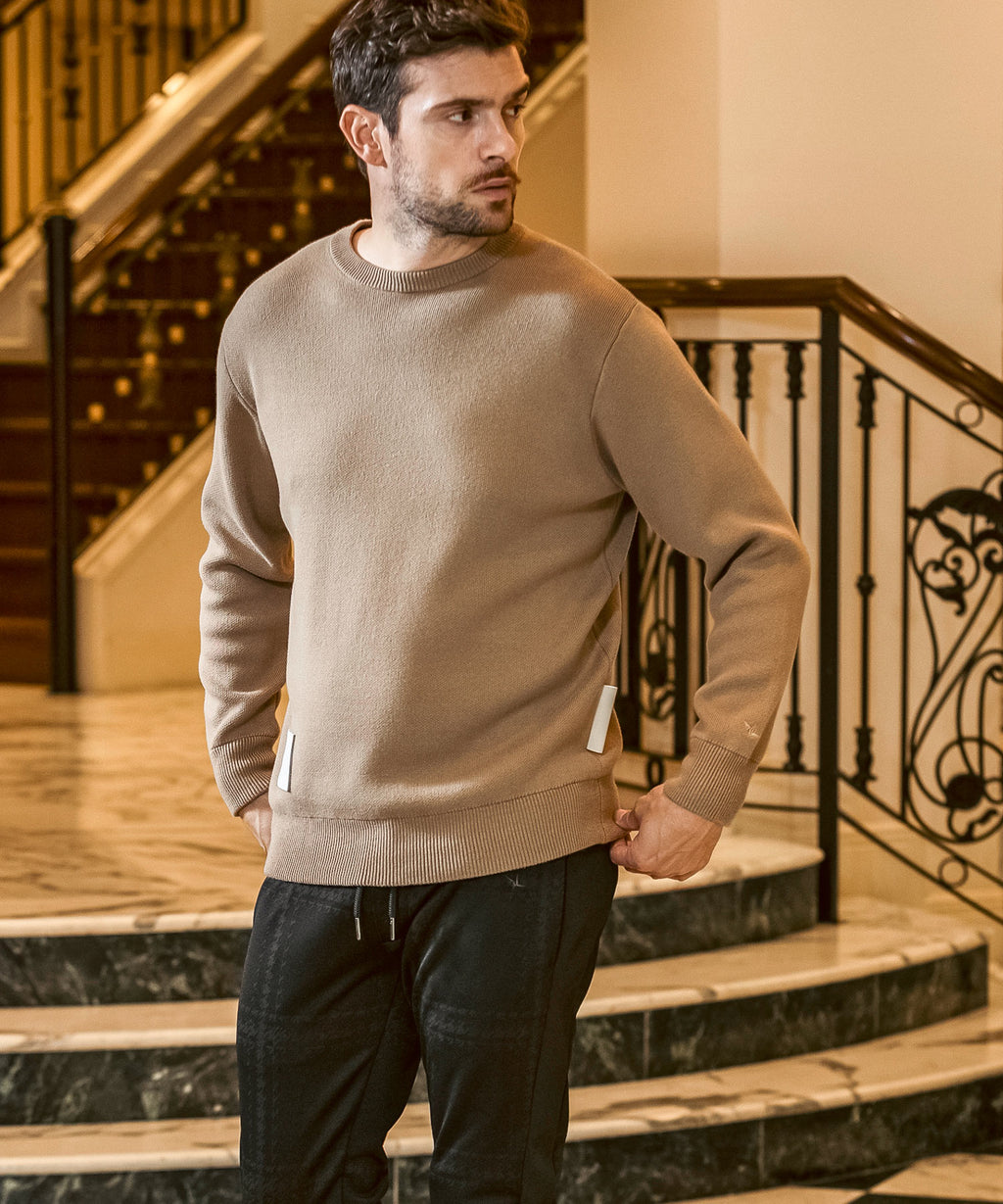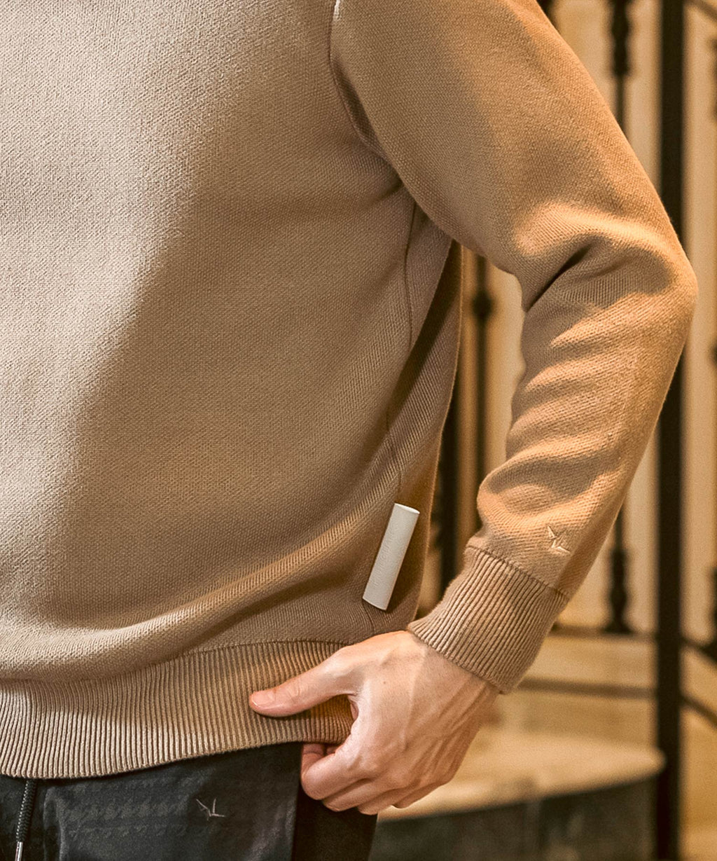 人造皮革上壓金箔,刻有品牌標誌的原創貼片,成為點綴的圓領針織衫。