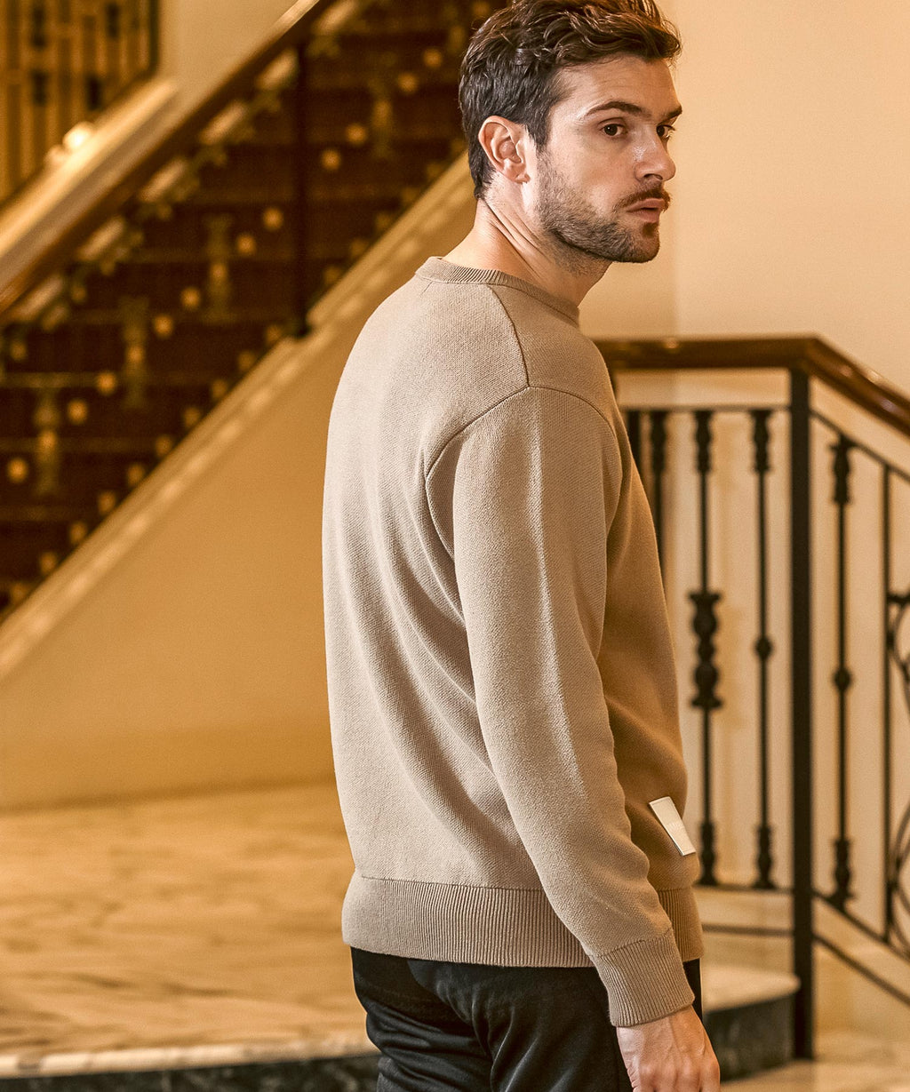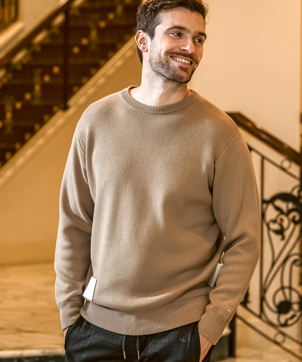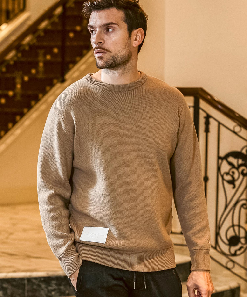 人造皮革上壓金箔,刻有品牌標誌的原創貼片,成為點綴的圓領針織衫。