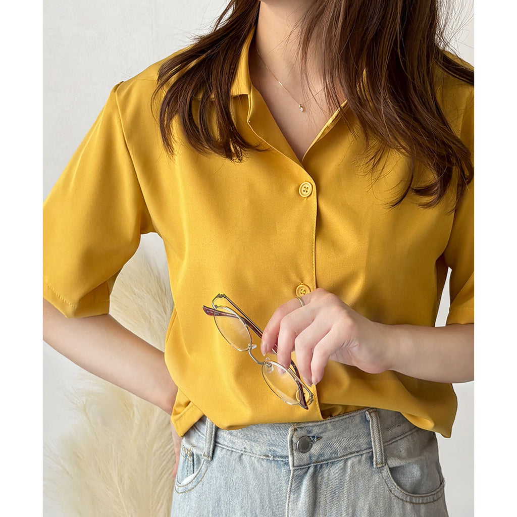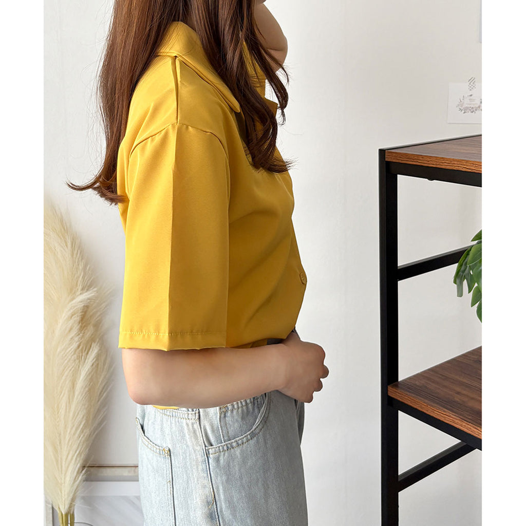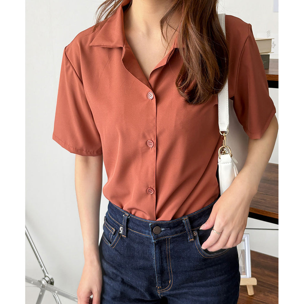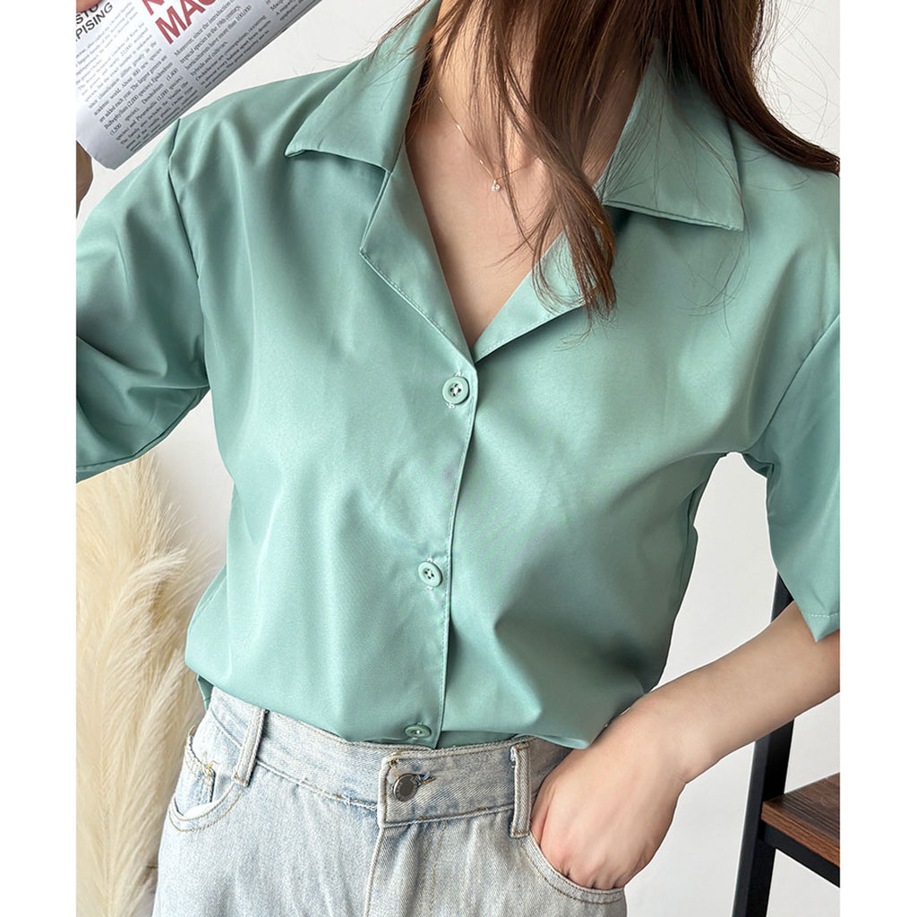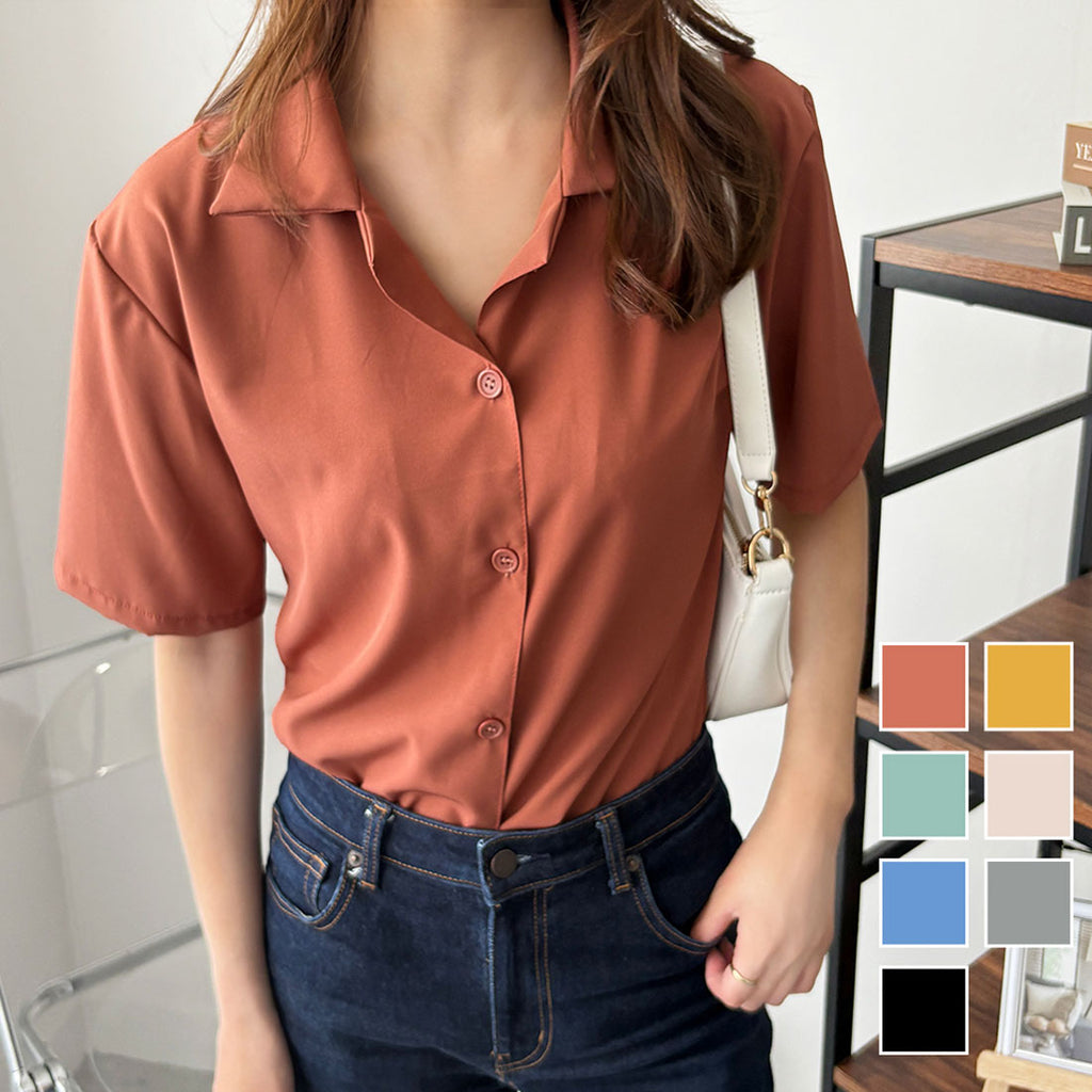 德威莉 Dewlily 開襟顏色短袖襯衫 女士 韓國 春夏 簡約 休閒 上衣 無圖案 時尚 成人 可愛 外出 上衣 涼爽 舒適