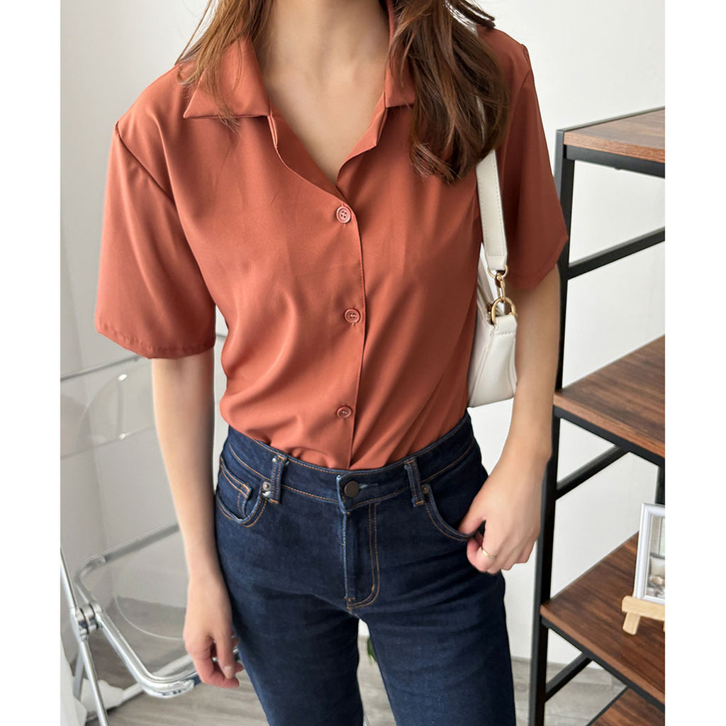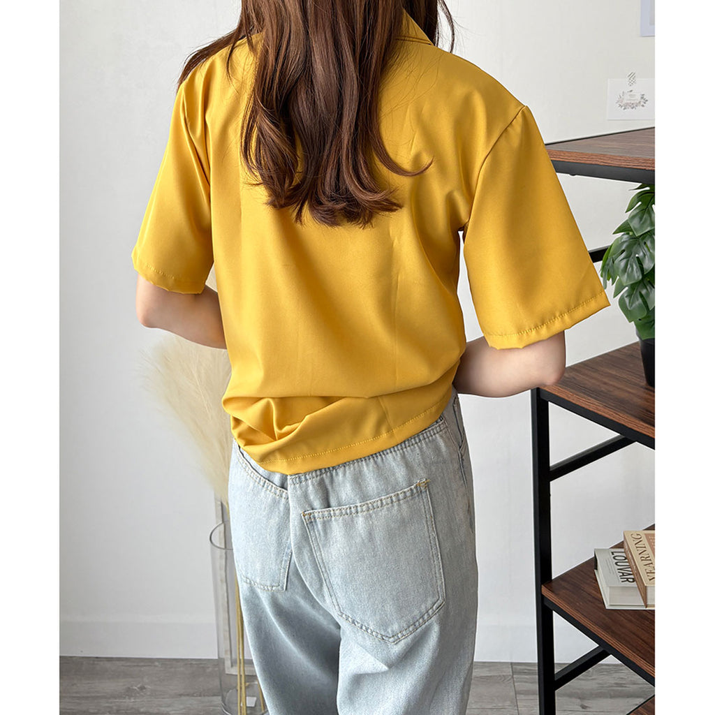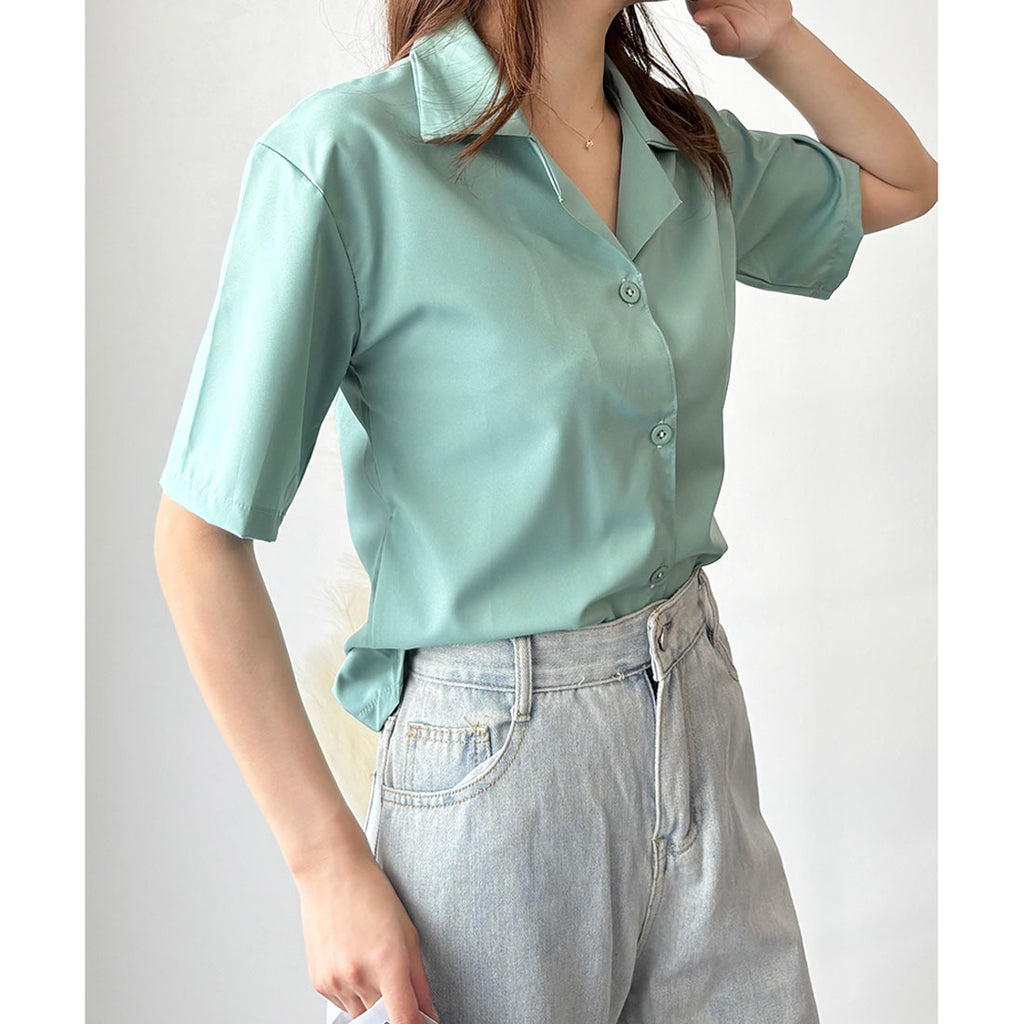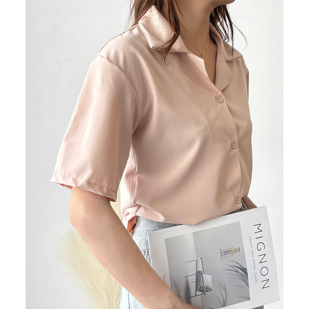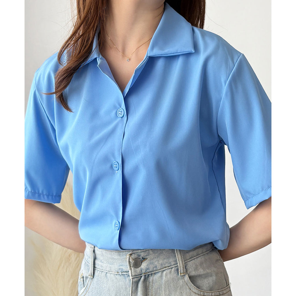 德威莉 Dewlily 開襟顏色短袖襯衫 女士 韓國 春夏 簡約 休閒 上衣 無圖案 時尚 成人 可愛 外出 上衣 涼爽 舒適